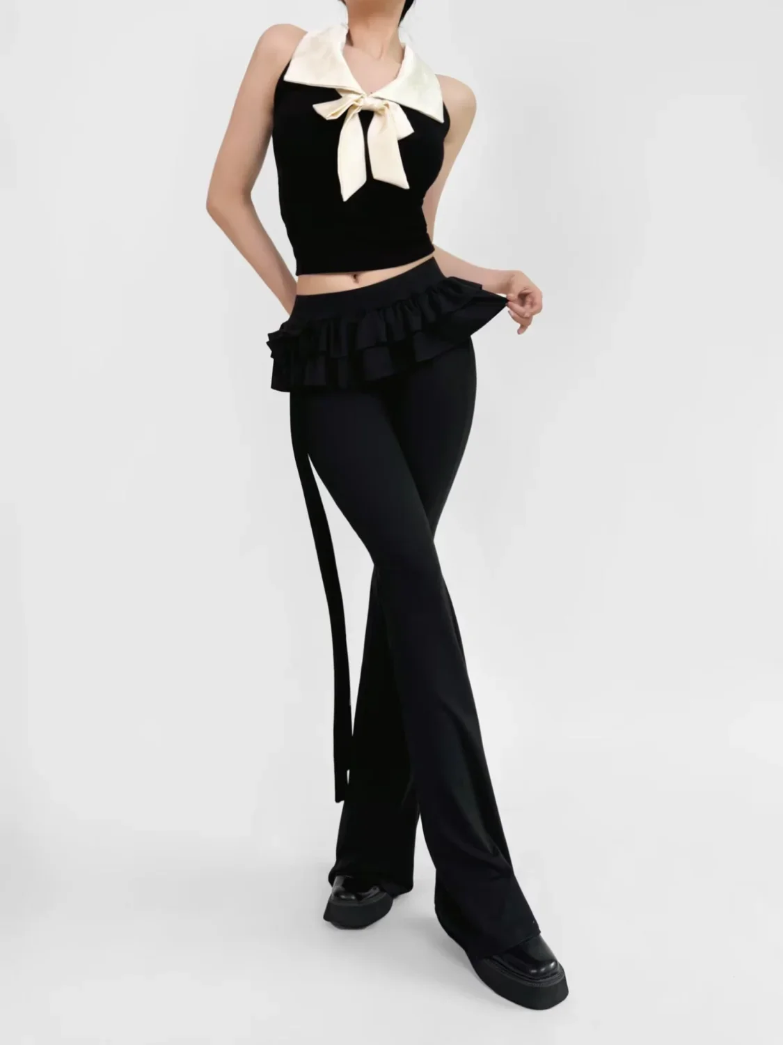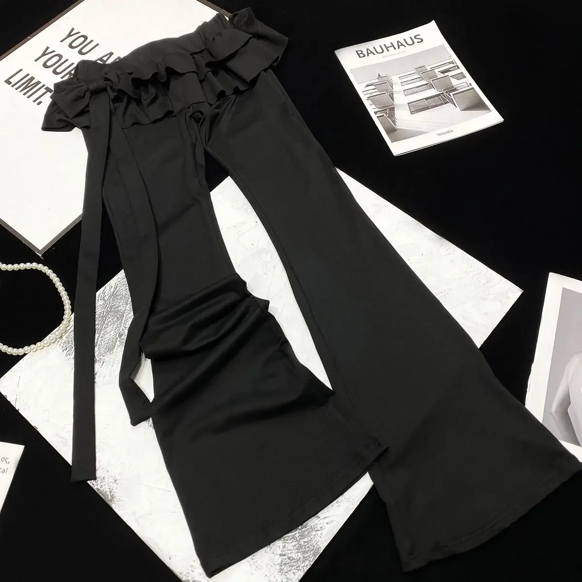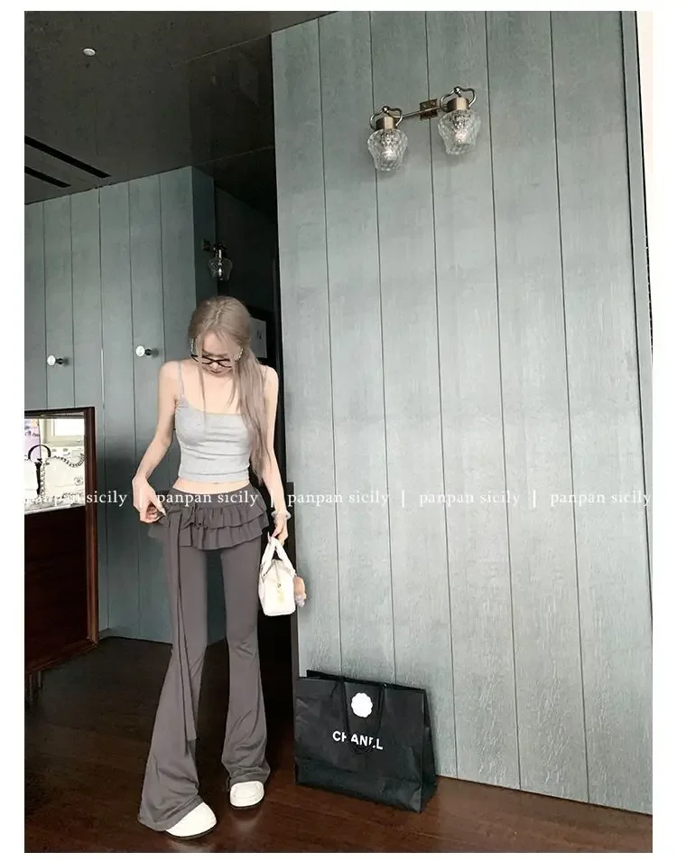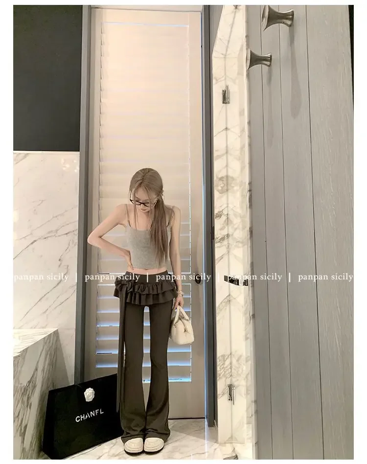 Deeptown Y2k Bow Ruffles Pantaloni a zampa d’elefante Donna Sexy Vita bassa Slim Casual Gonne Pantaloni Autunno Inverno Street Coquette Pantalones