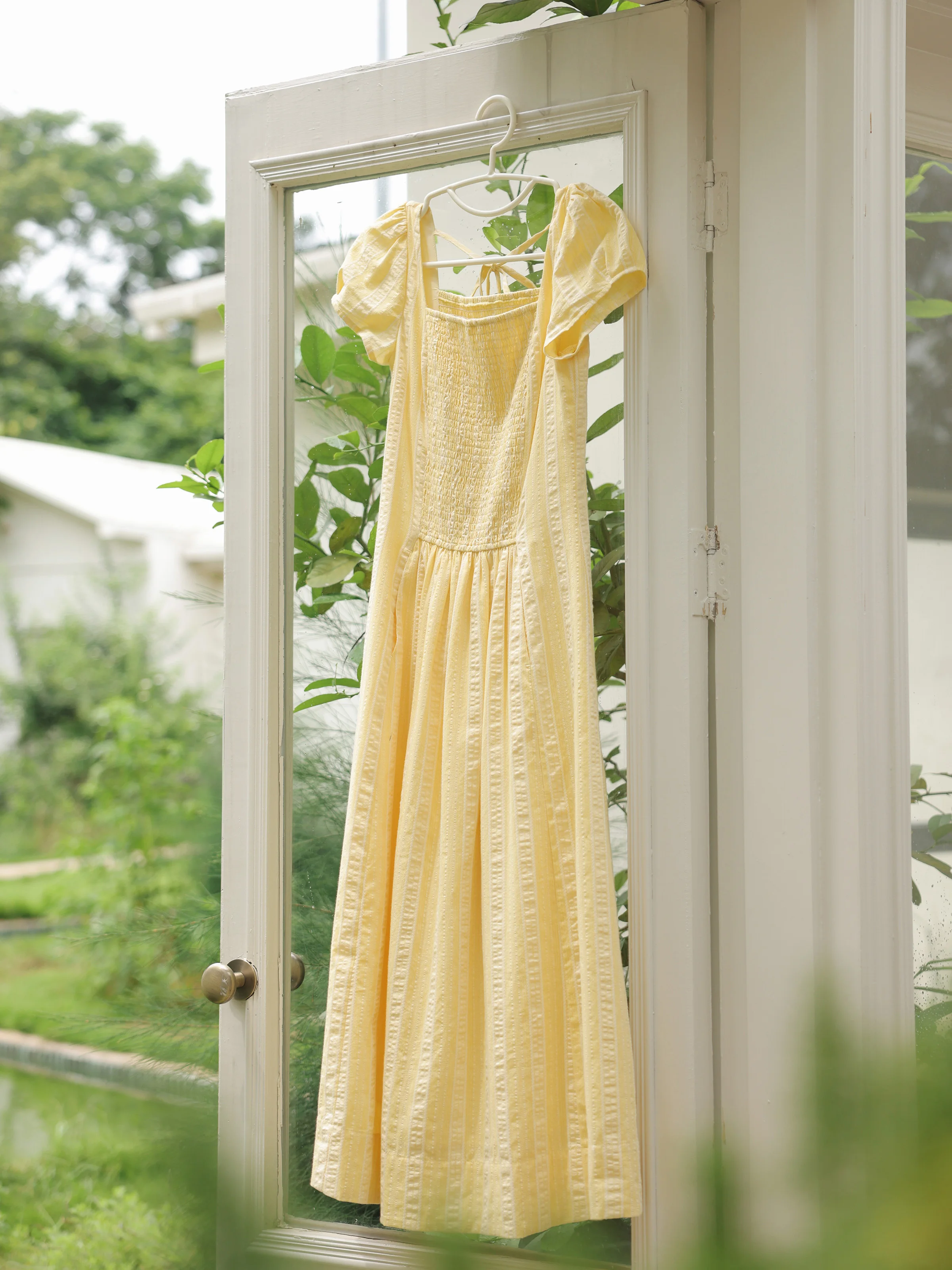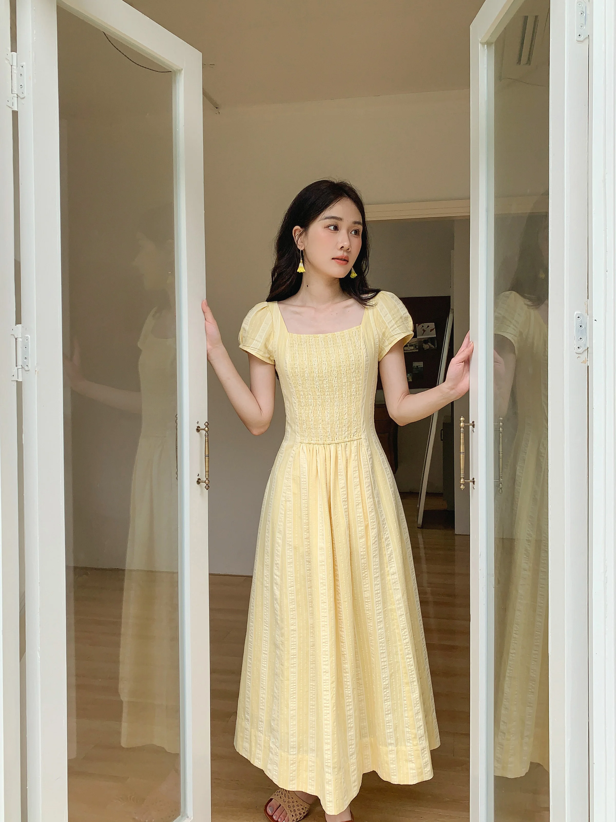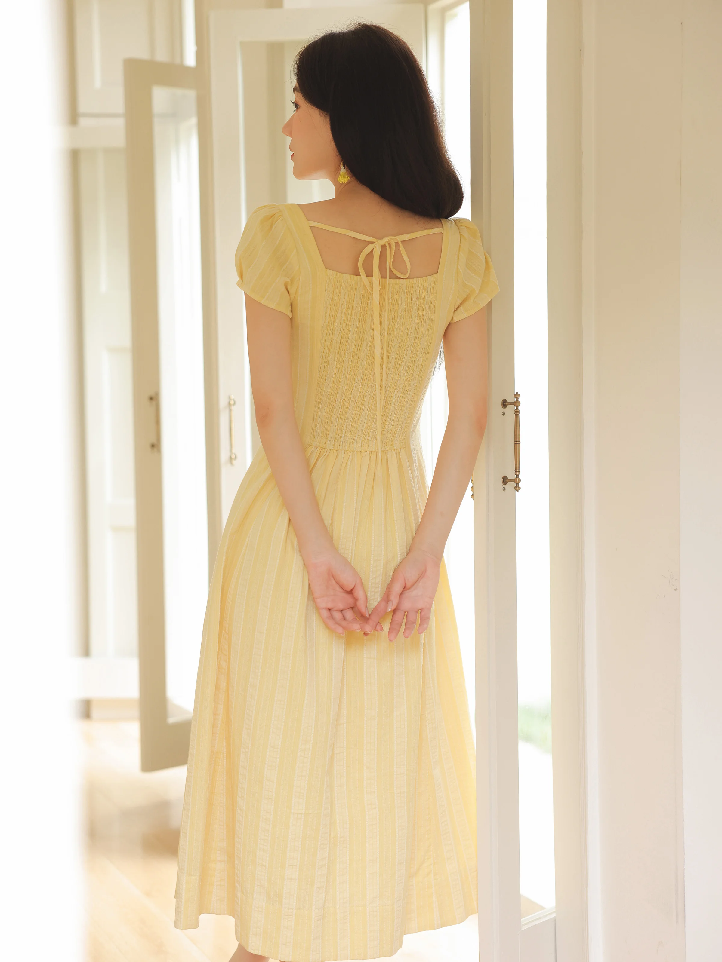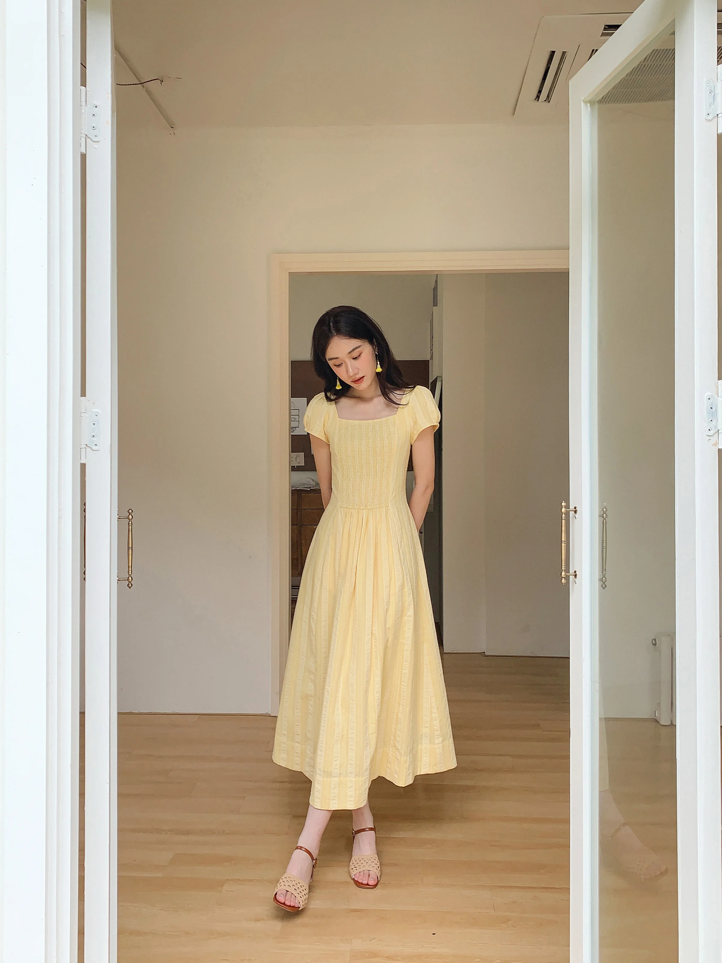 Luminoso e allegro: questo vestito giallo con maniche a sbuffo è perfetto per una giornata soleggiata e dona un’atmosfera leggera e ventilata al tuo look.
