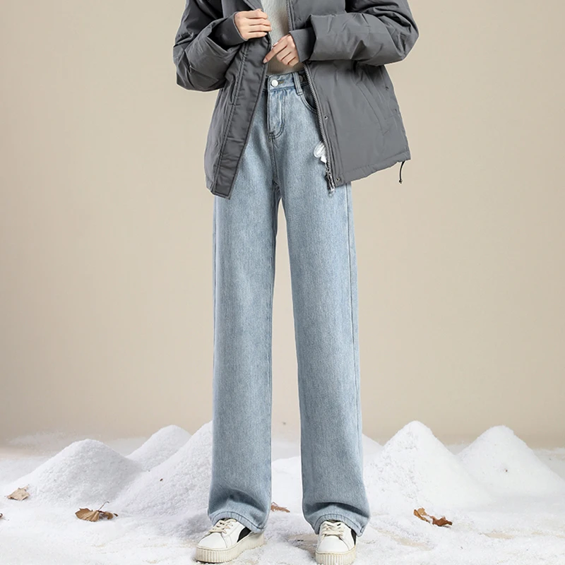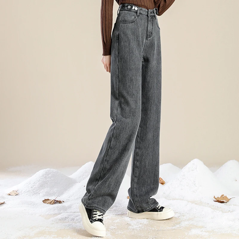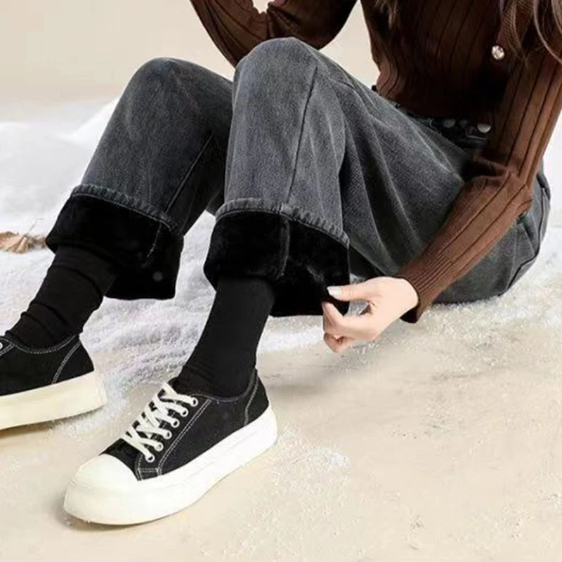 Donna Vita alta Streetwear Jeans addensati Pantaloni larghi moda femminile Lady Nero Grigio Azzurro Blu Punk Pantaloni in denim termico