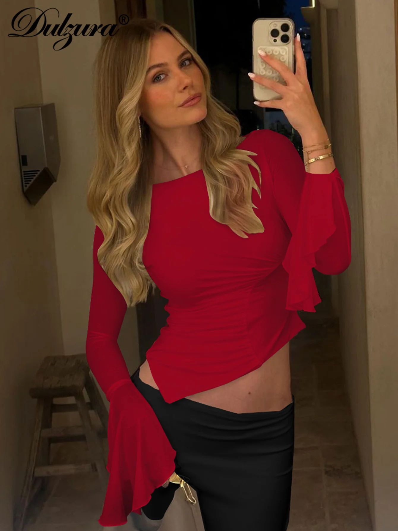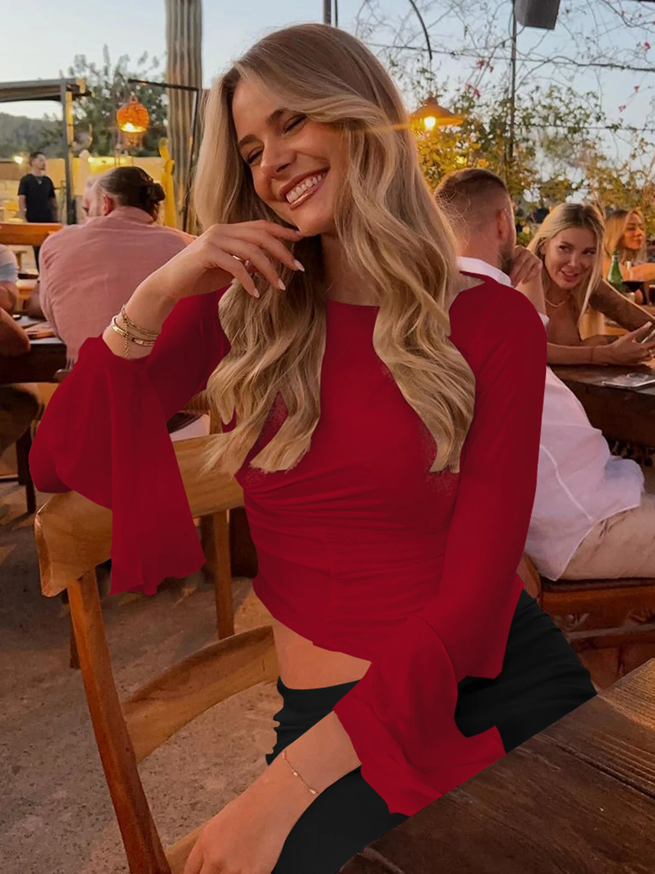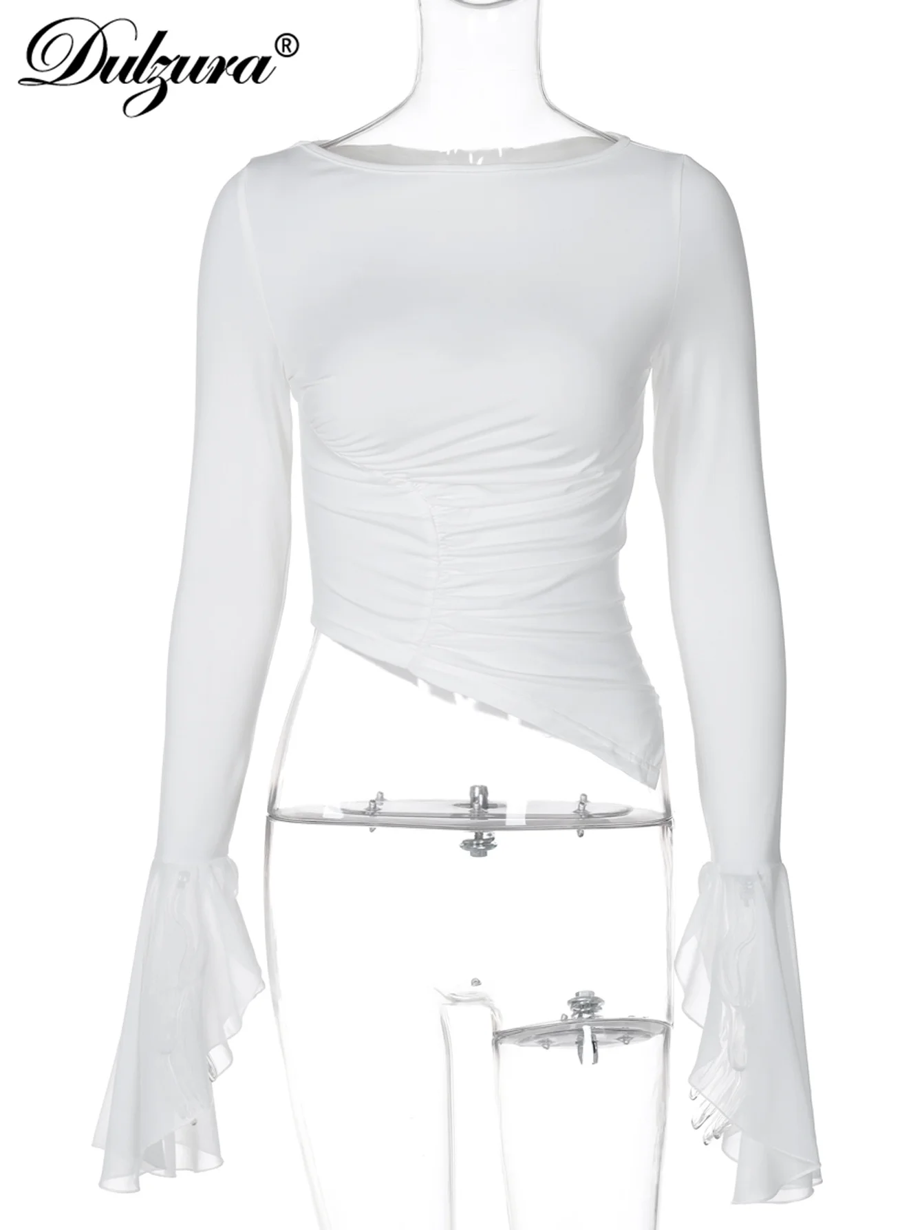 Dulzura maniche lunghe svasate increspato patchwork crop t-shirt solido sexy casual top party club streetwear abiti primaverili estivi
