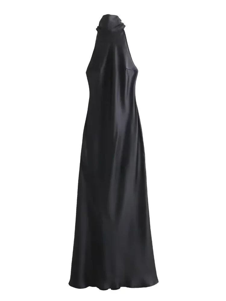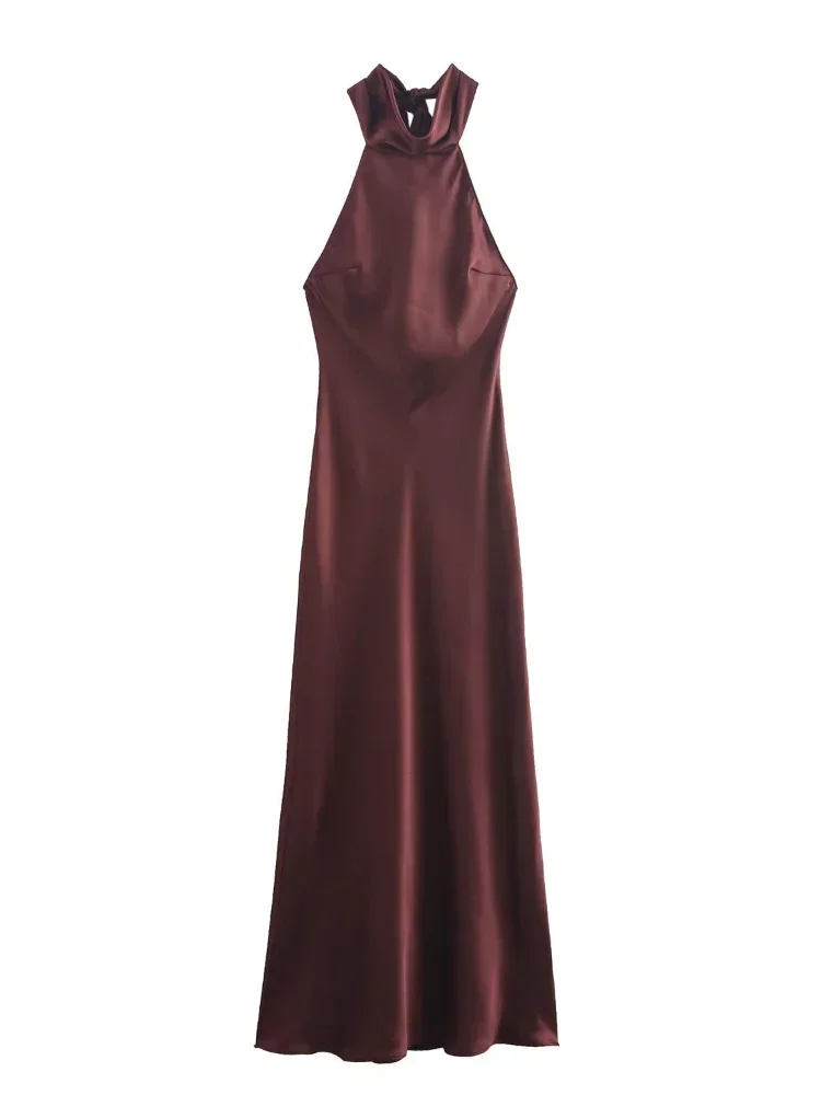 Recensisci per primo “Elegante abito lungo con lacci in raso marrone con scollo all’americana Abiti aderenti senza maniche senza spalline sexy con spalle scoperte Autunno New Lady Party Robe”