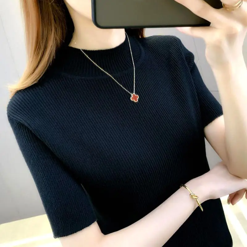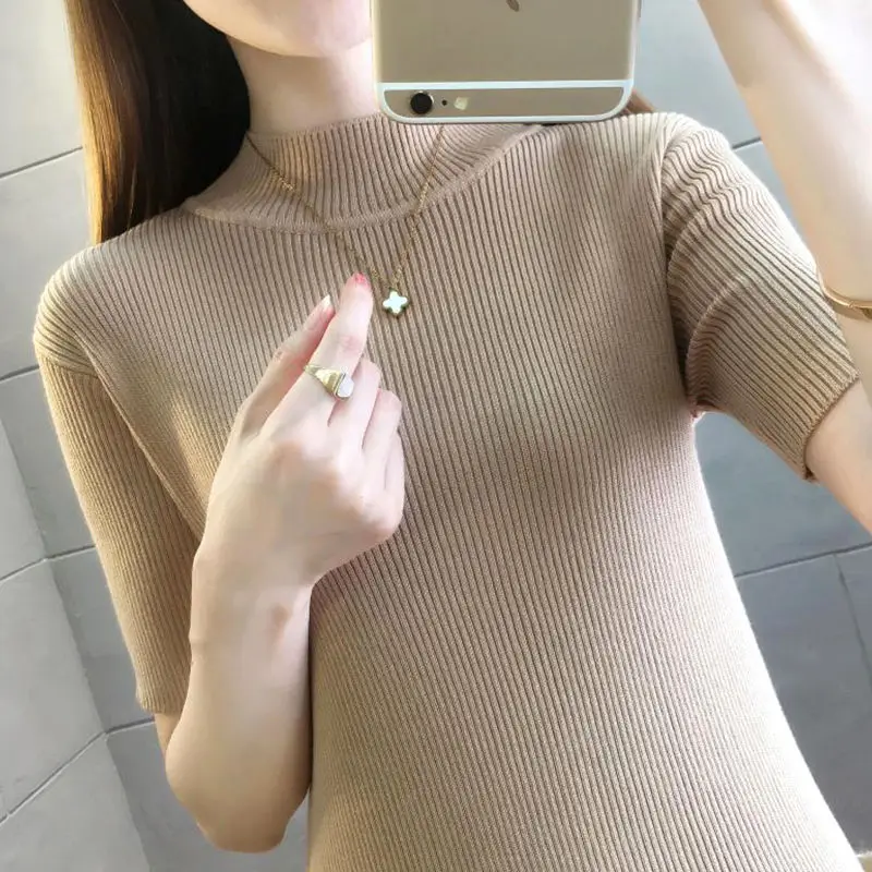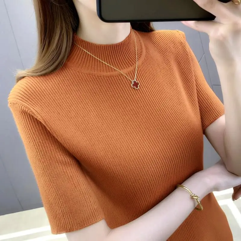 Elegante moda Harajuku Slim Fit abbigliamento femminile Casual tutto abbinato t-shirt solido dolcevita stile sottile maglioni manica corta