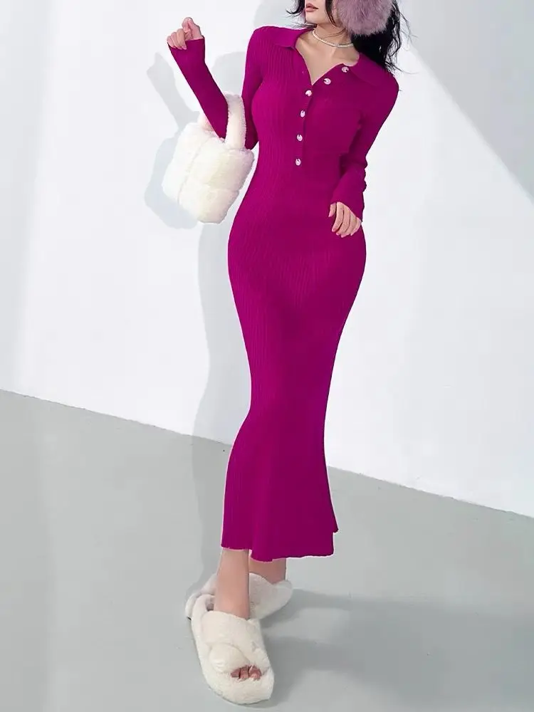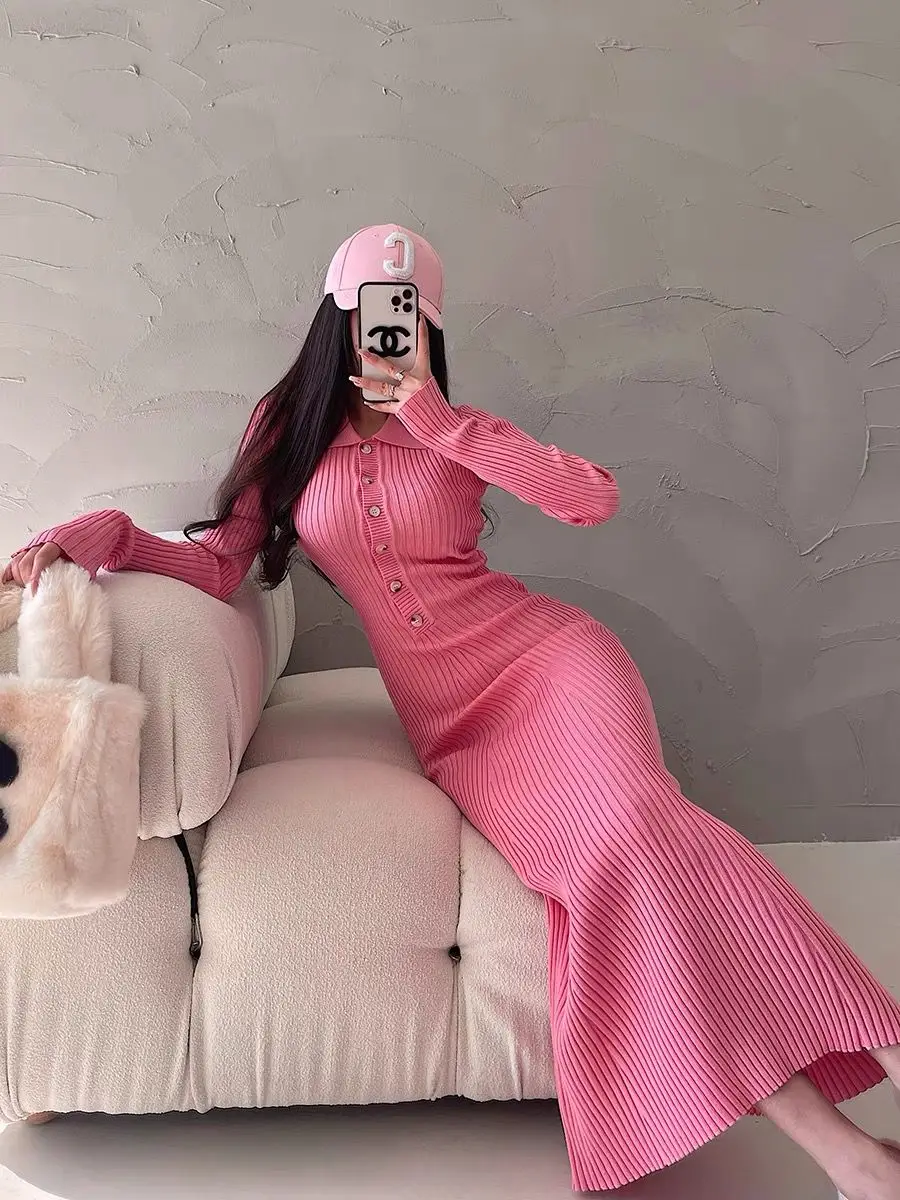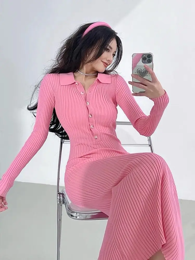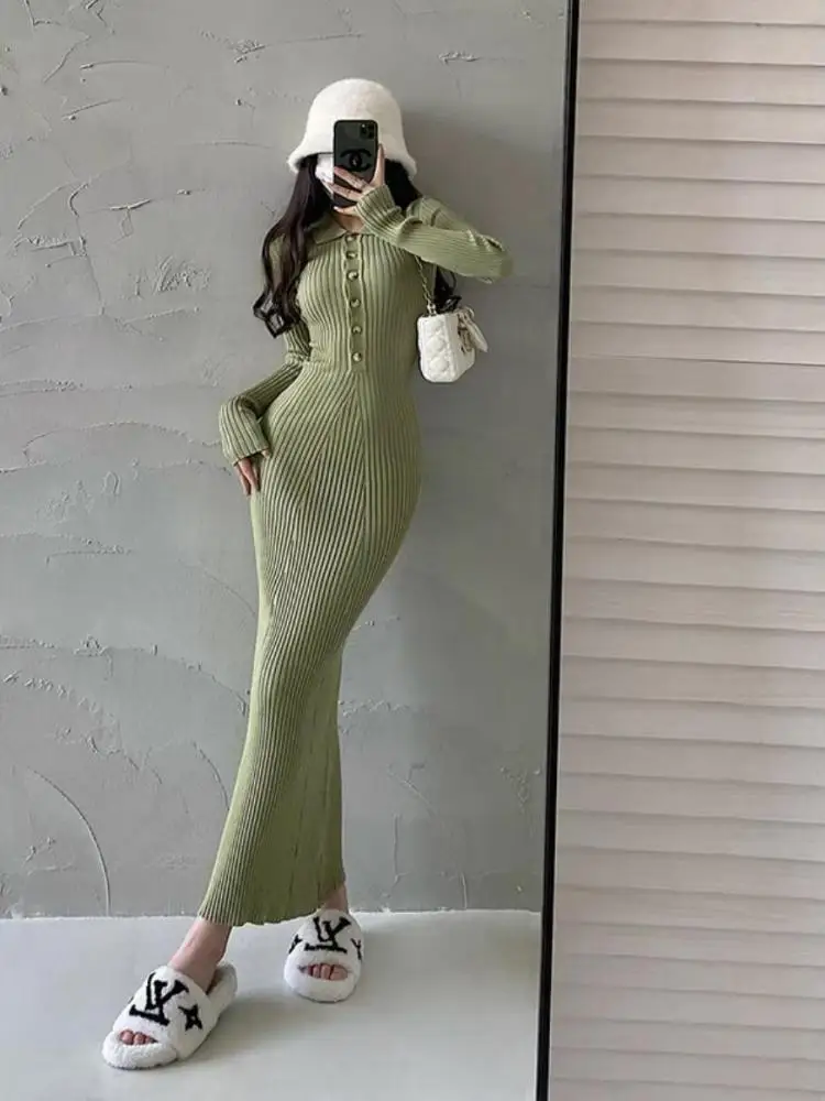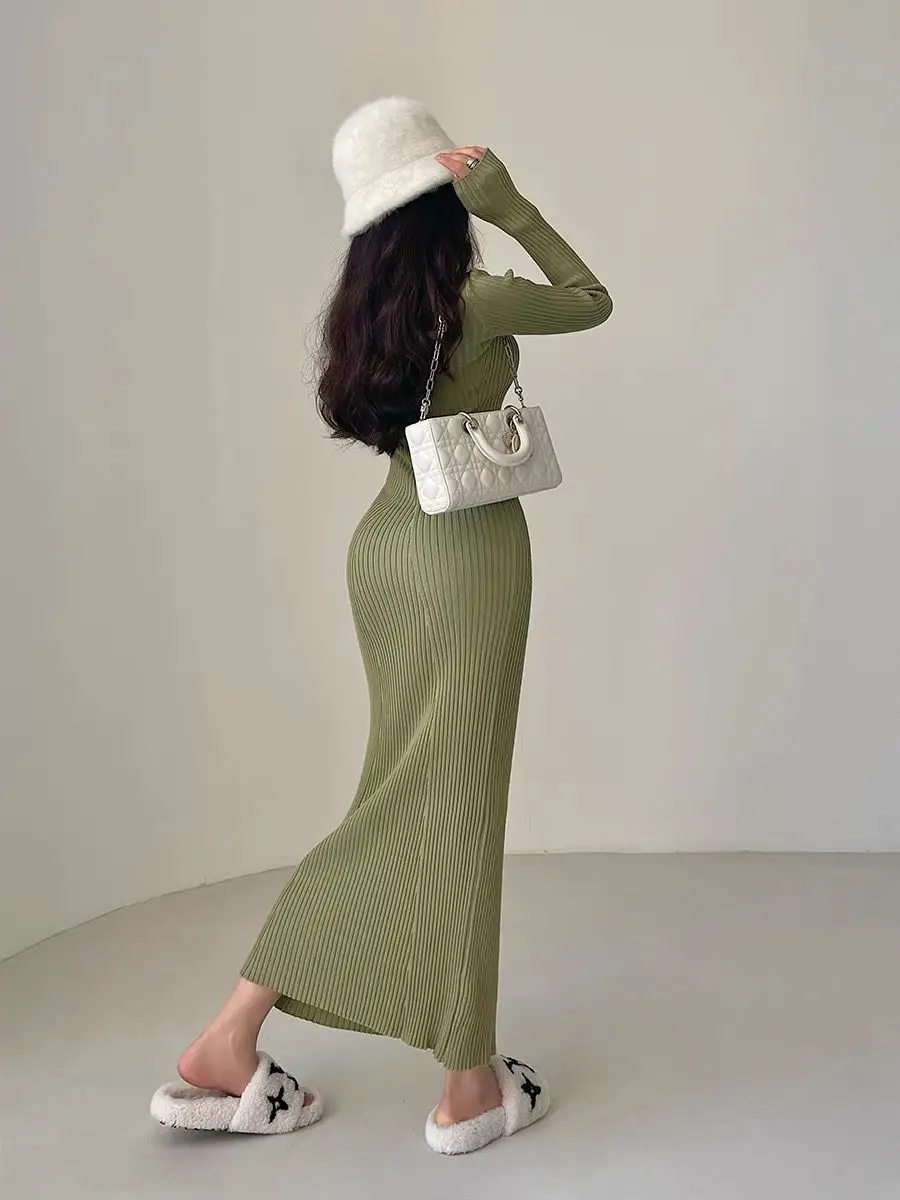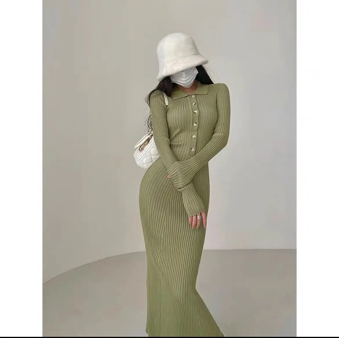Eleganti abiti da festa per le donne 2023 abito autunno inverno elastico a maniche lunghe Slim Vintage Basic Knit Dress Y2k
