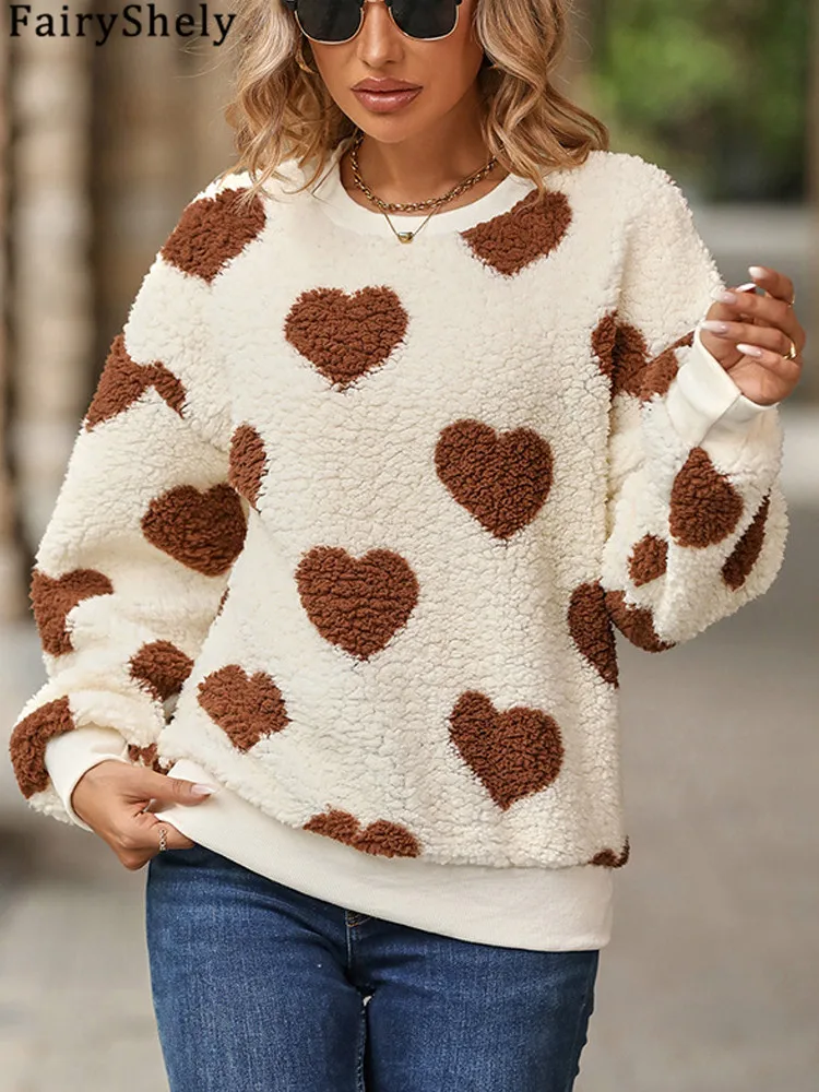 Fairyshely 2025 Inverno Love Print Felpe con cappuccio larghe da donna Felpa con stampa a maniche lunghe Allentato Casual Autunno Lady Felpa con cappuccio in peluche Top