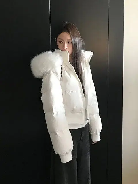 Giacca corta con cappuccio con cerniera bianca con collo in pelliccia semplice da strada alla moda da donna 2025 Giacca casual calda ispessita invernale più velluto