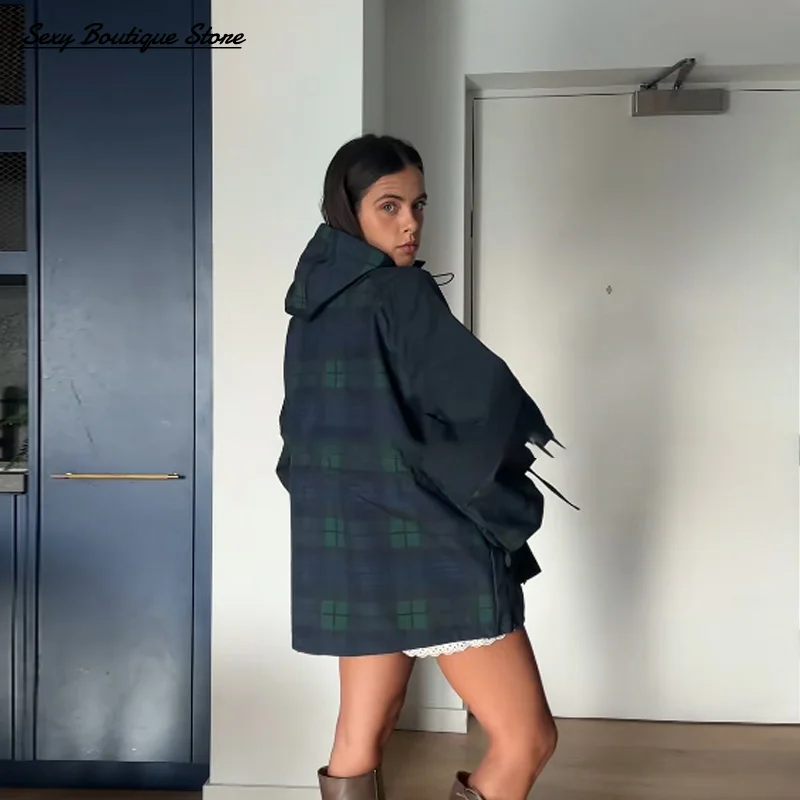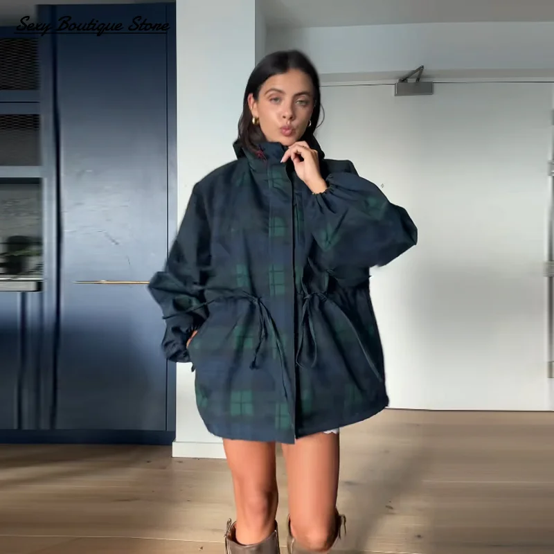 4 recensioni per Giacca da donna allentata con griglia vintage Cappotto con colletto allentato oversize con cappuccio a maniche lunghe Capispalla con lacci 2025 New Lady Streetwears