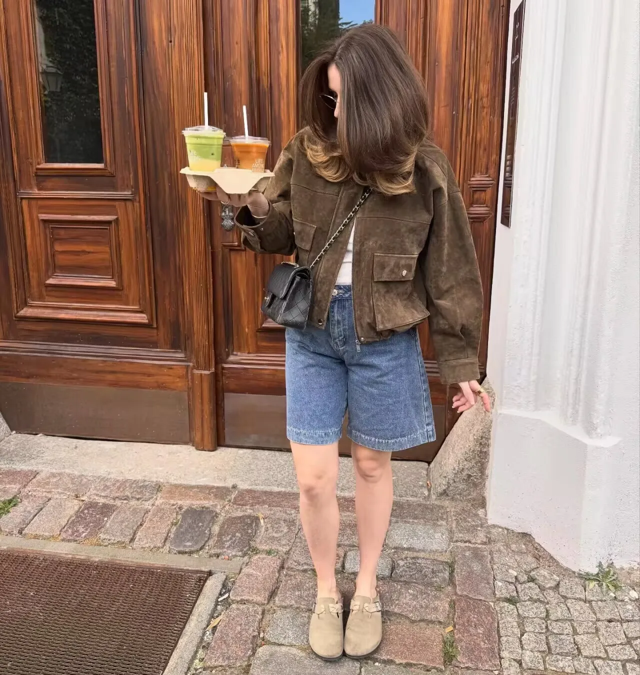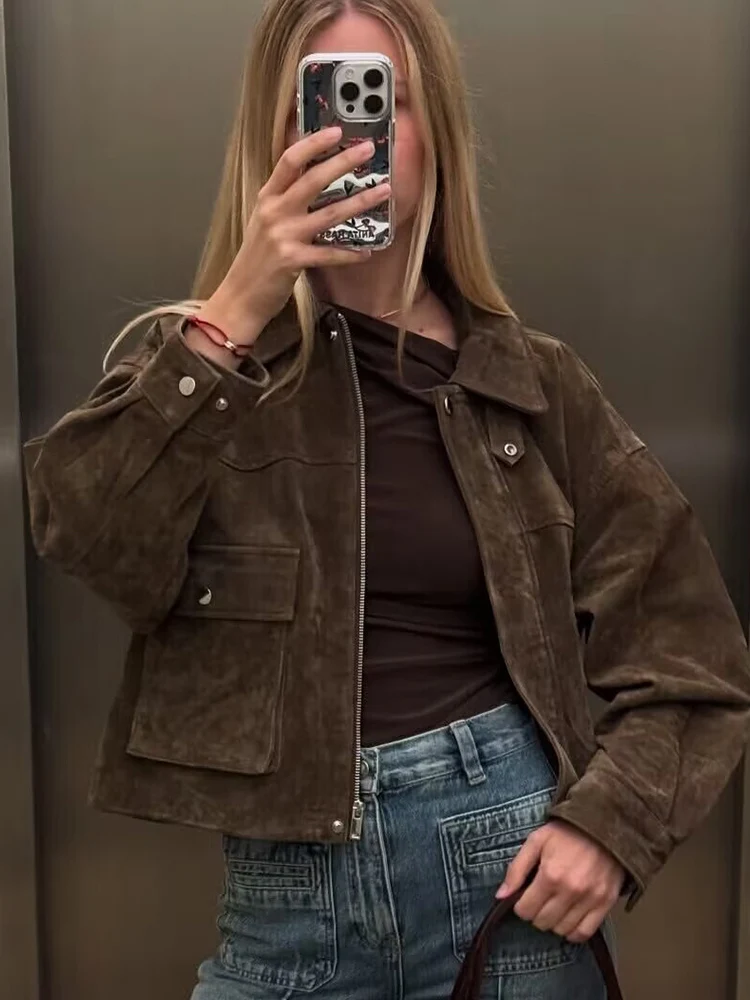 Giacca in pelle scamosciata da donna 2025 Nuove donne Moda manica lunga con cerniera Giacche in pelle scamosciata Donna Autunno Inverno High Street Cappotti corti