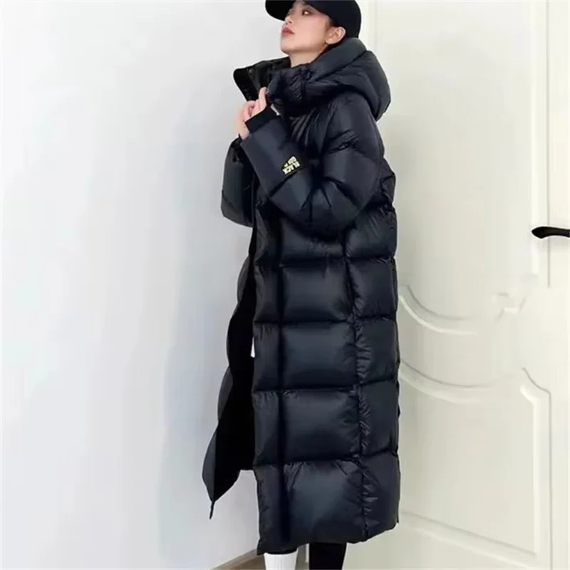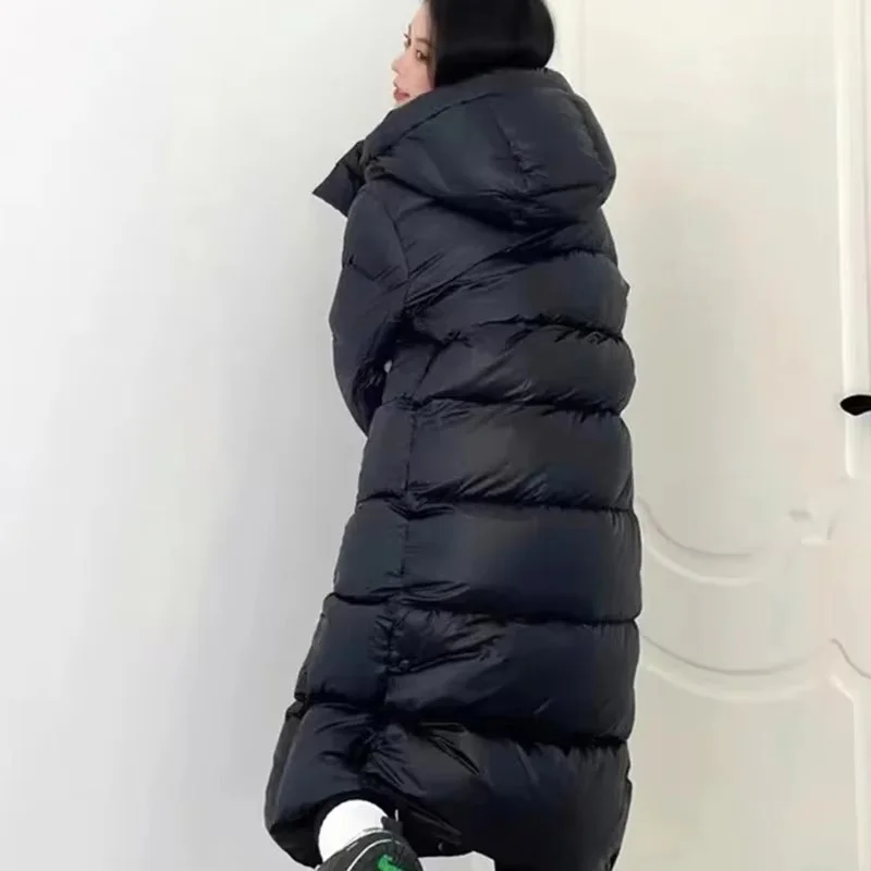 Giacca invernale imbottita in cotone sciolto da donna Cappotto lungo sopra il ginocchio da donna coreano imbottito in cotone caldo nero con cappuccio femminile