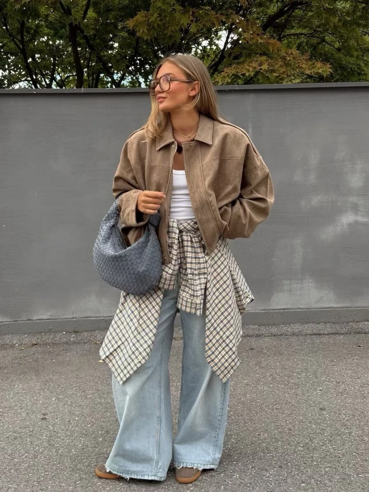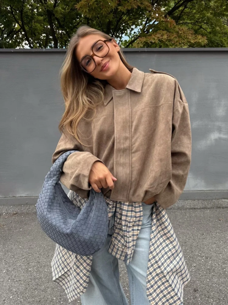 Giacca invernale in pelle scamosciata allentata kaki moda donna casual colletto rovesciato zip-up cappotto spesso 2025 nuove donne capispalla streetwear