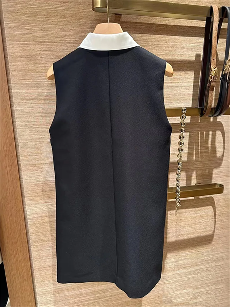 Giunzioni Colletto rovesciato Mini abito da donna Bottoni pieghettati Senza maniche A-Line Abito corto 2025 Autunno Nuovo