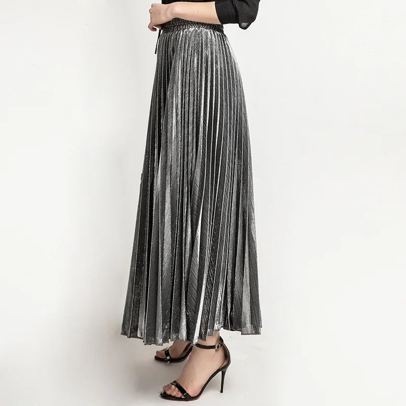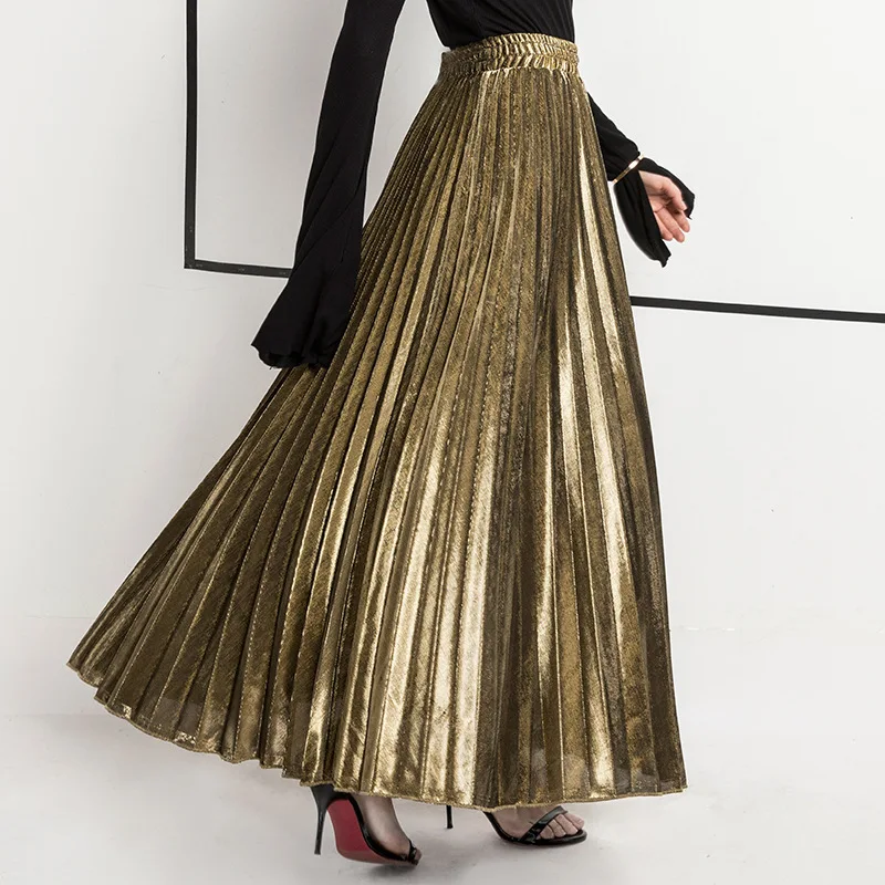Gonna lunga a pieghe metallizzata primaverile a vita alta Harajuku Gonne lunghe dorate con altalena grande per donna Taglie forti XXL Saia