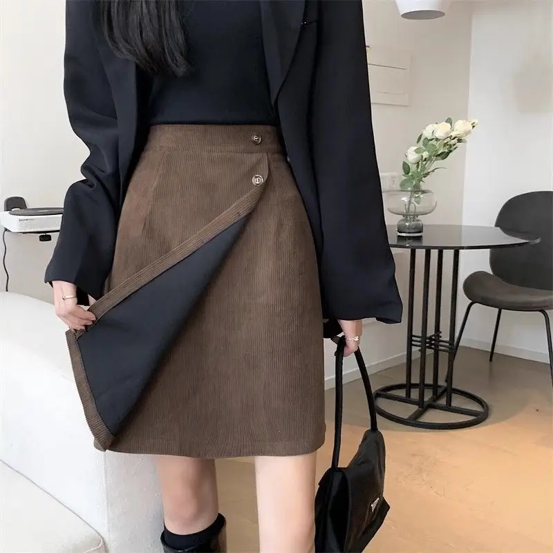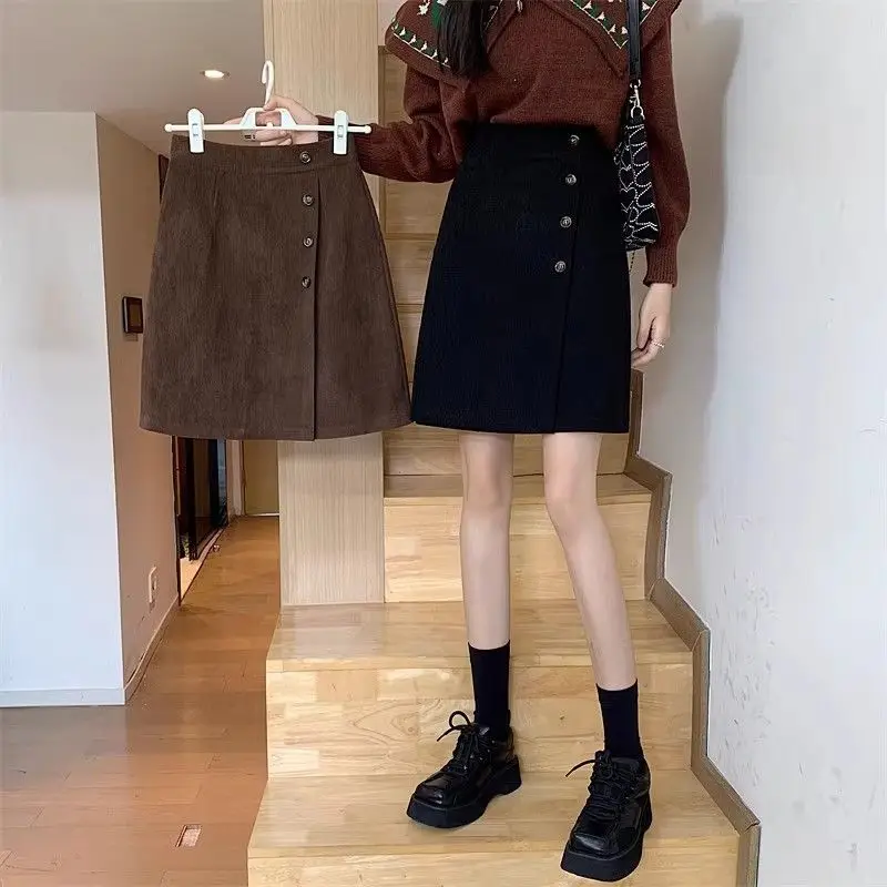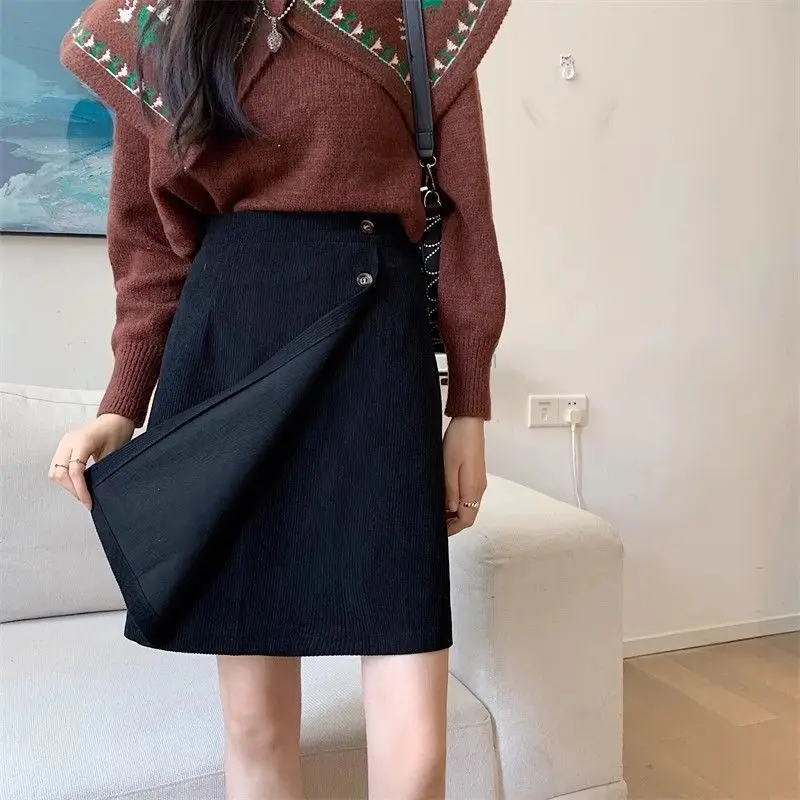 Gonna a trapezio vintage in velluto a coste con cerniera a vita alta Autunno Inverno Slim Solid All-match Mezza gonna coreana Tendenza Moda Abbigliamento donna