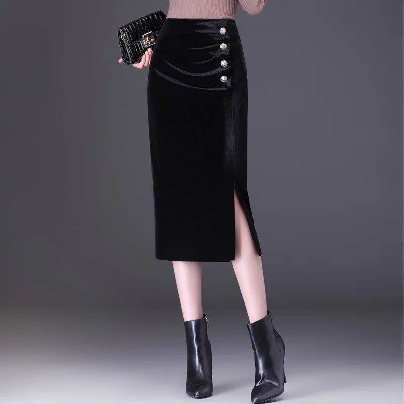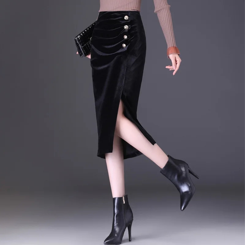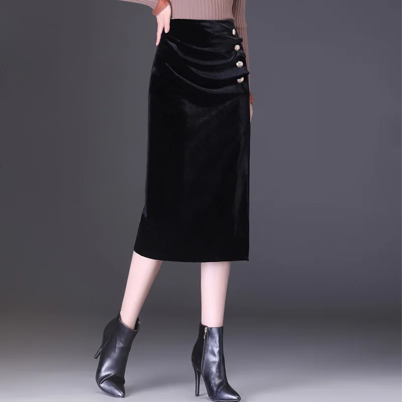 Recensisci per primo “Gonna avvolgente di media lunghezza in velluto dorato per donna con spacco laterale Elegante tessuto in poliestere stile pendolare d’affari aderente”