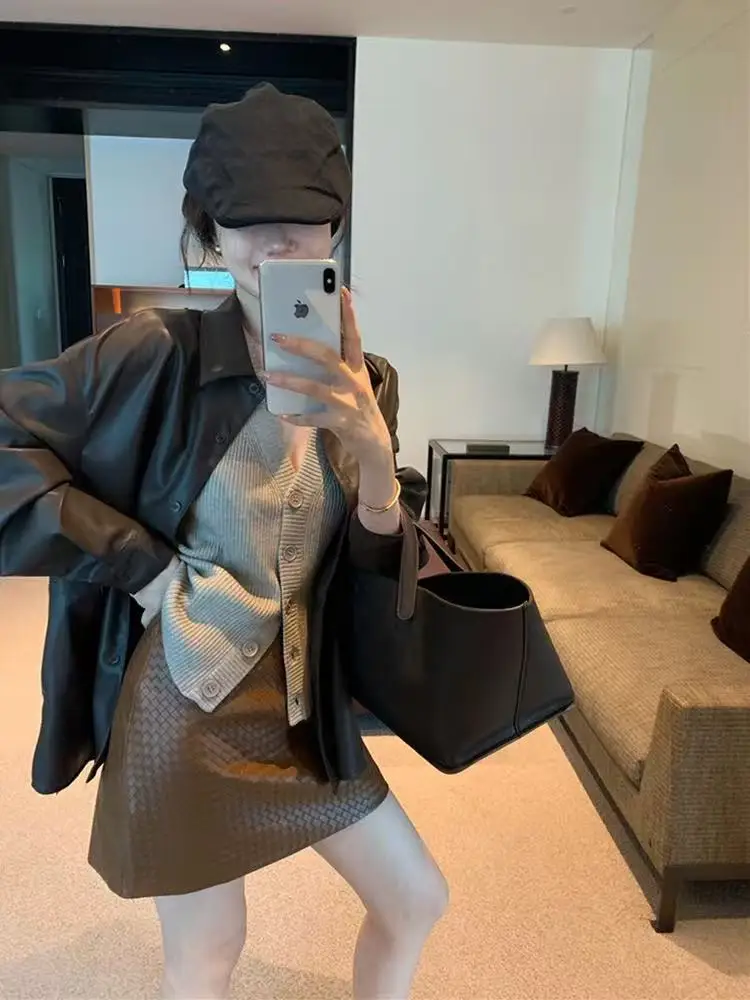 Recensisci per primo “Gonna in pelle lavorata a maglia per le donne Primavera Nuova pelle di pecora genuina di fascia alta Semplice versatile A-line corta Jupe Mujer Tessuto a mano Saias”
