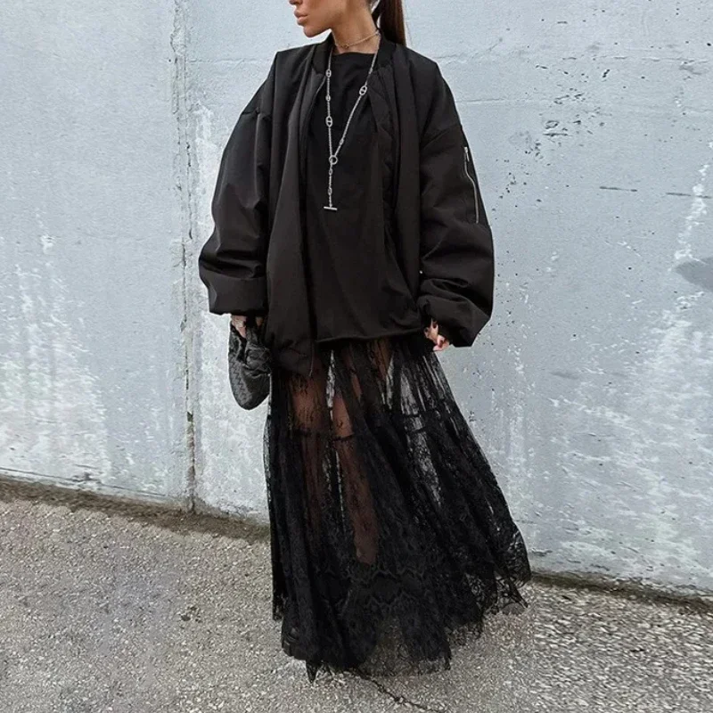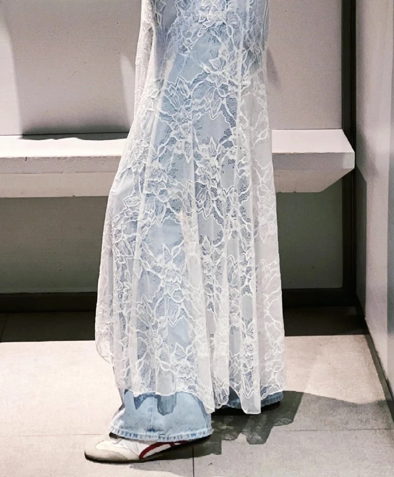 Gonna lunga svasata sexy a vita alta Y2K Gonna lunga in pizzo nero per donna 2025 Primavera Estate Solid Beach Party Evening Elegante