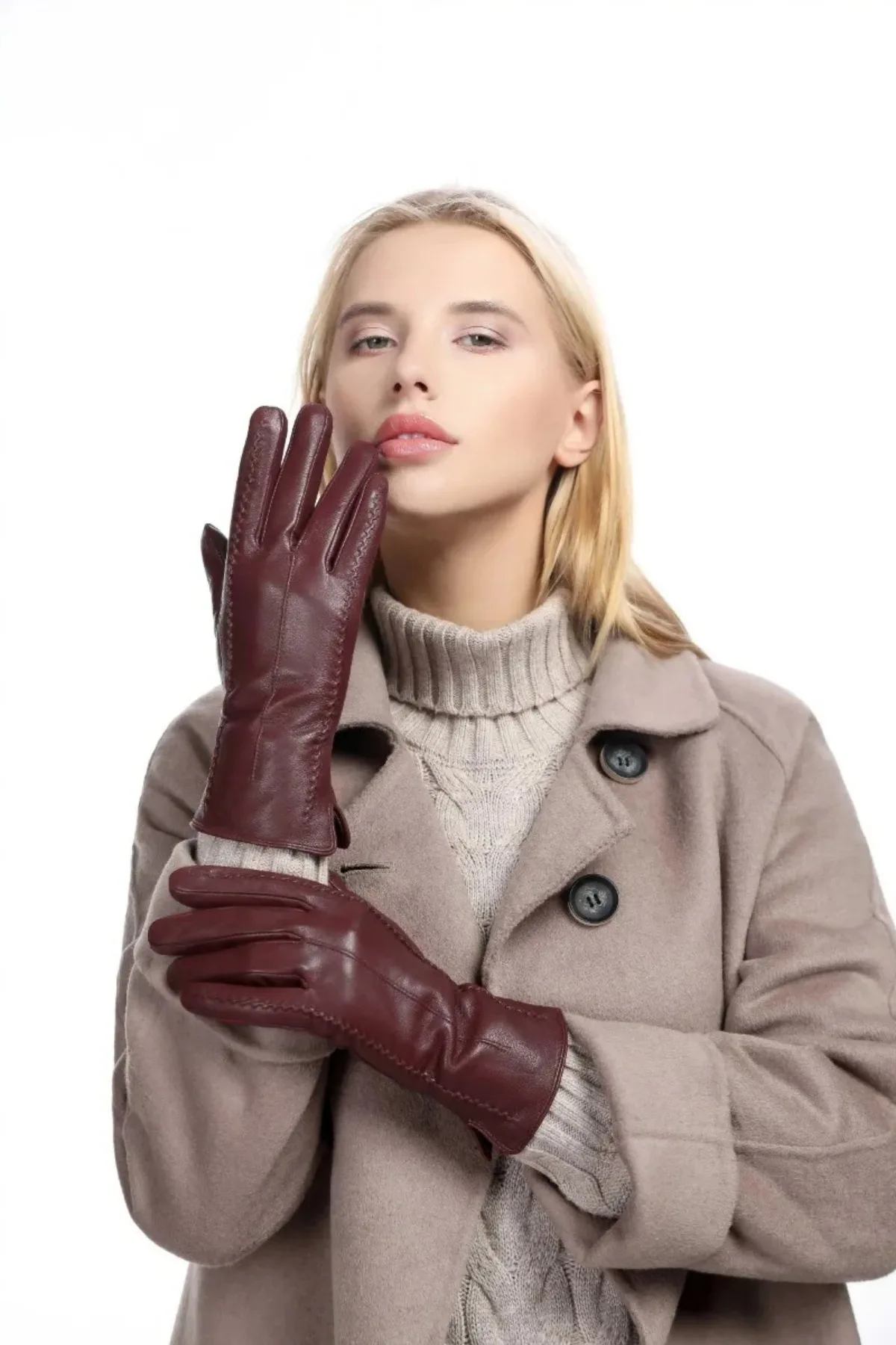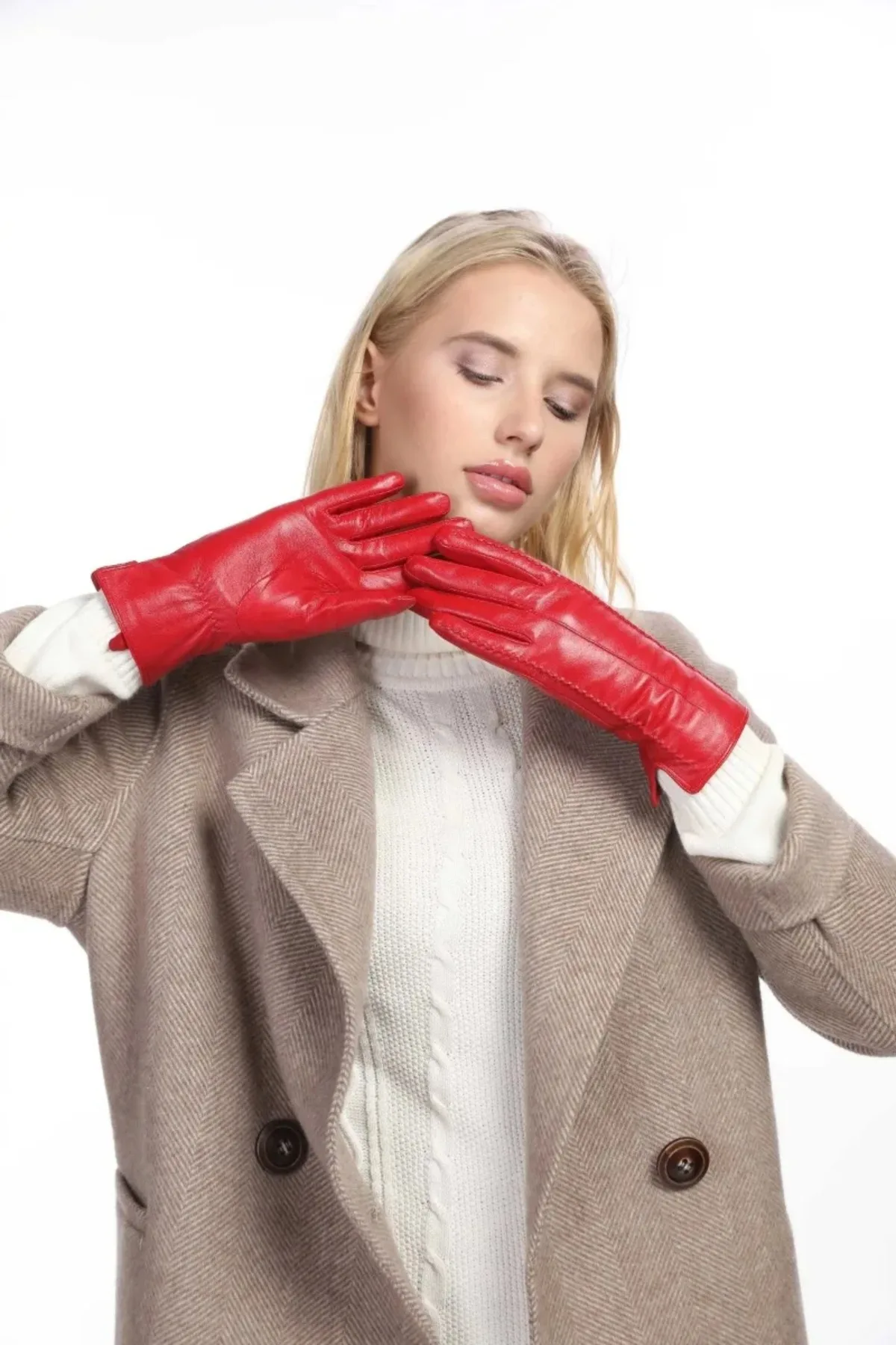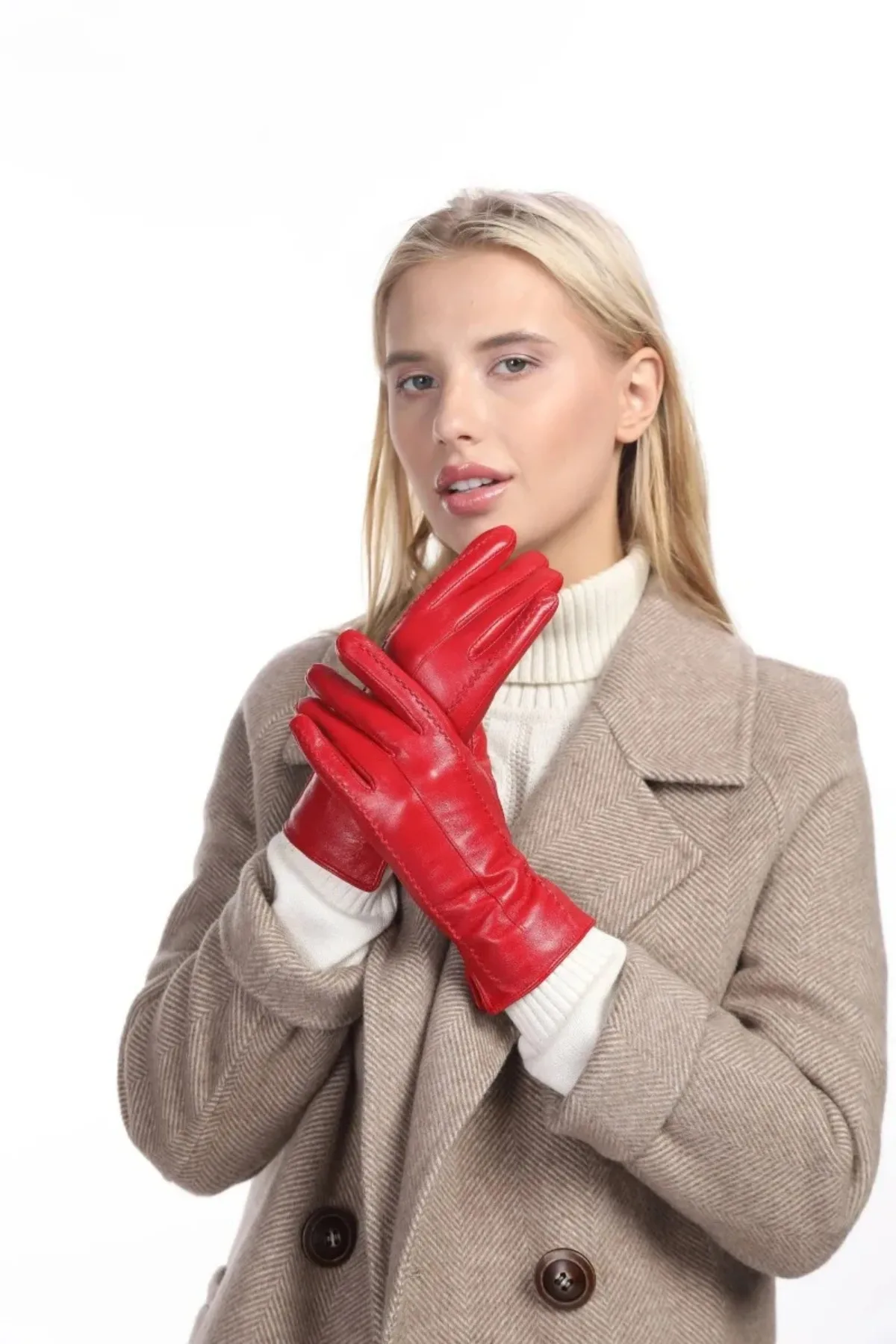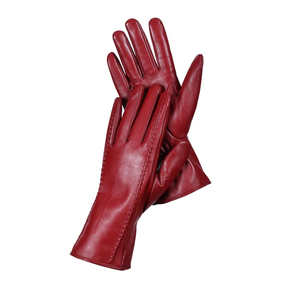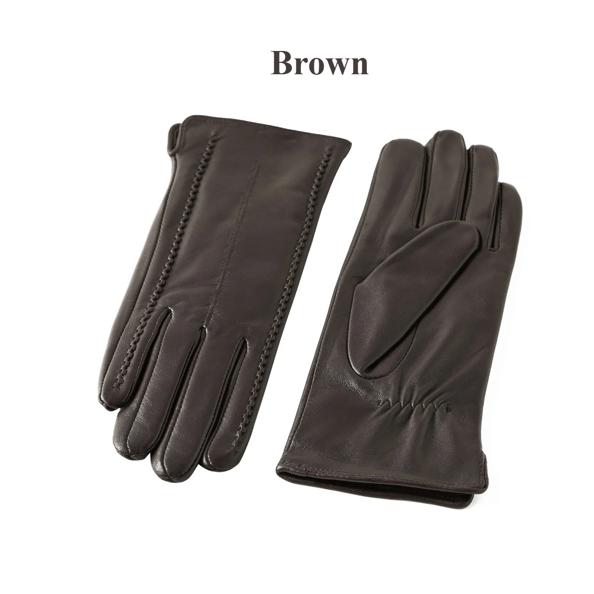 Guanti da donna in pelle di pecora di buona qualità, caldi invernali, più velluto, corti e sottili, touch screen, colore guida, guanti in pelle da donna