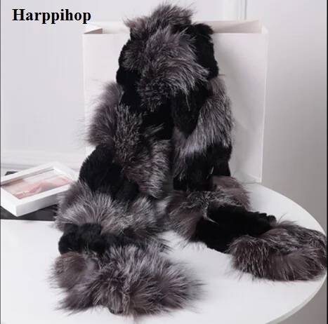 Harppihop pelliccia di volpe argento colore nero nuova pelliccia di volpe c/w sciarpa di pelliccia di coniglio rex avvolgere scialle del capo miglior regalo di natale regalo di compleanno