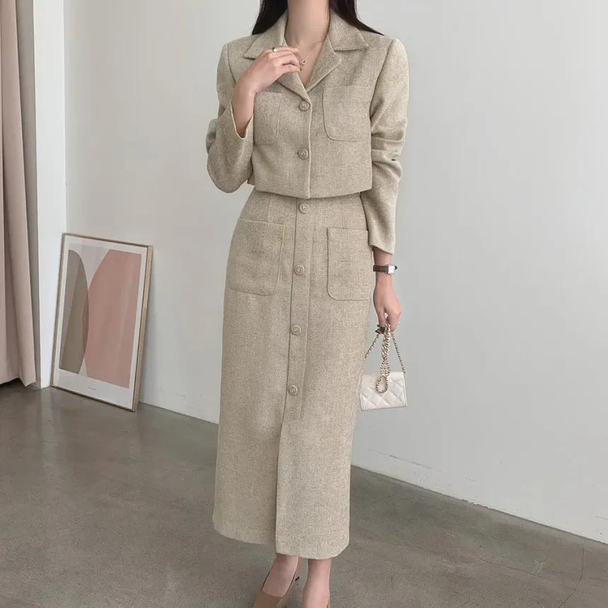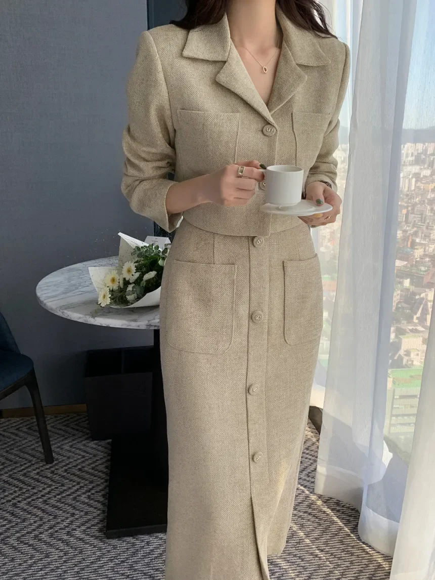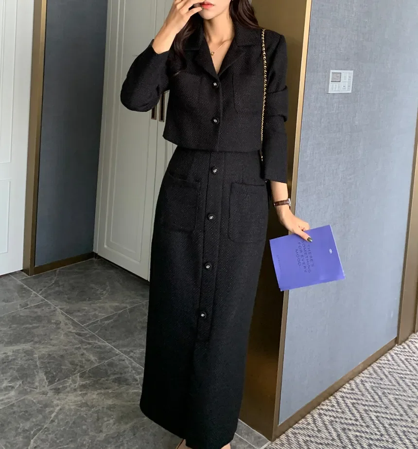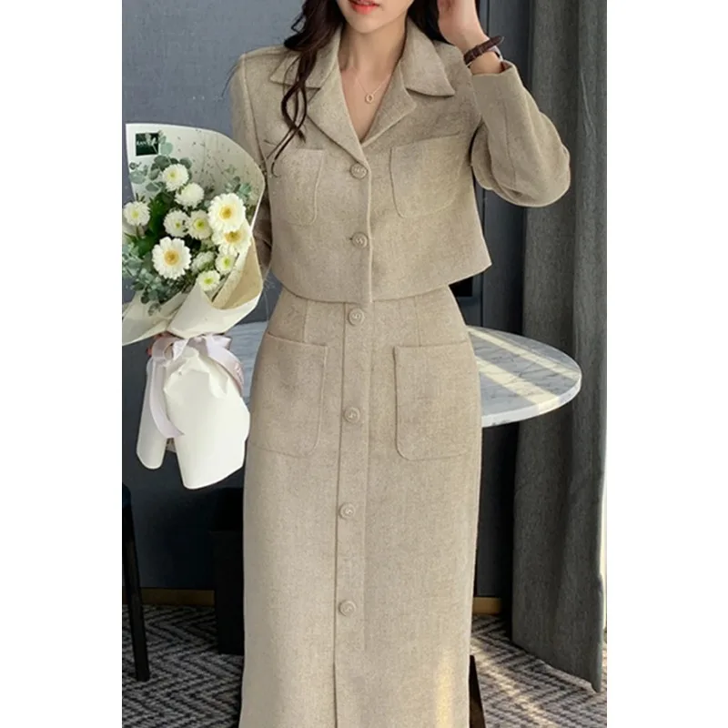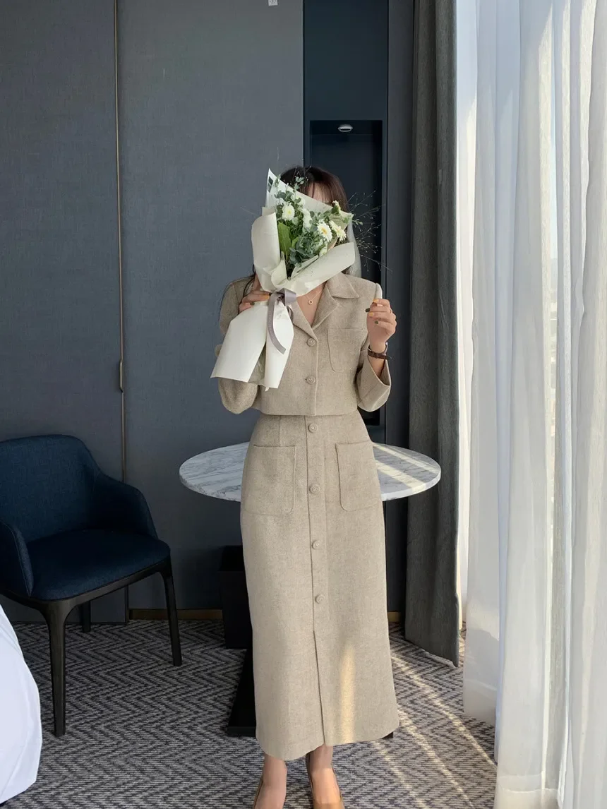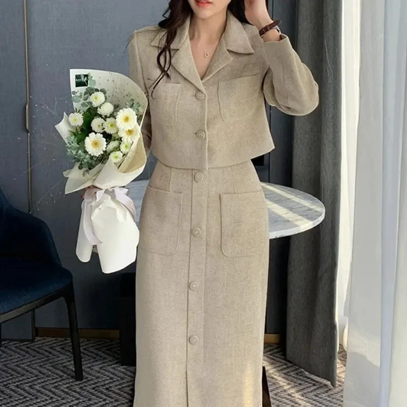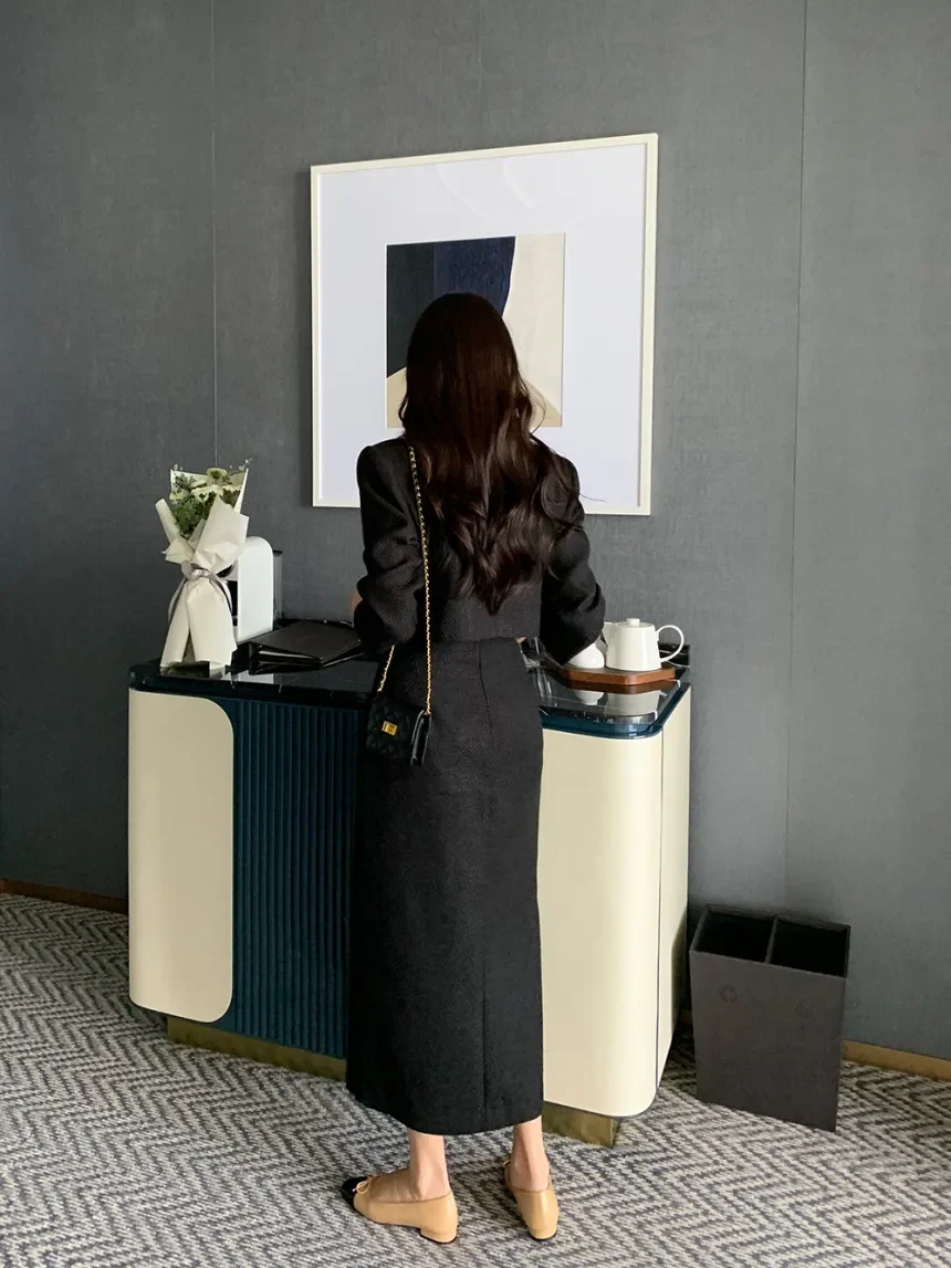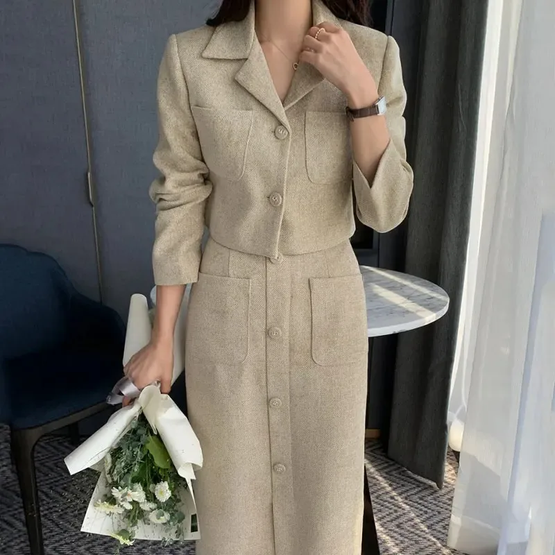 Insozkdg corea Chic Vintage elegante donna vestito giacca gonna monopetto cappotto corto vita alta lungo Hip Tweed gonna divisa Set