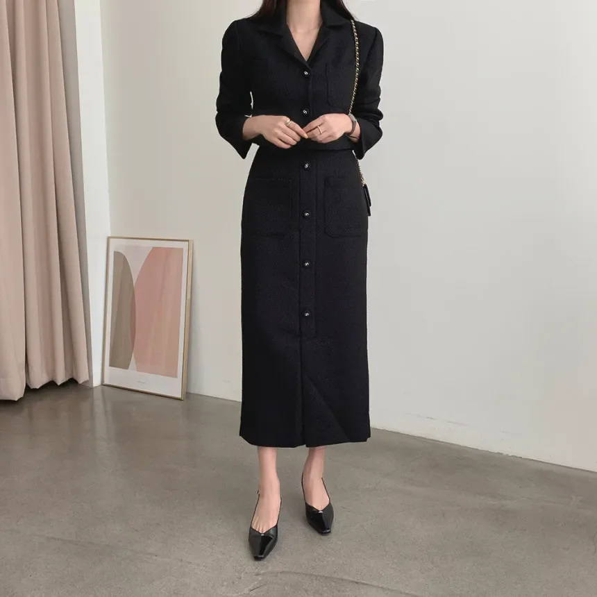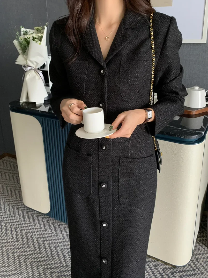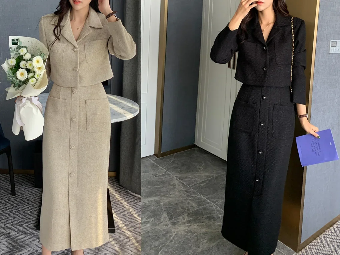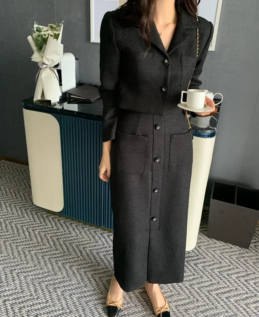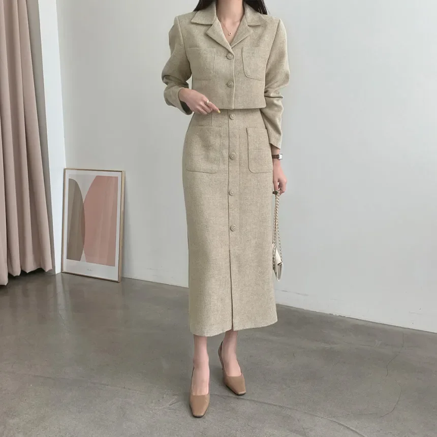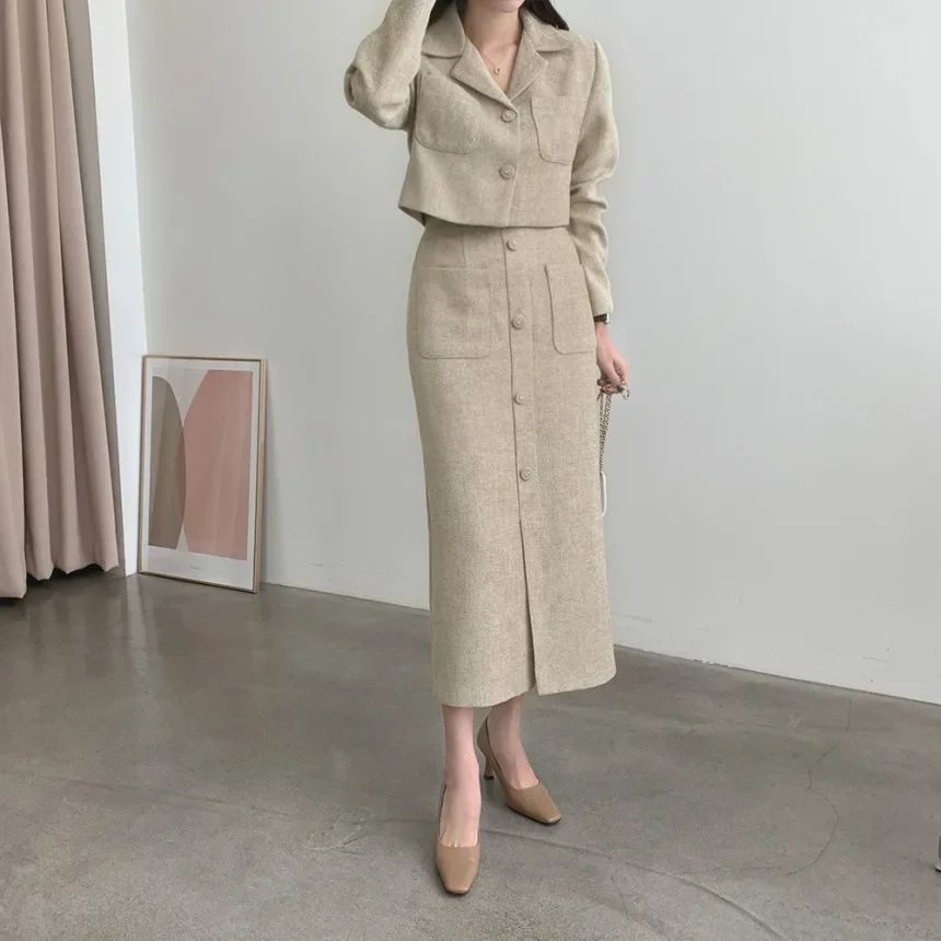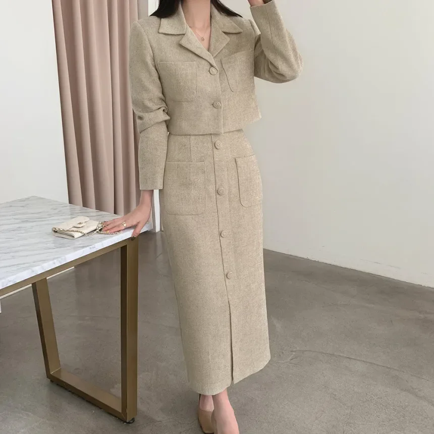 Insozkdg corea Chic Vintage elegante donna vestito giacca gonna monopetto cappotto corto vita alta lungo Hip Tweed gonna divisa Set