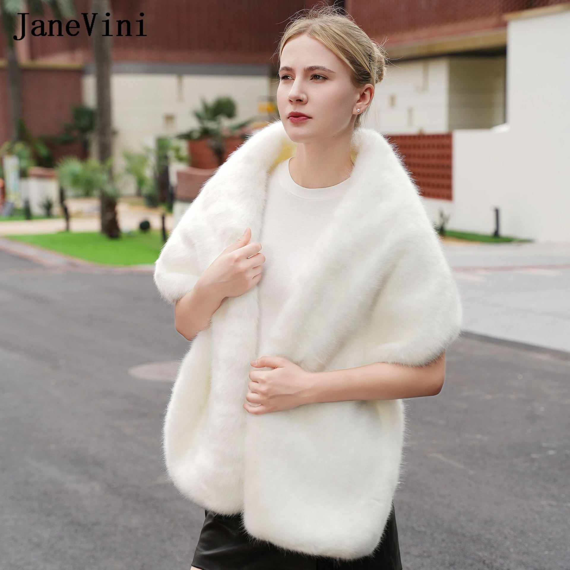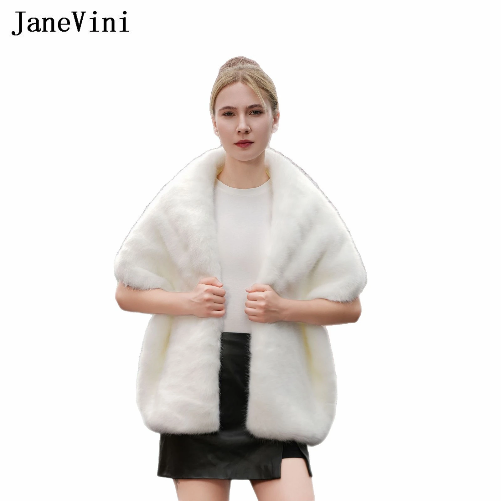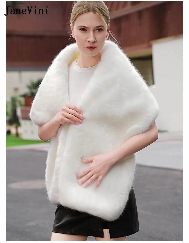 JaneVini Vendita Calda Inverno Pelliccia Sintetica Scialle Da Sposa Bolero Mariée Avorio Caldo Abito Da Sera Delle Donne Avvolge Mantello Da Sposa Mantello Sposa Stola