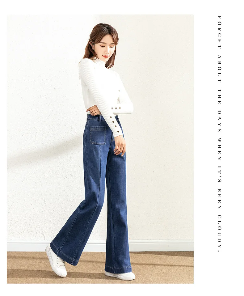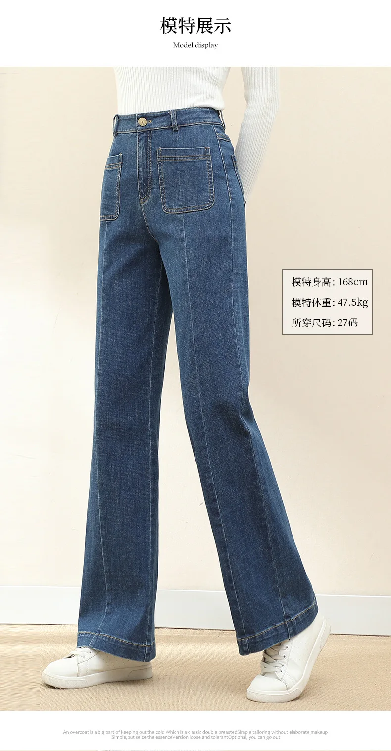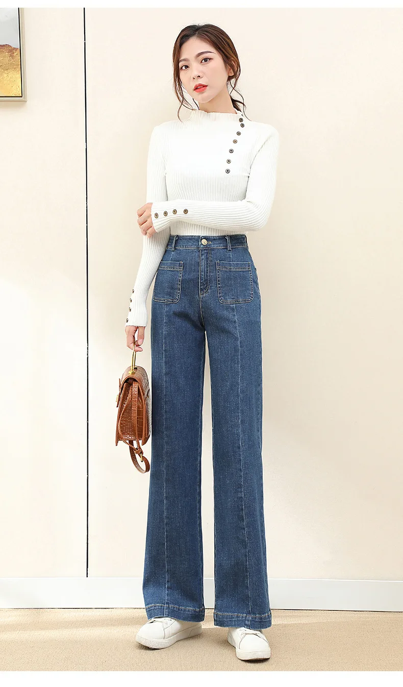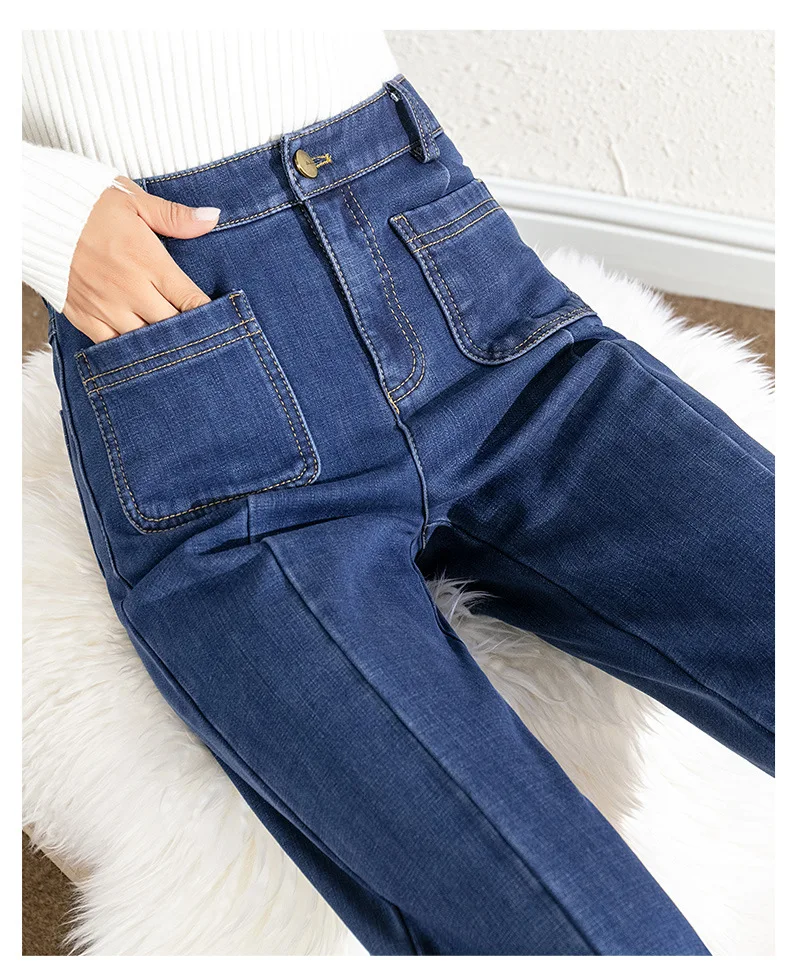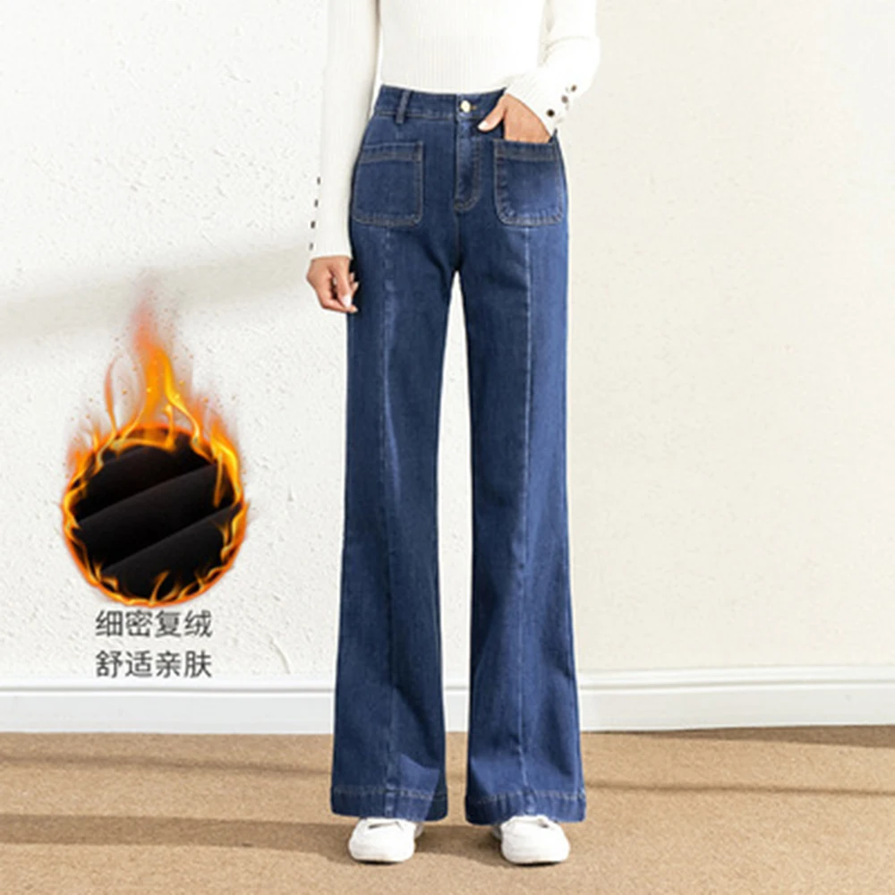 Jeans in Denim a gamba larga in velluto da donna, elasticizzato caldo addensato, tasche grandi, vita alta, moda, Jeans in pile invernale, primavera autunno