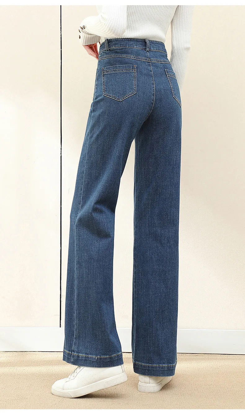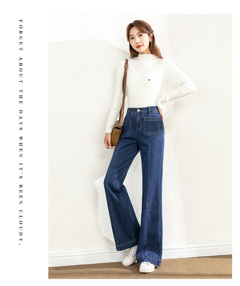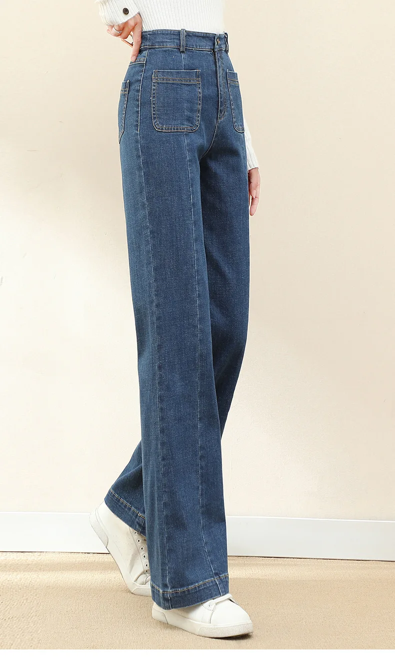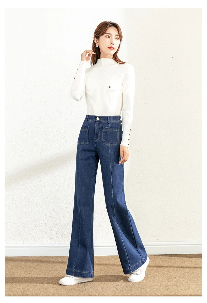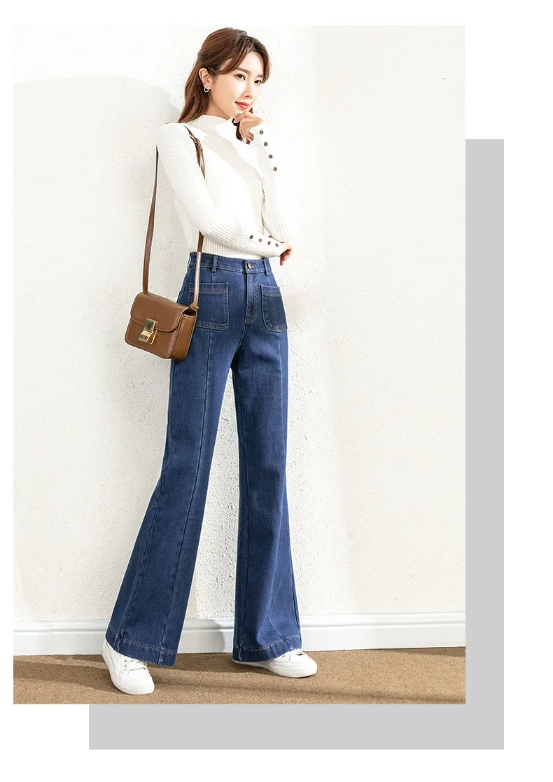 Jeans in Denim a gamba larga in velluto da donna, elasticizzato caldo addensato, tasche grandi, vita alta, moda, Jeans in pile invernale, primavera autunno