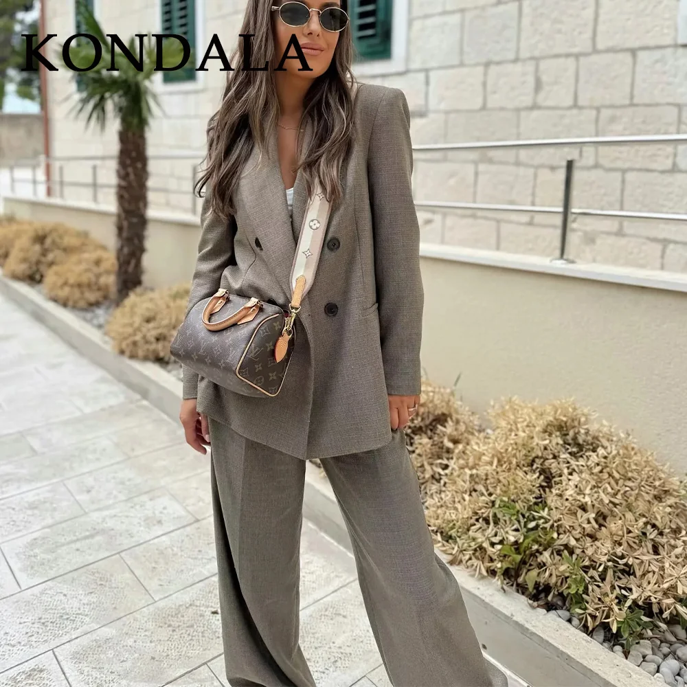KONDALA 2025 Autunno Inverno Office Lady Abiti solidi Moda elegante doppio petto Top per le donne Chic Zip Up Pantaloni a gamba larga