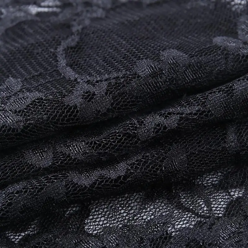 colletto rialzato, maniche lunghe, pizzo floreale trasparente scavato sexy, tinta unita nera, due fibbie sul davanti.