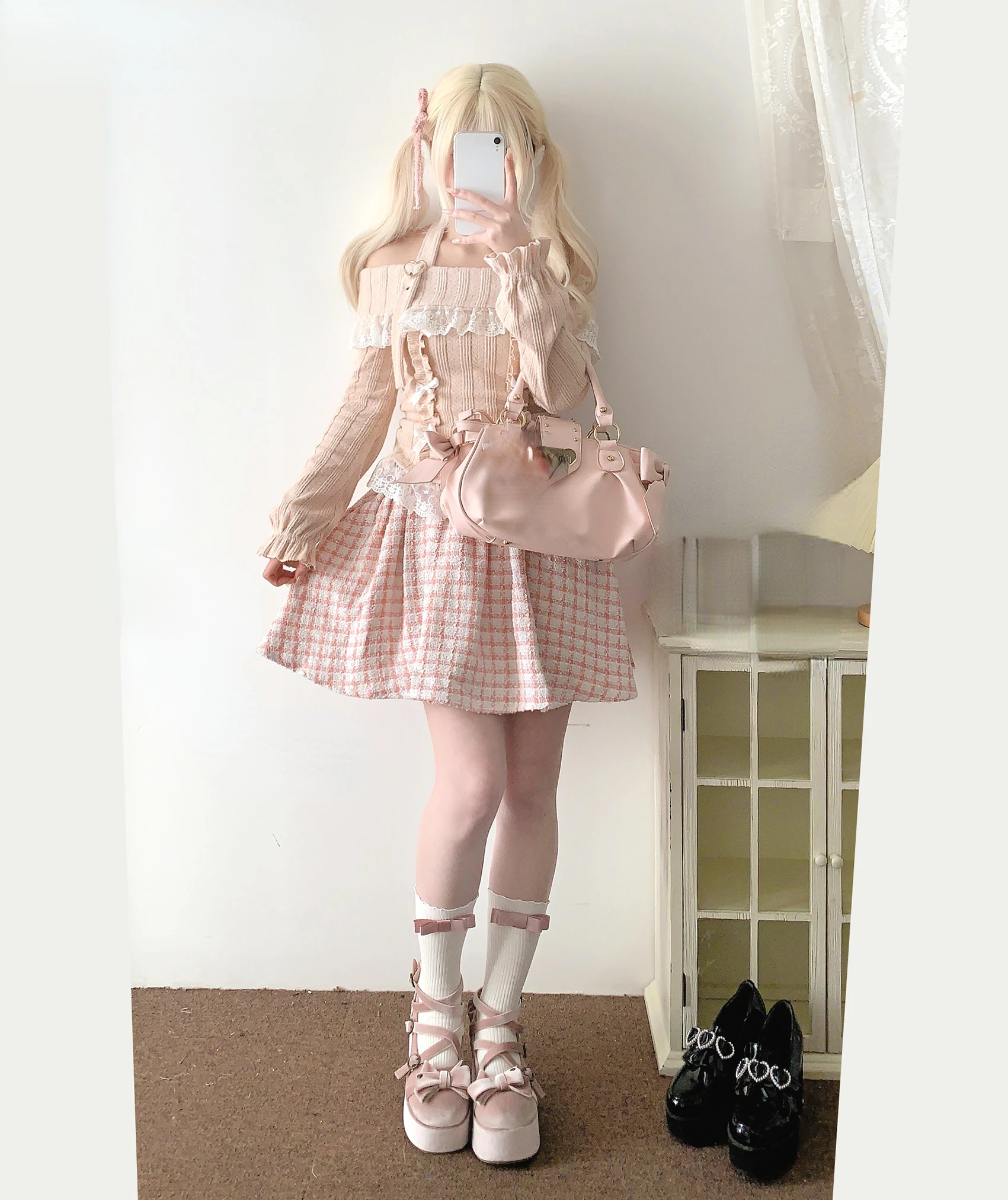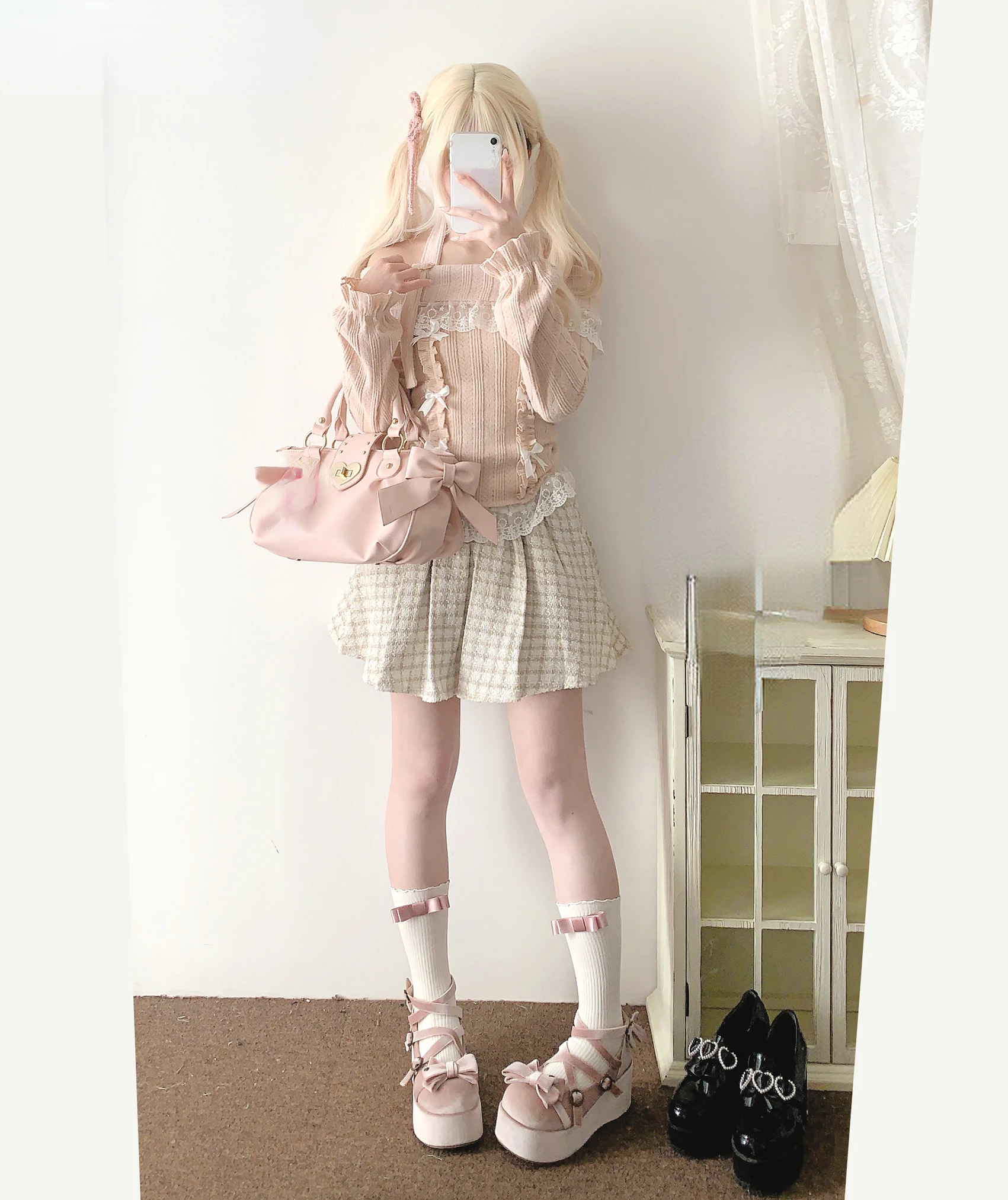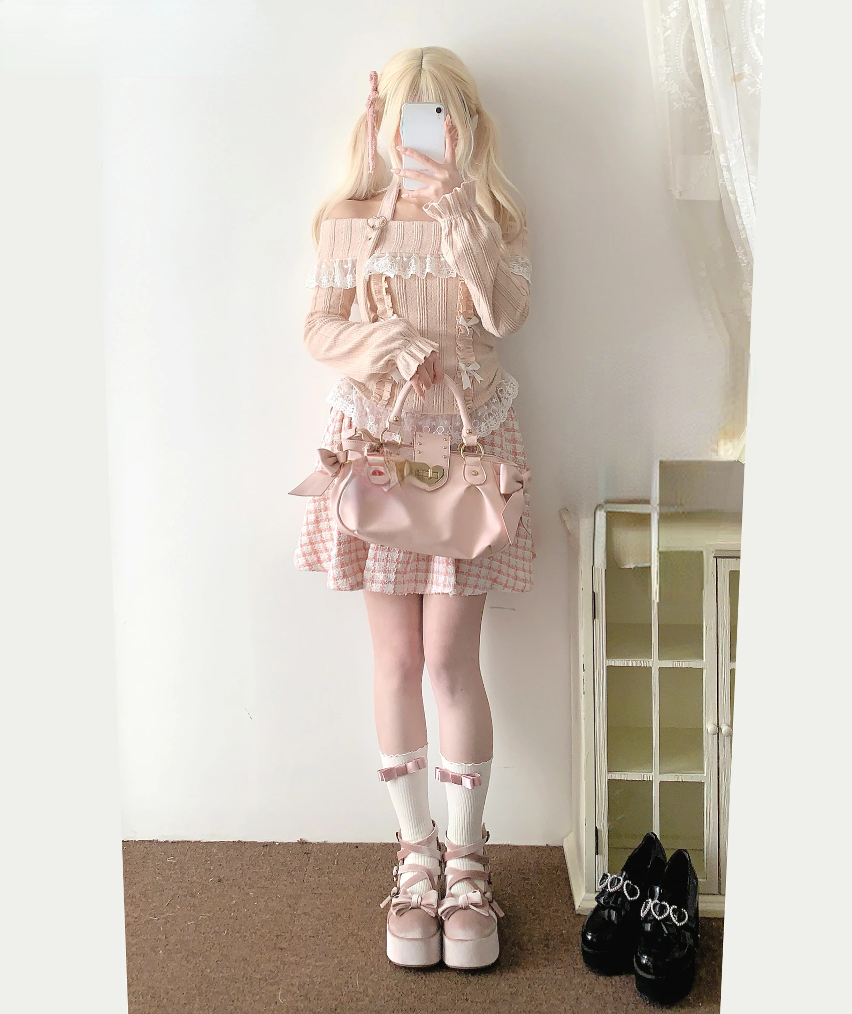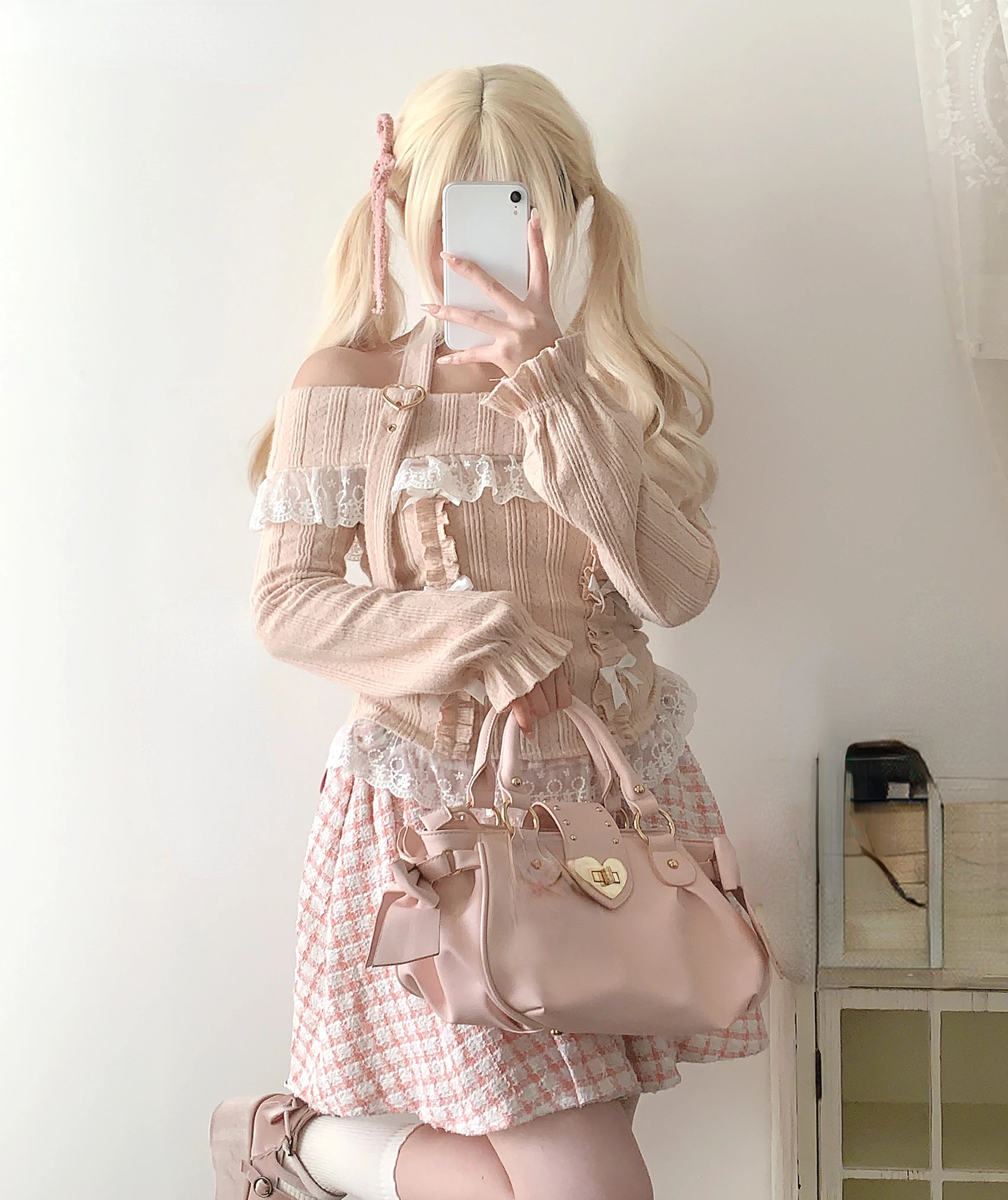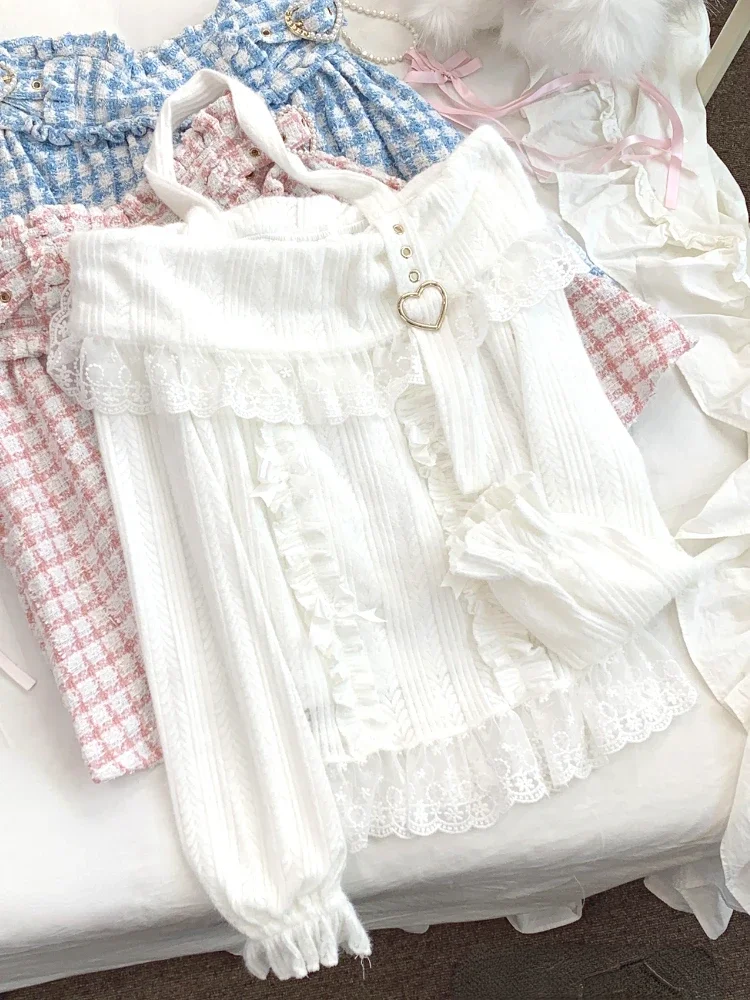 Lolita Maglione con spalle scoperte Donna 2025 Kawaii Patchwork di pizzo Y2k Estetico giapponese Bottoming Crop Top Pullover Maglieria
