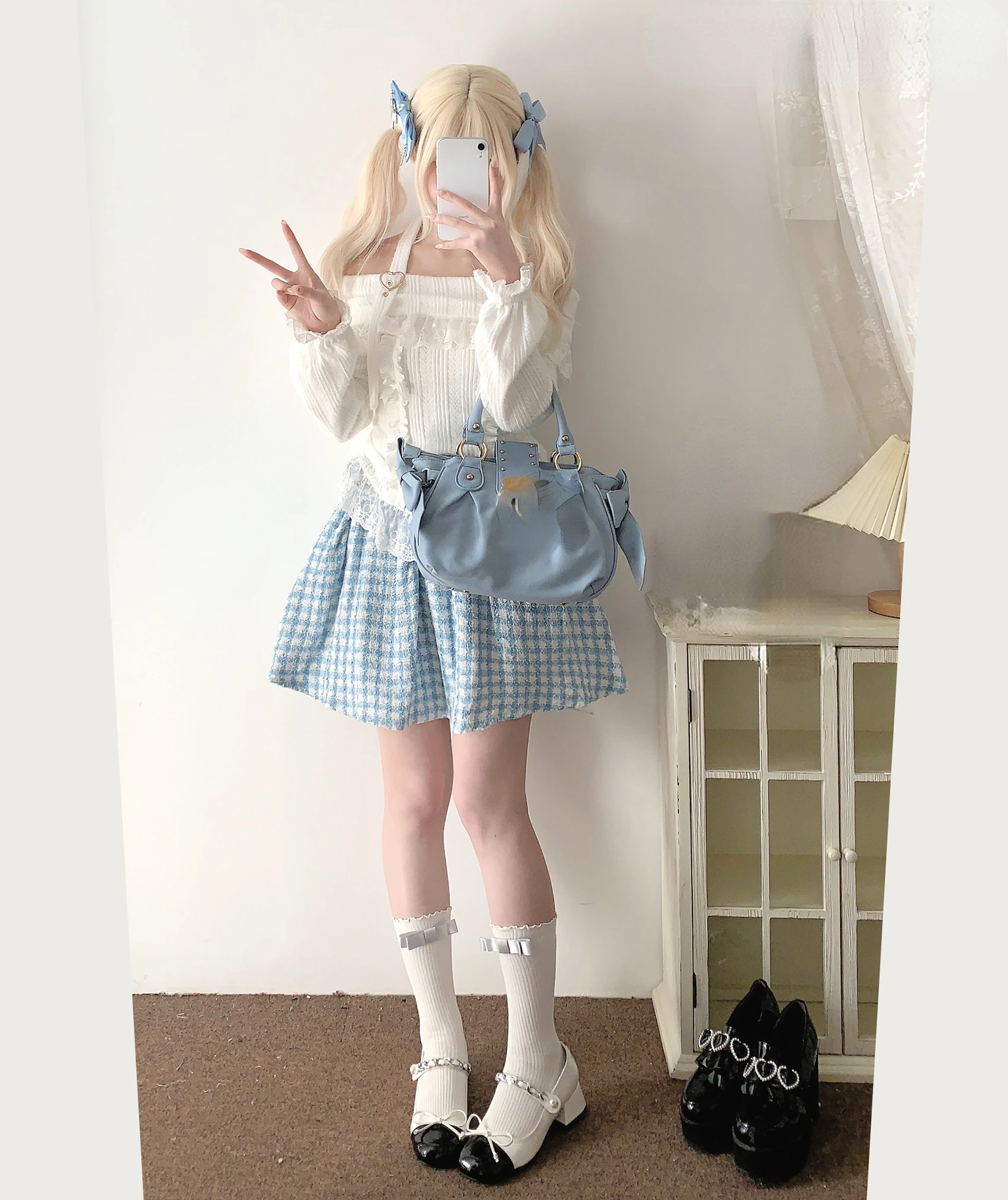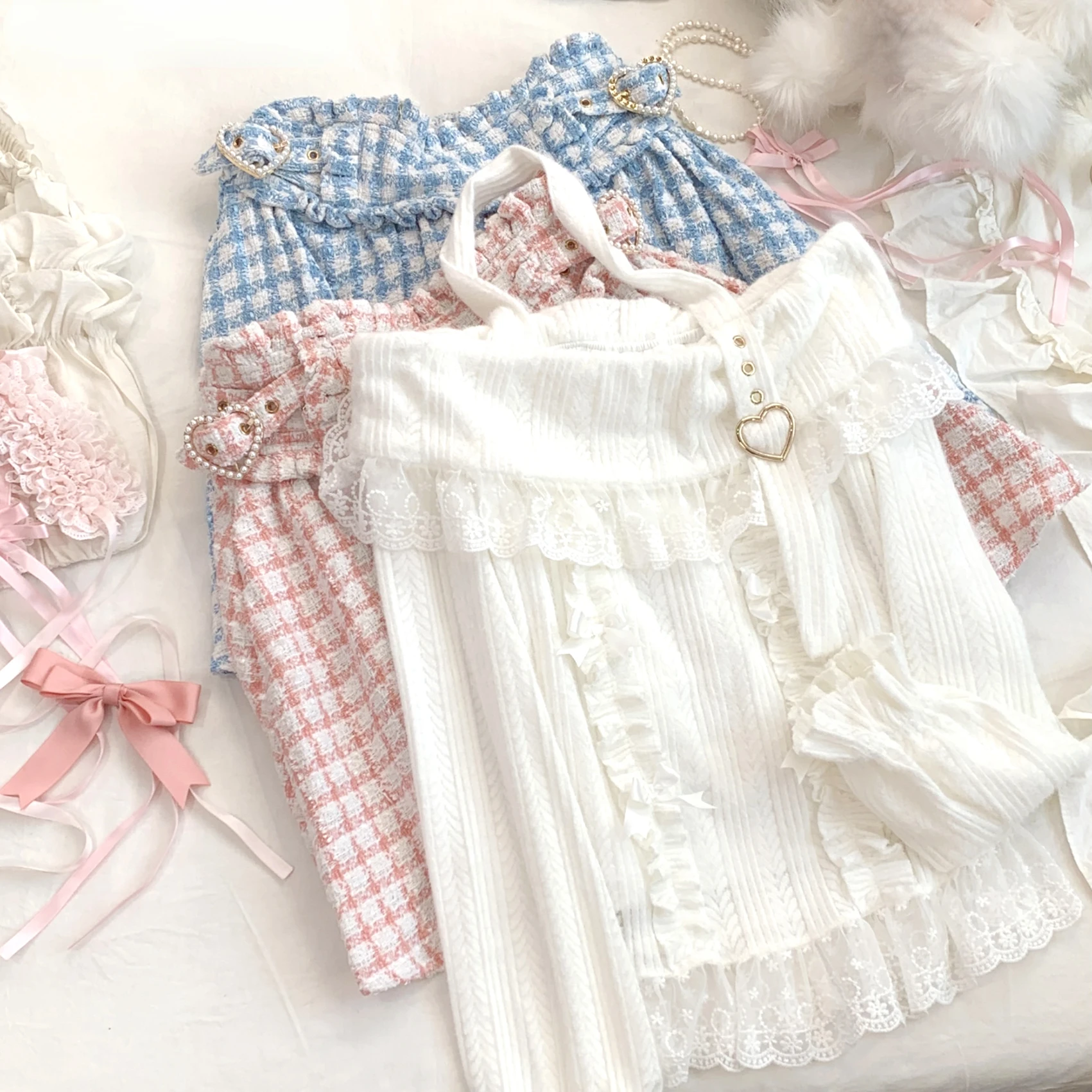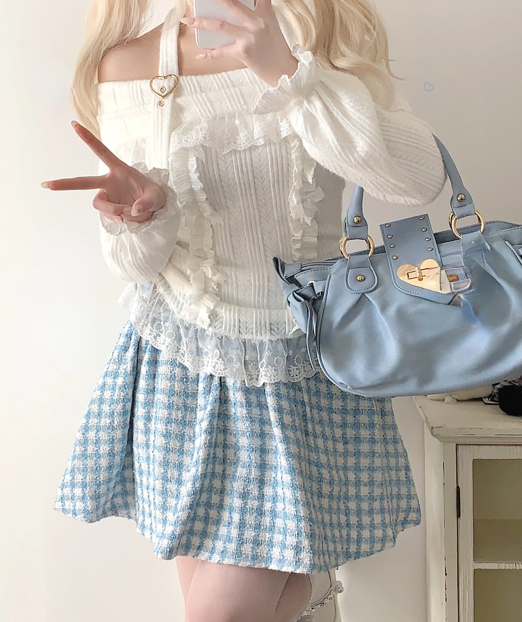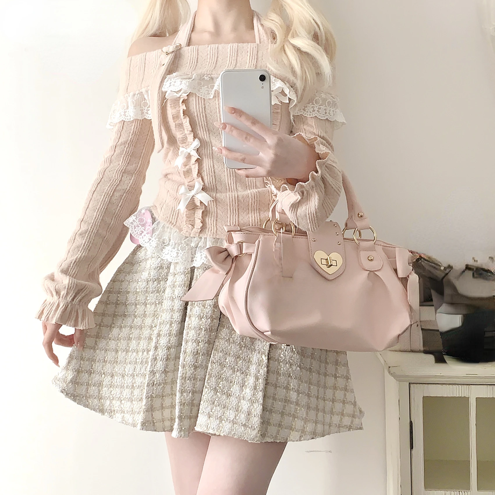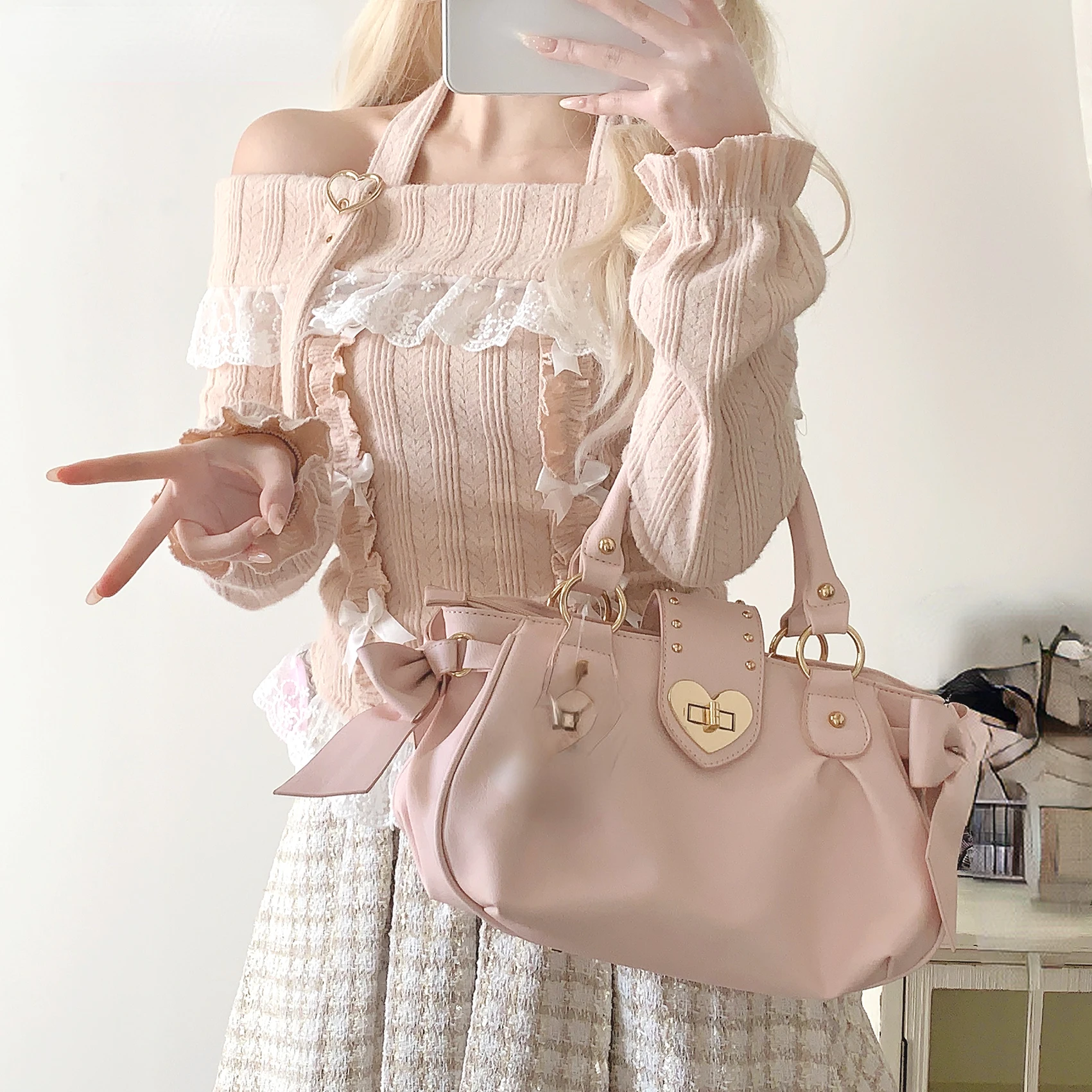 Lolita Maglione con spalle scoperte Donna 2025 Kawaii Patchwork di pizzo Y2k Estetico giapponese Bottoming Crop Top Pullover Maglieria