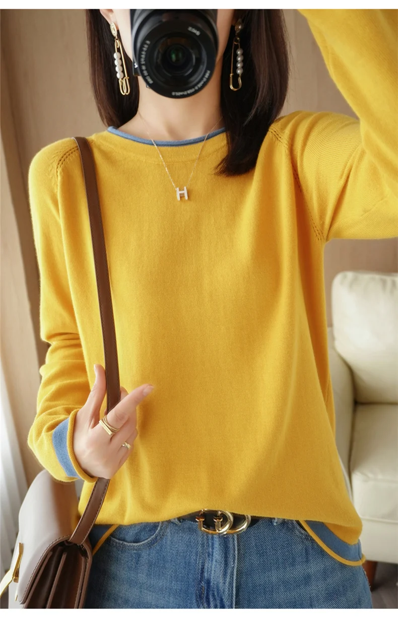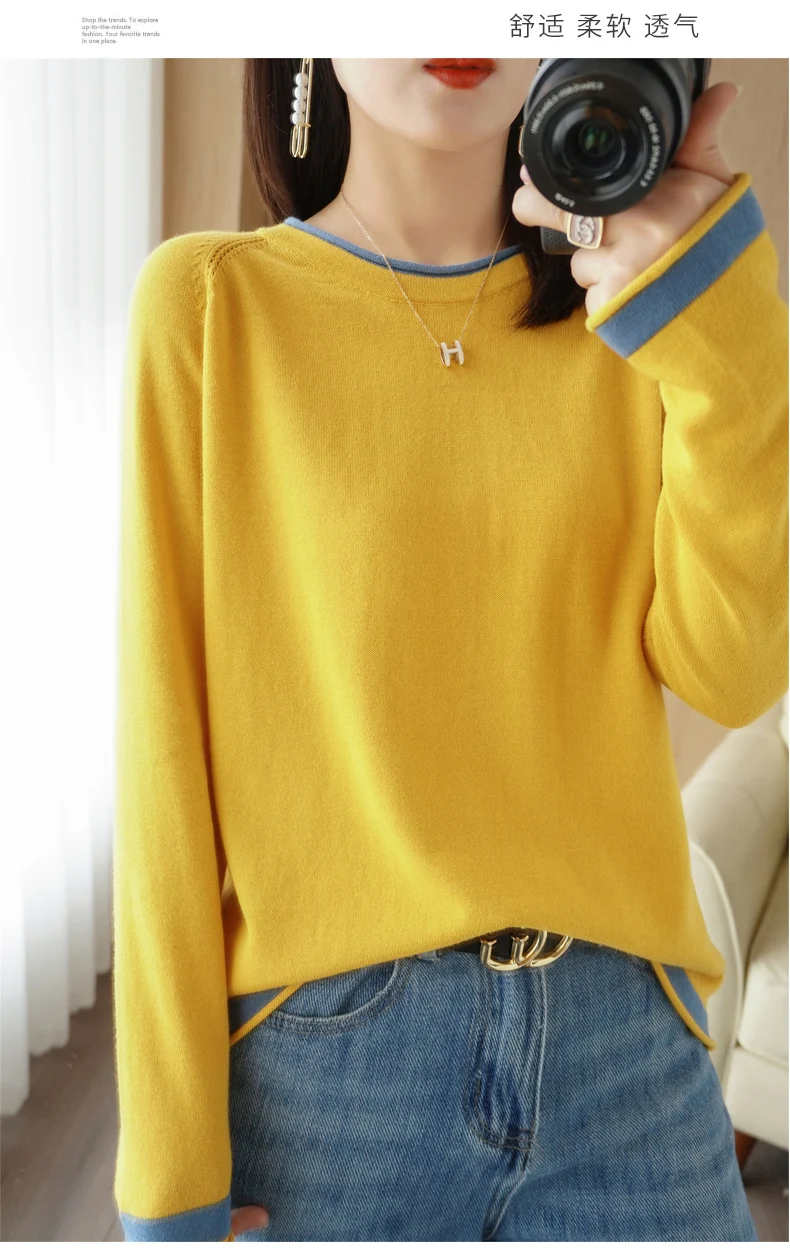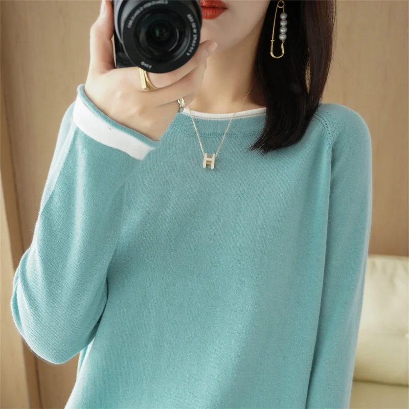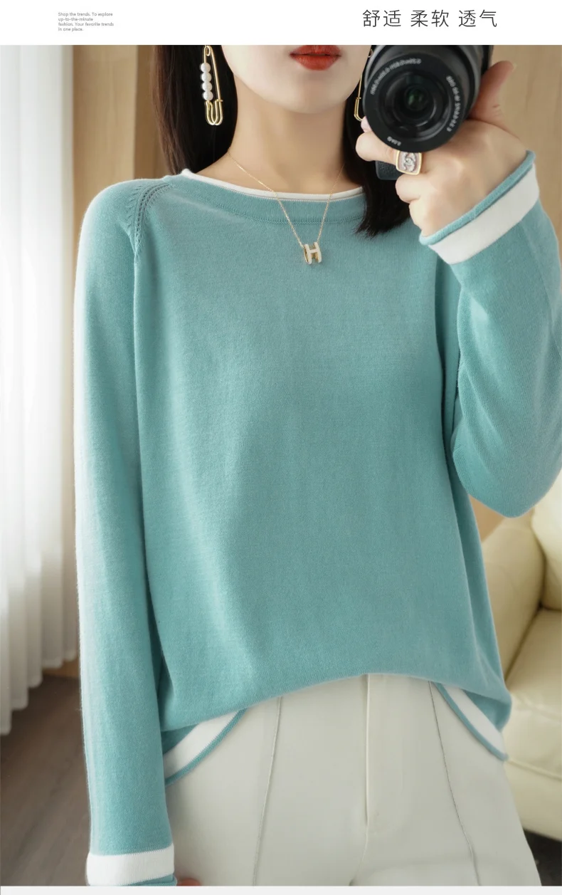 Maglieria in cotone 100% maglione girocollo da donna primavera ed estate nuova camicia con fondo in cotone e lino abbinato ai colori larghi