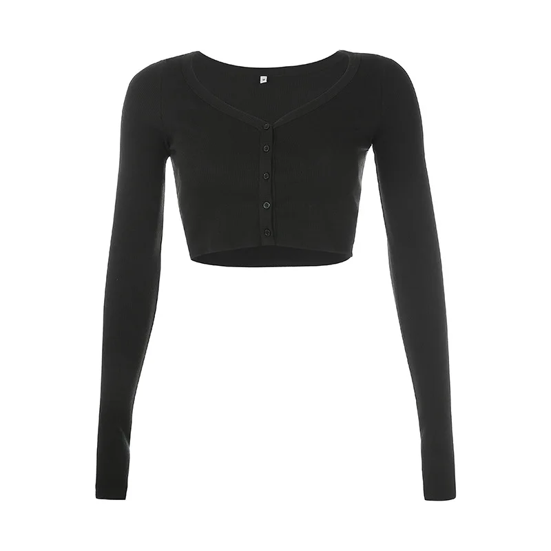 Maglietta lavorata a maglia nera con scollo a v manica lunga Crop Top donna Y2k vestiti primavera autunno Streetwear bottone Sexy maglietta corta donna 2024