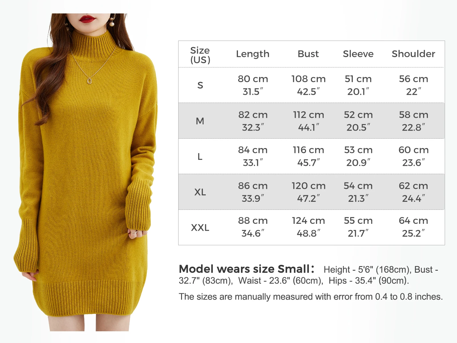 *Catteristiche: tessuto fine calibro 7, spessore medio.Vestibilità ampia, design a collo finto a maniche lunghe.Alta elasticità, stile casual.Leggero, caldo e morbido.Questo abito maglione in pura lana merino è adatto per la primavera, l’autunno e l’inverno.