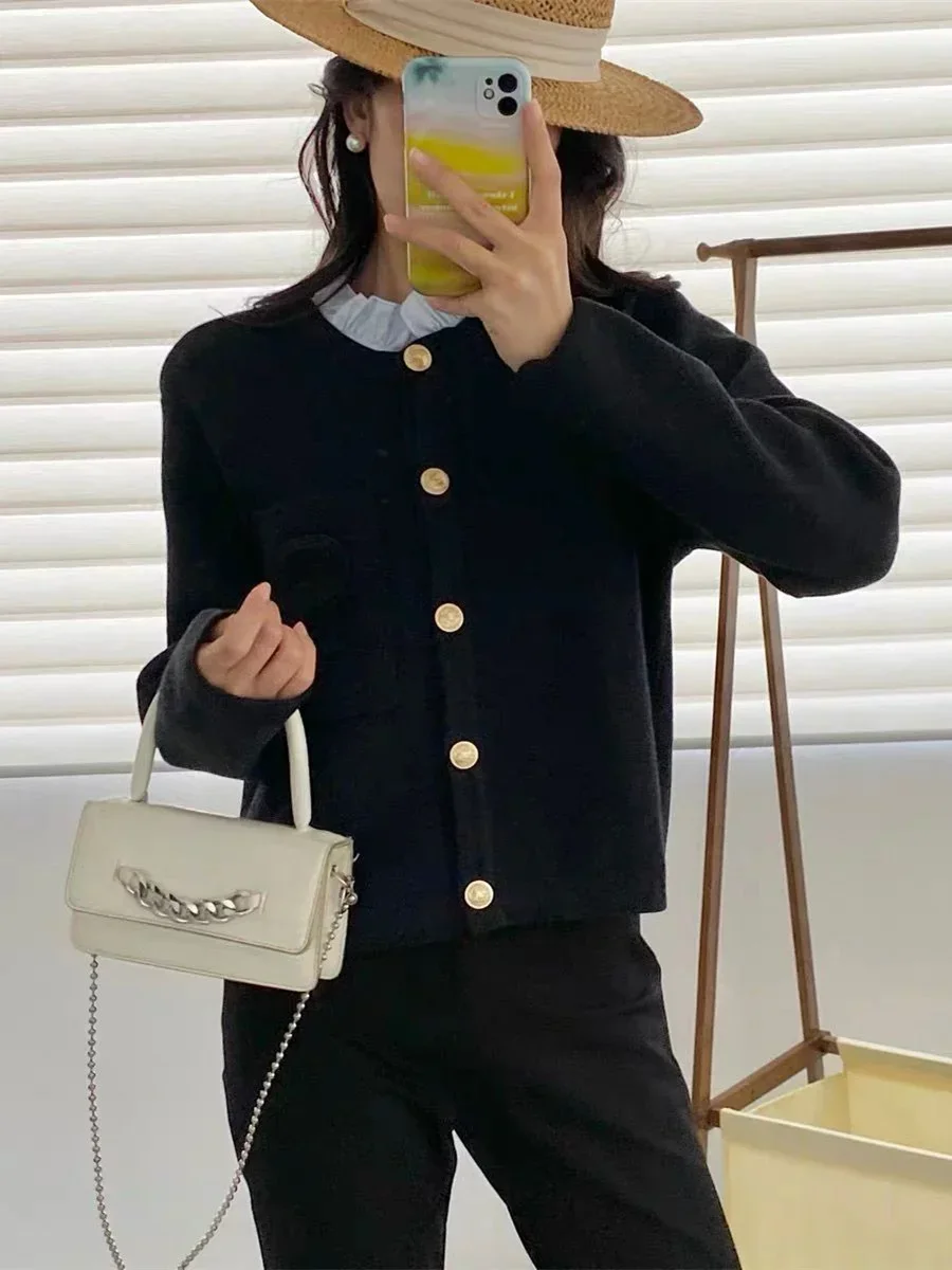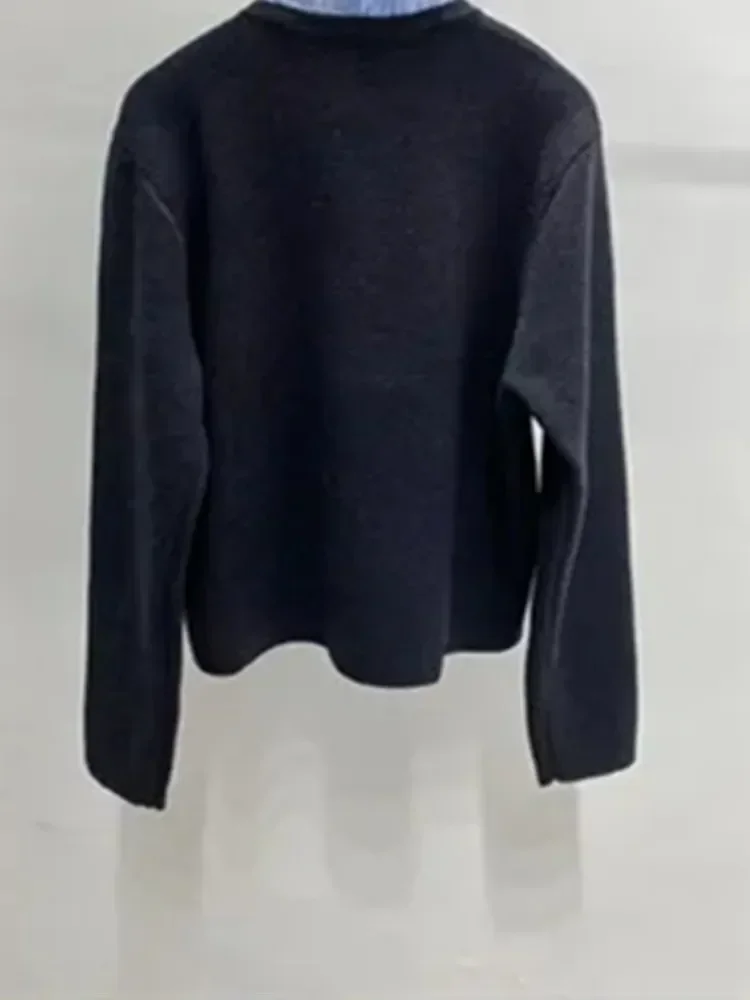 Maglione con lettera ricamata da donna Cardigan in maglia a maniche lunghe con colletto con volant e cuciture nere