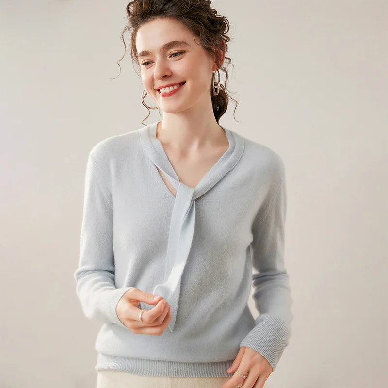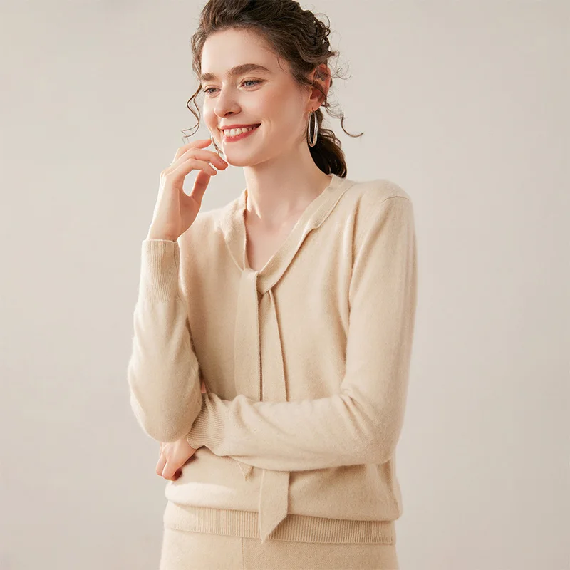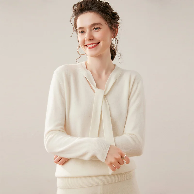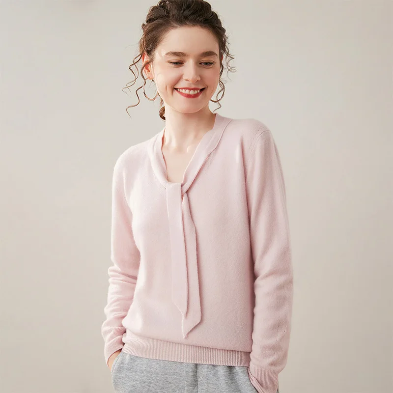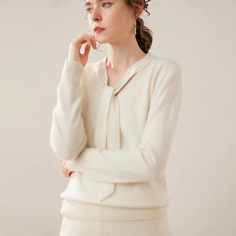 Maglione da donna elegante 100% maglione di cashmere pullover vestiti sciarpa colletto nastro stile dolce maglia autunno inverno top a maniche lunghe
