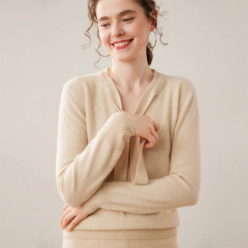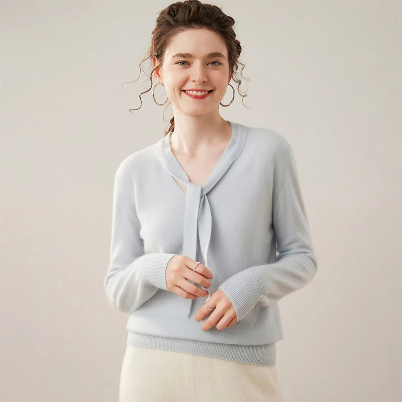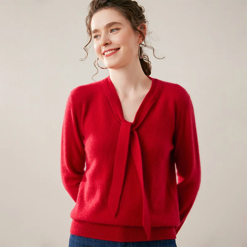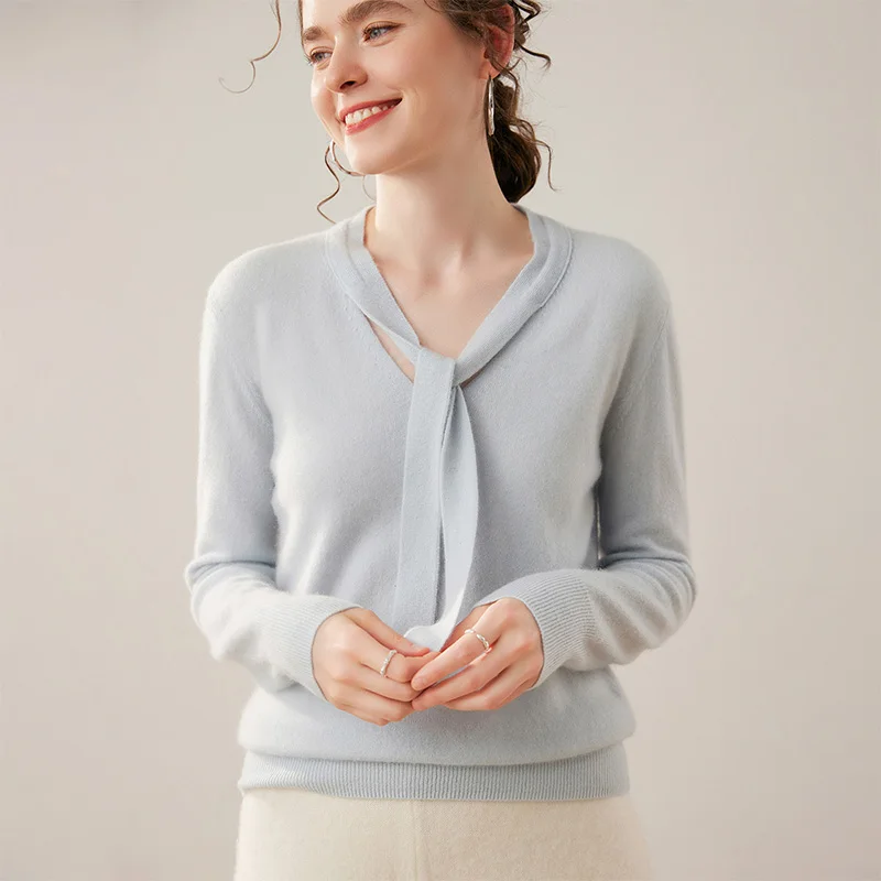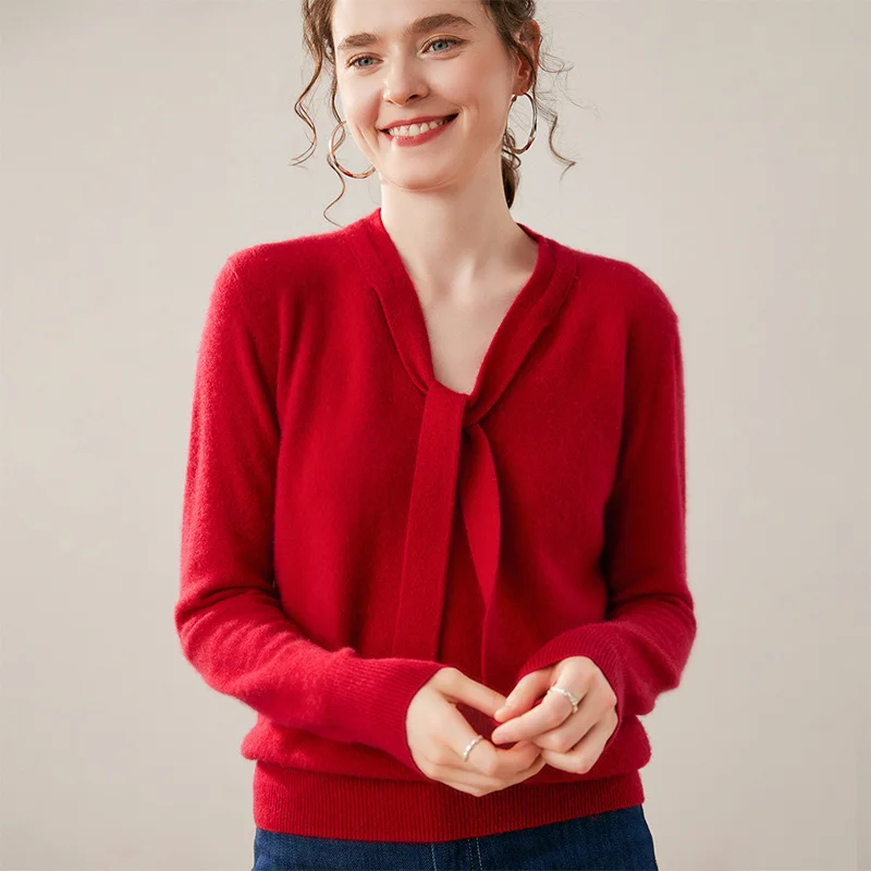 Maglione da donna elegante 100% maglione di cashmere pullover vestiti sciarpa colletto nastro stile dolce maglia autunno inverno top a maniche lunghe