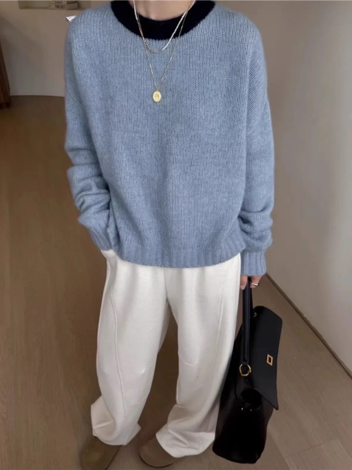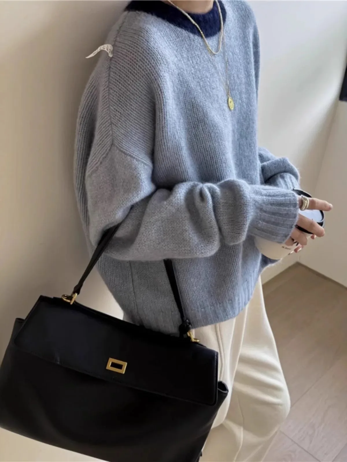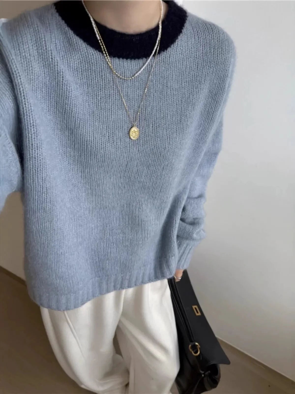 Maglione da donna in puro cashmere con collo rotondo in colore abbinato, maglione corto con base in lana lavorata a maglia ispessita e ampia autunno e inverno