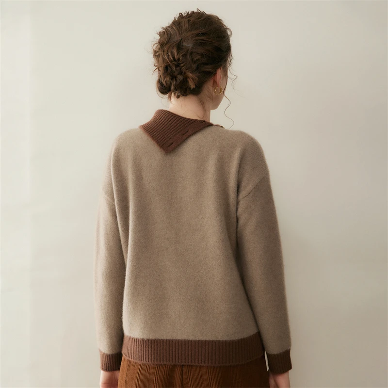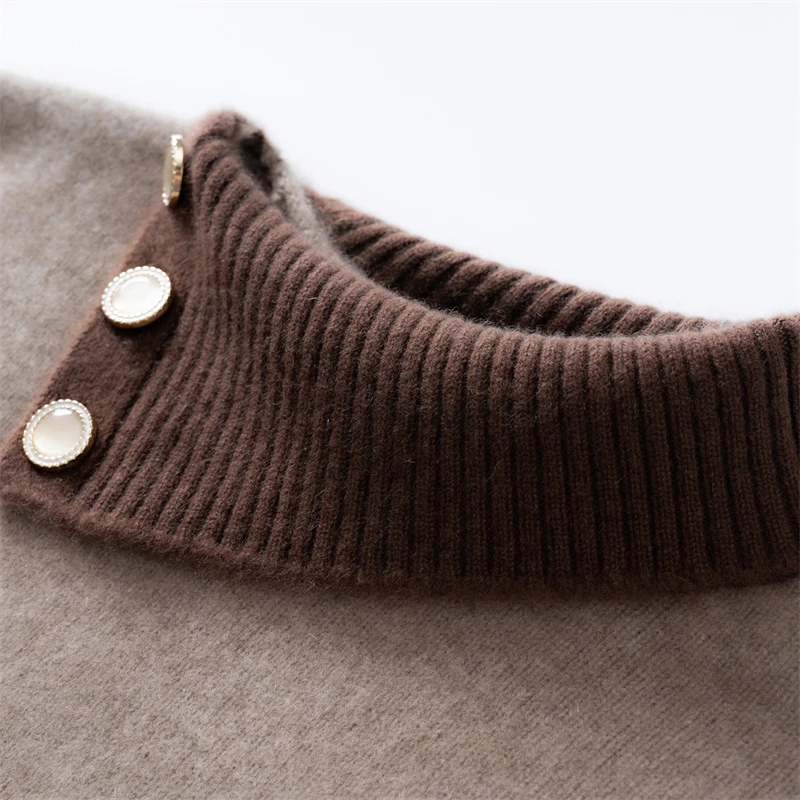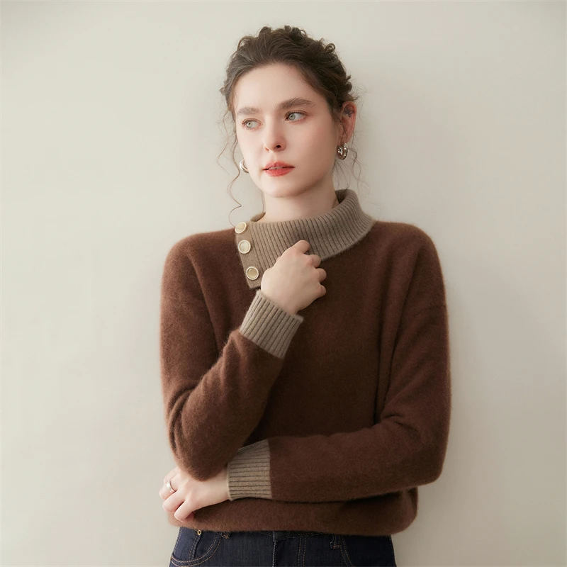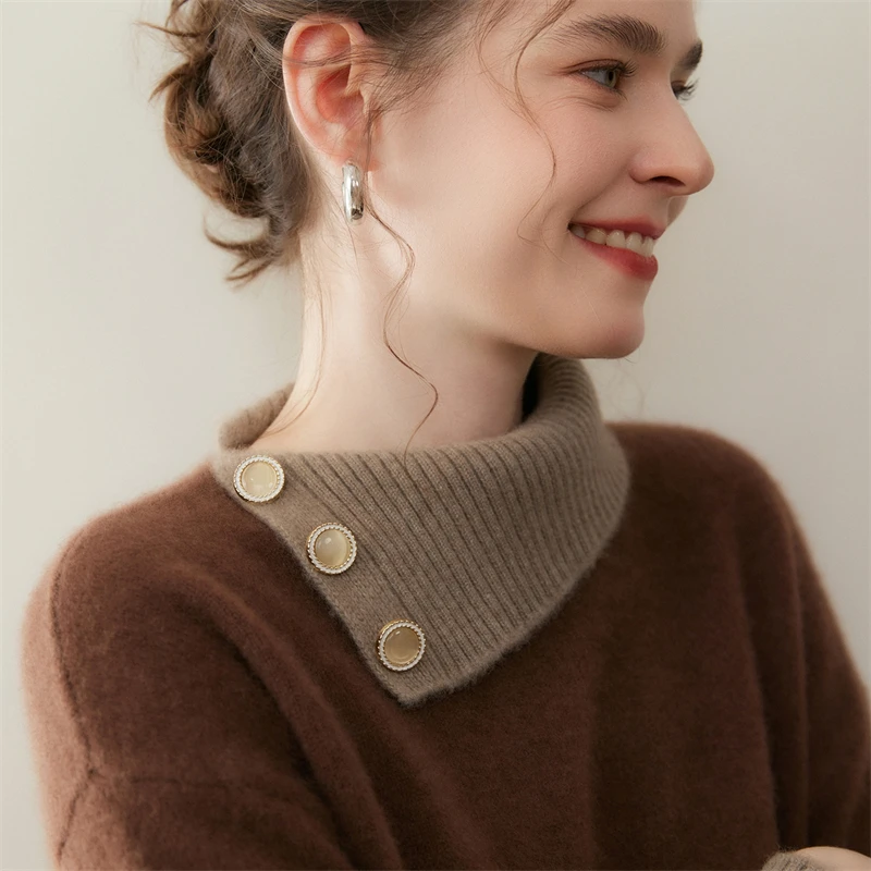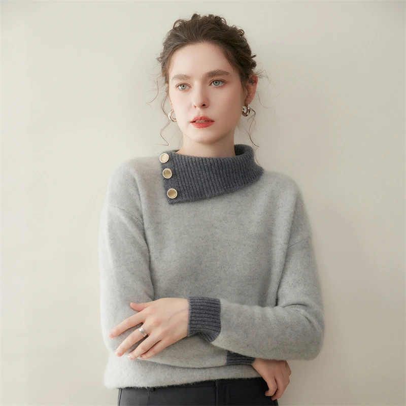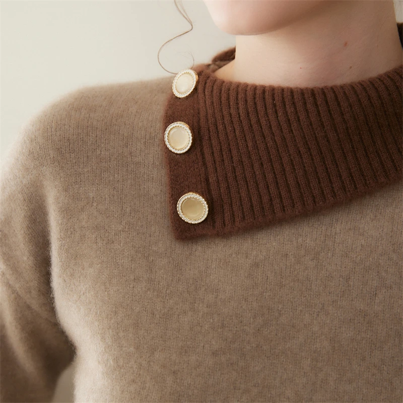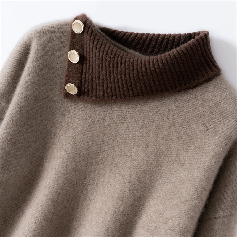 Maglione di cashmere 100% colletto rovesciato irregolare pullover con bottoni laterali donna blocco colore addensare maglieria allentata autunno inverno