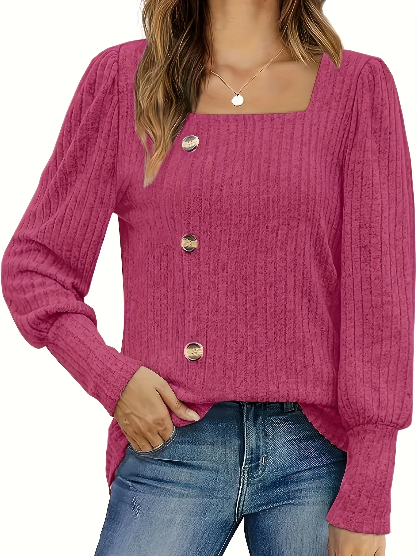 Maglione lavorato a maglia a costine con collo quadrato solido, maglione diviso a maniche lunghe con bottoni casual per la primavera e l’autunno, abbigliamento da donna
