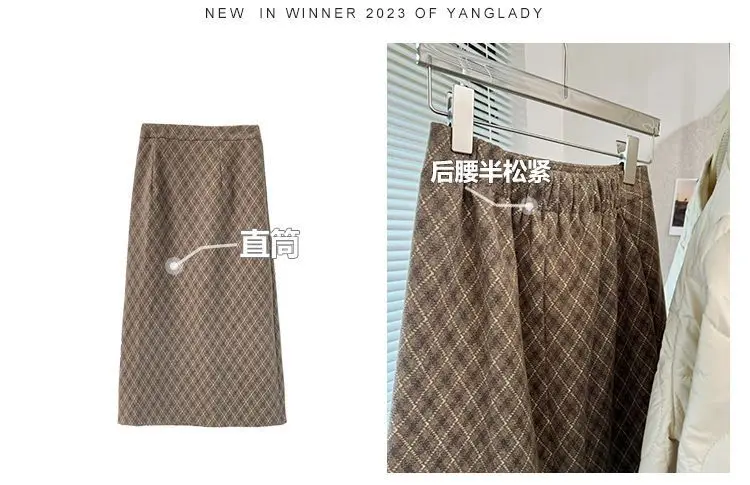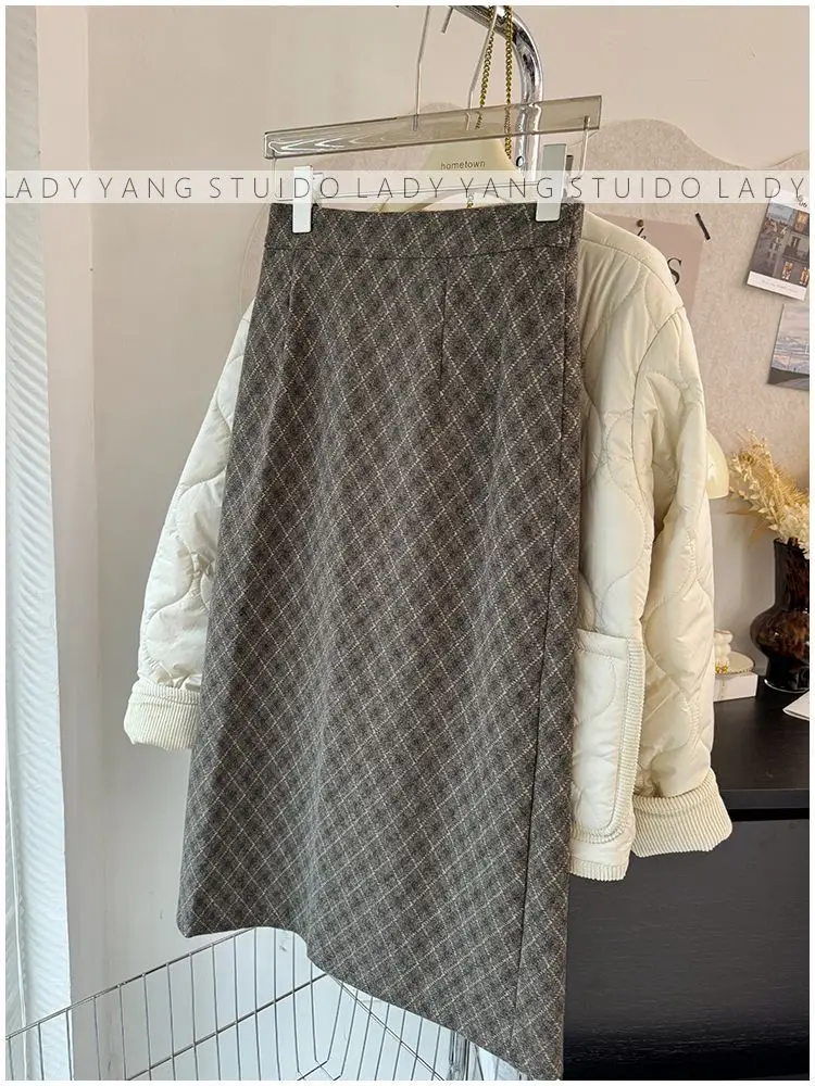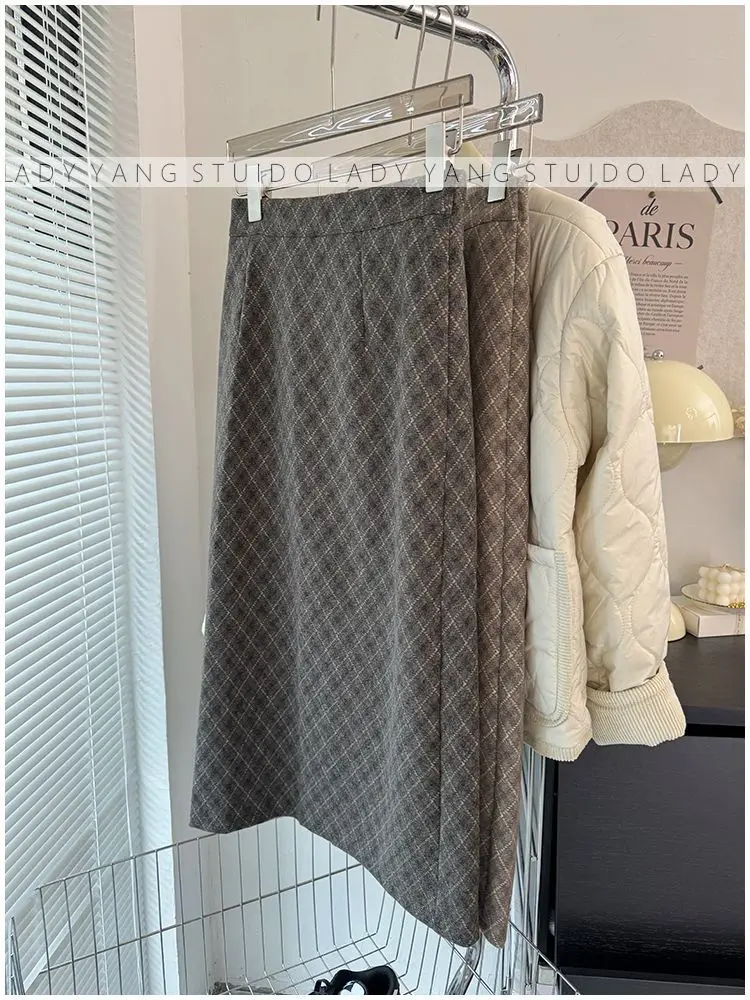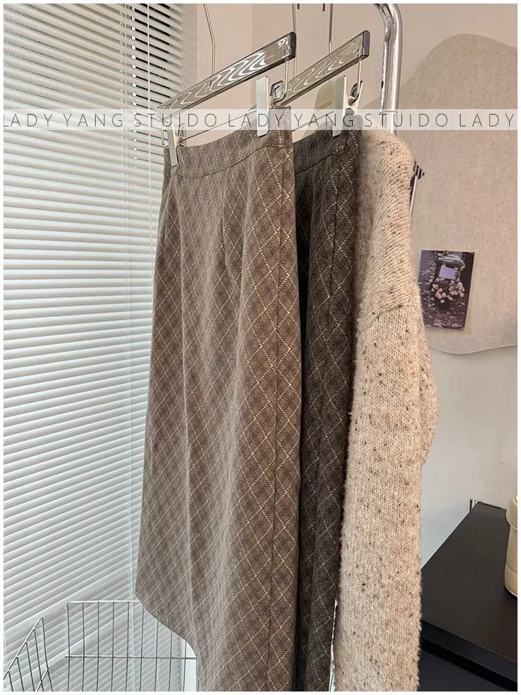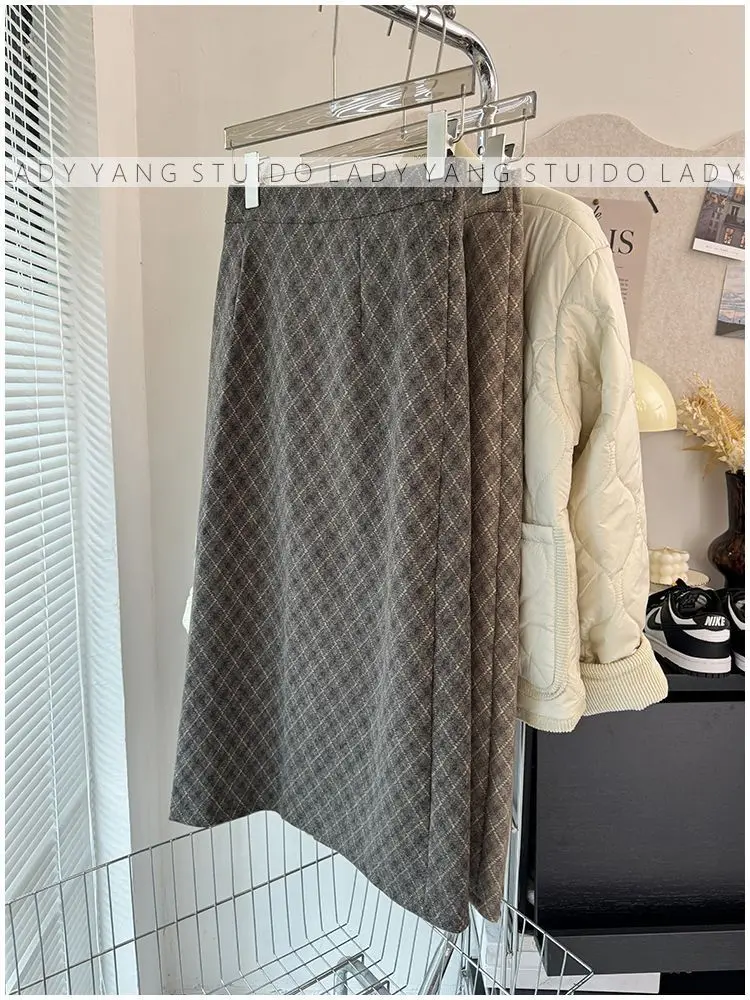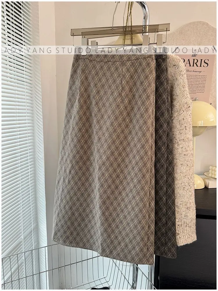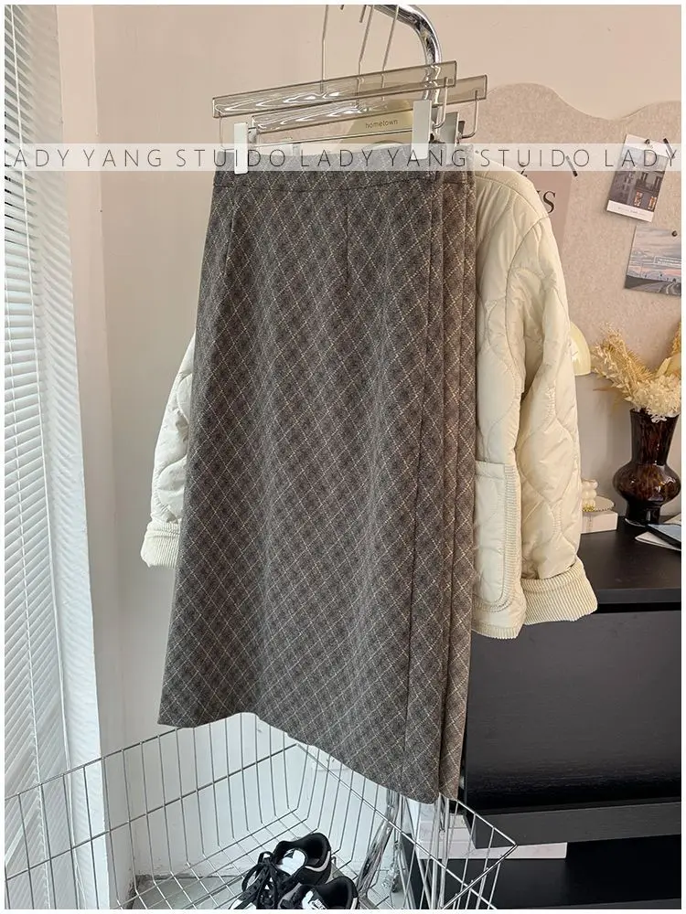 Maillard Gonna di lana dritta con spacco a vita alta di media lunghezza scozzese con diamanti retrò ispessiti autunno e inverno