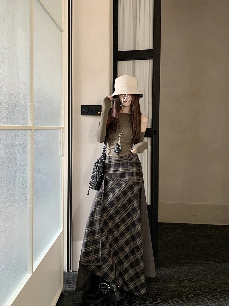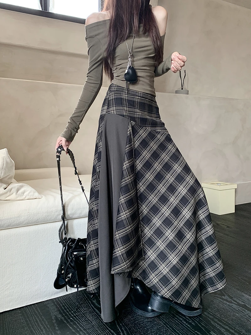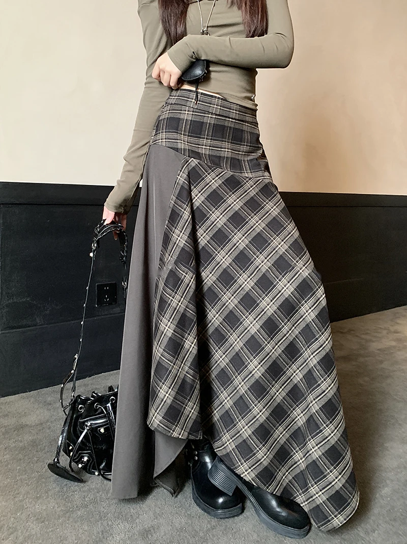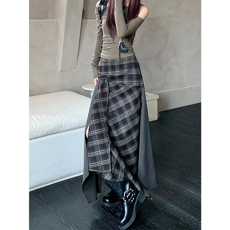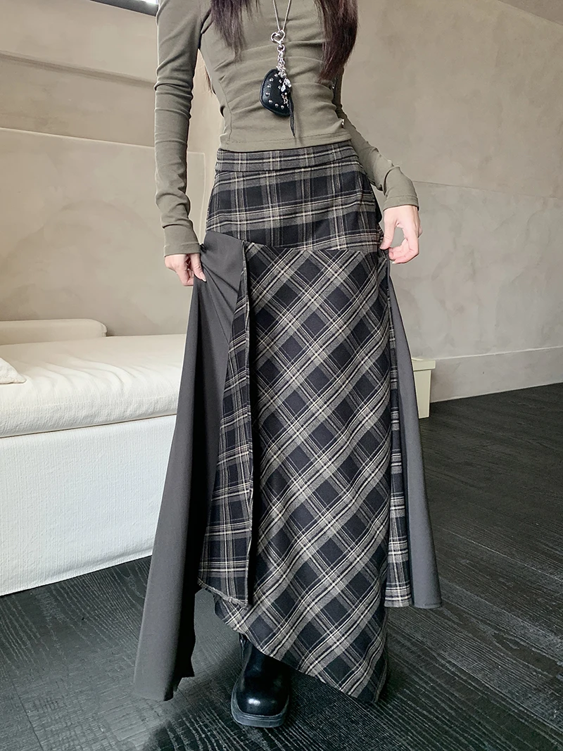 MEXZT Y2K Gonna longuette scozzese Donna Harajuku Vintage Asimmetrico Gonne divise Autunno Inverno Grunge Coreano Patchwork Design Faldas