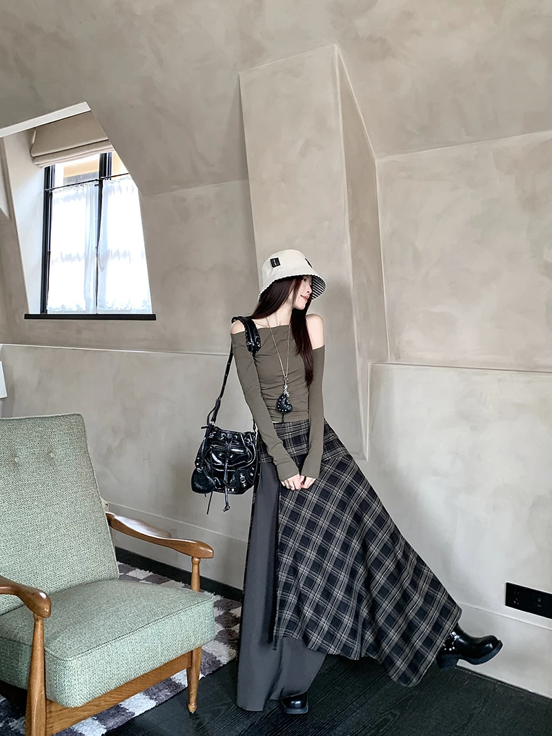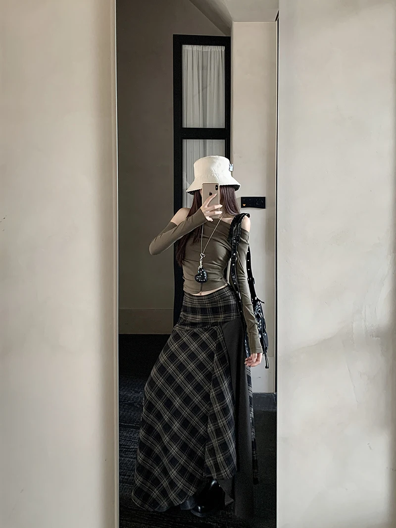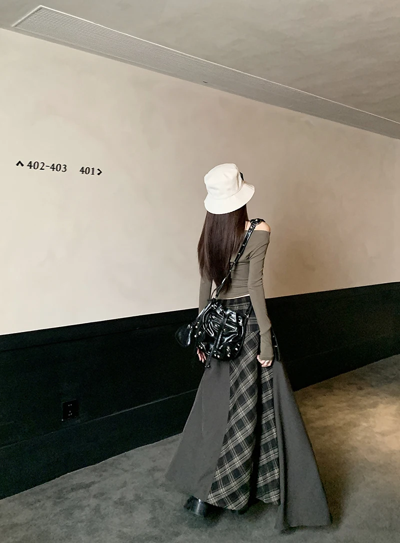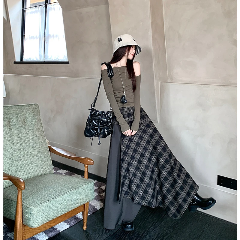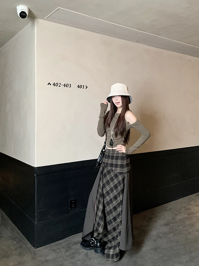 MEXZT Y2K Gonna longuette scozzese Donna Harajuku Vintage Asimmetrico Gonne divise Autunno Inverno Grunge Coreano Patchwork Design Faldas