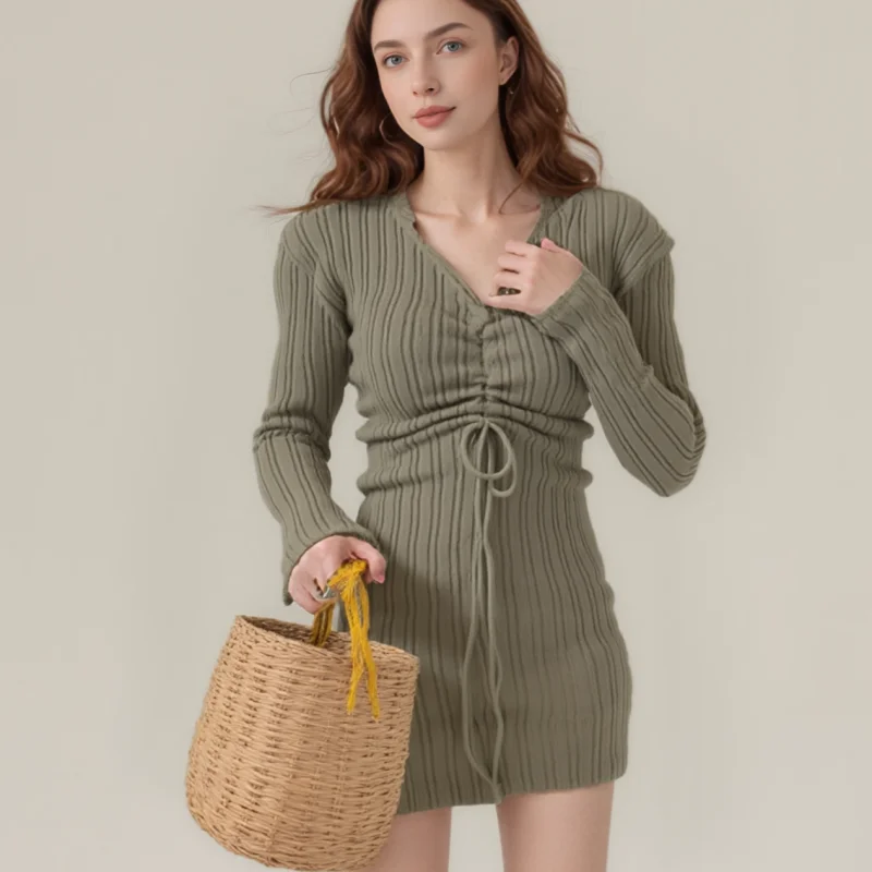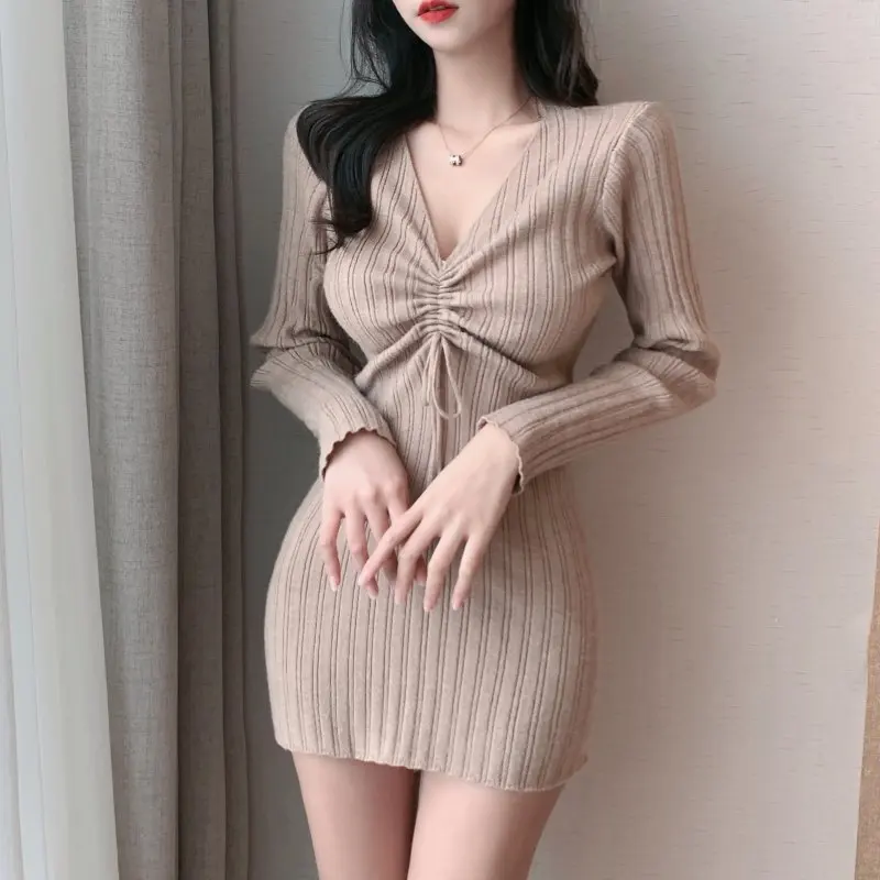 Mini abito lavorato a maglia tinta unita con coulisse e scollo a V primaverile Autunno Abiti da donna slim fit sexy Autunno Elegante maglieria