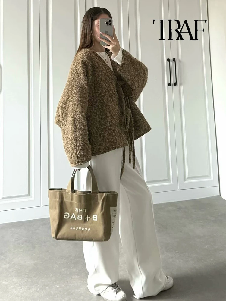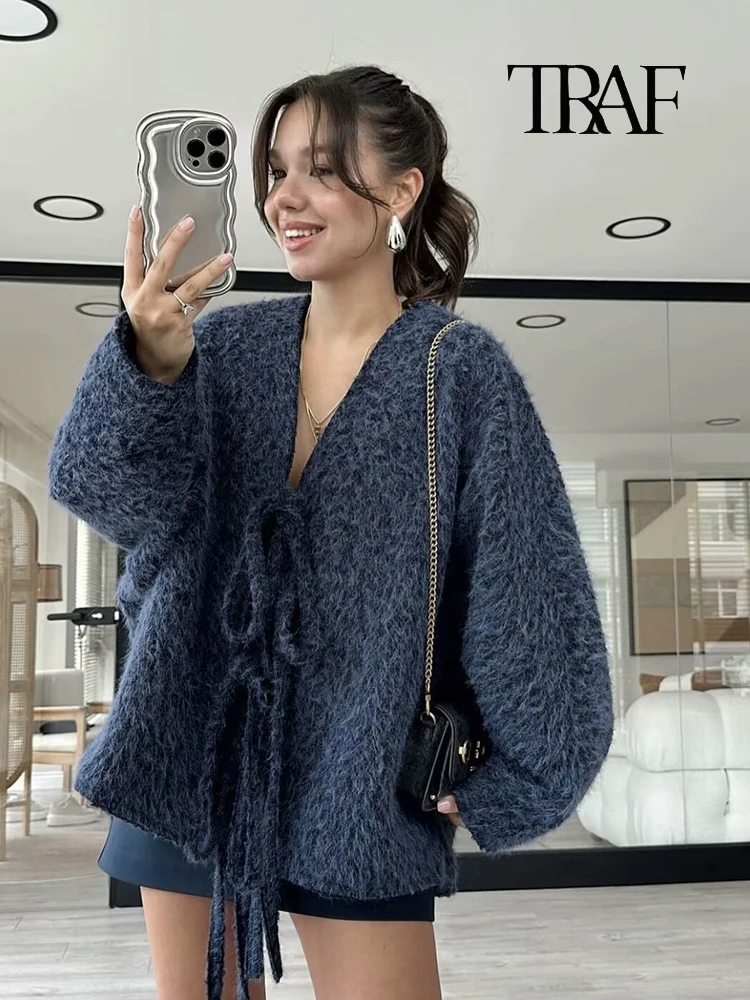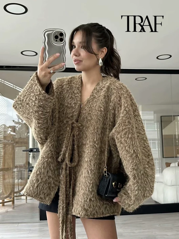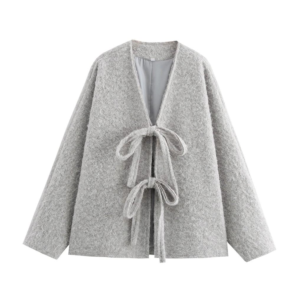 Moda Donna Cardigan a Maglia Casual Autunno e Inverno Allentato Tinta Unita Scollo a V Cravatta Cappotto Retrò Manica Lunga Giacca Pendolare