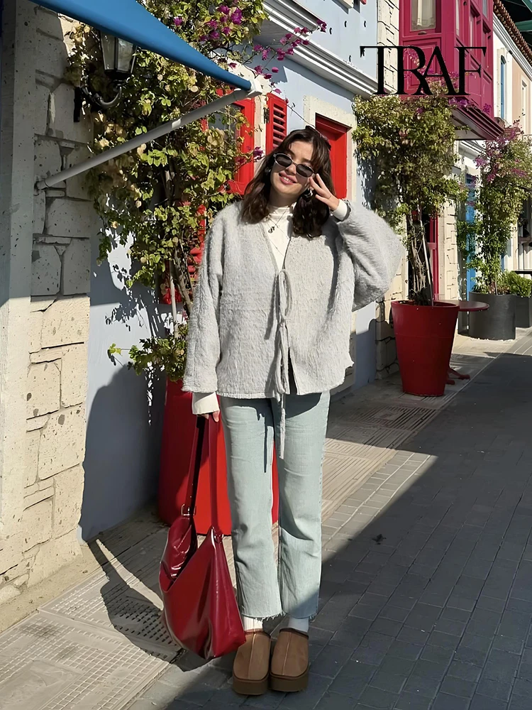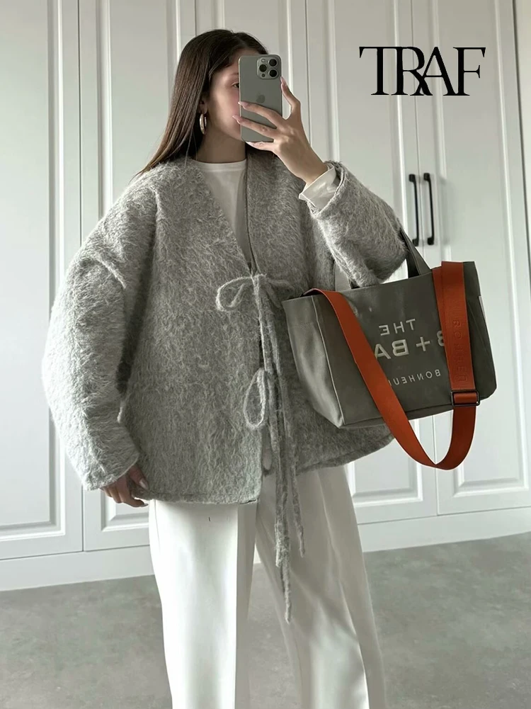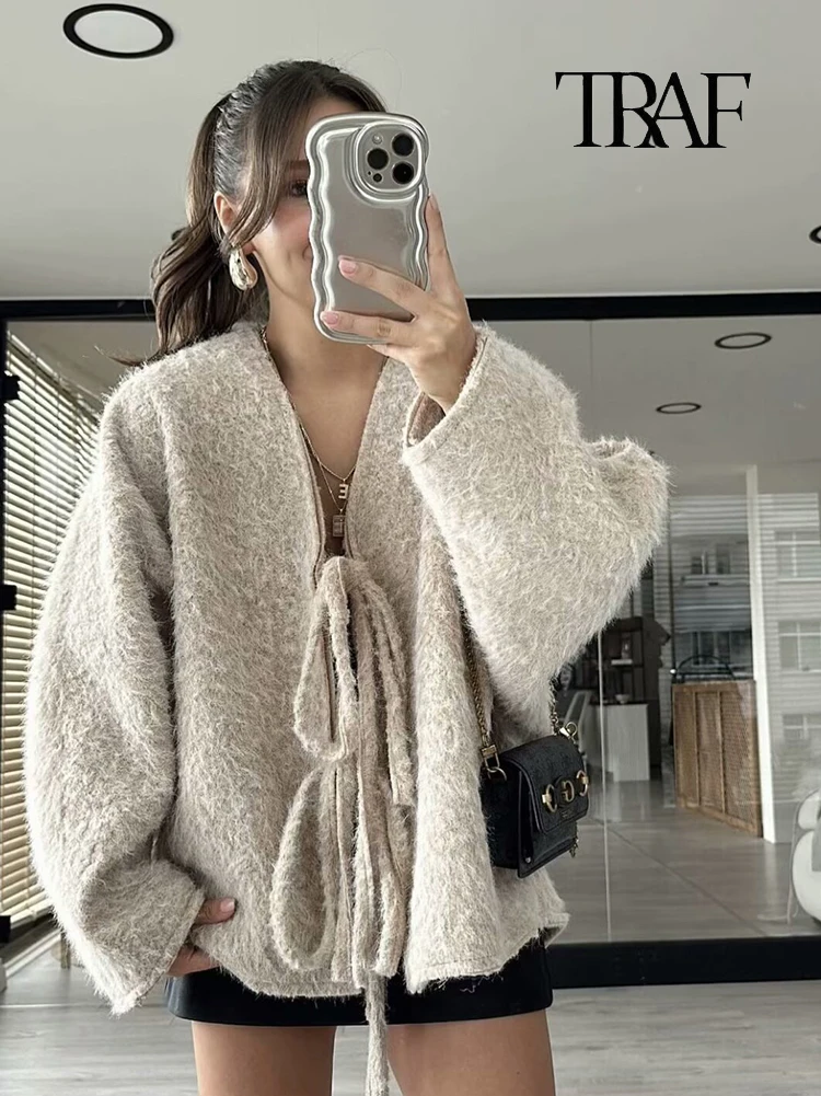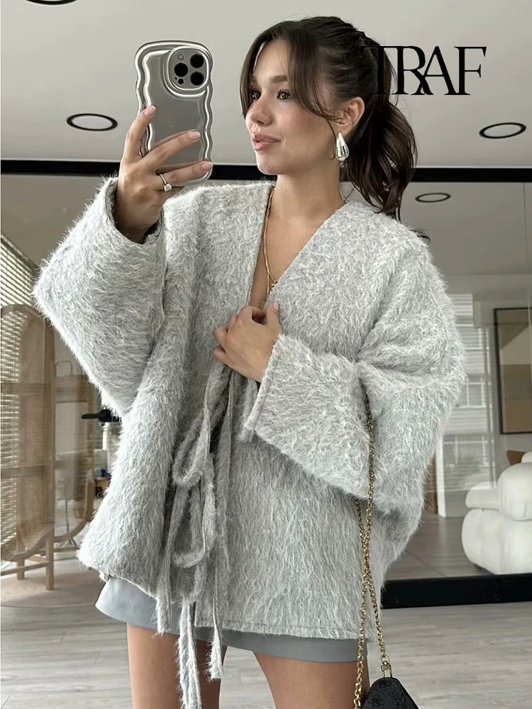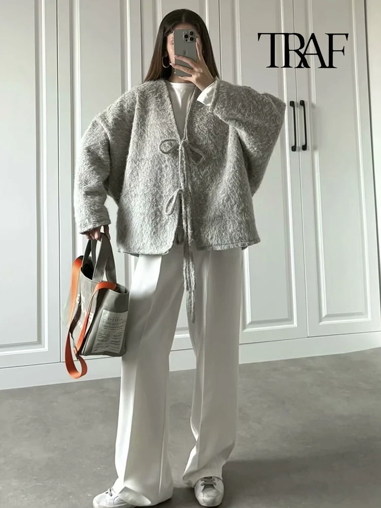 Moda Donna Cardigan a Maglia Casual Autunno e Inverno Allentato Tinta Unita Scollo a V Cravatta Cappotto Retrò Manica Lunga Giacca Pendolare