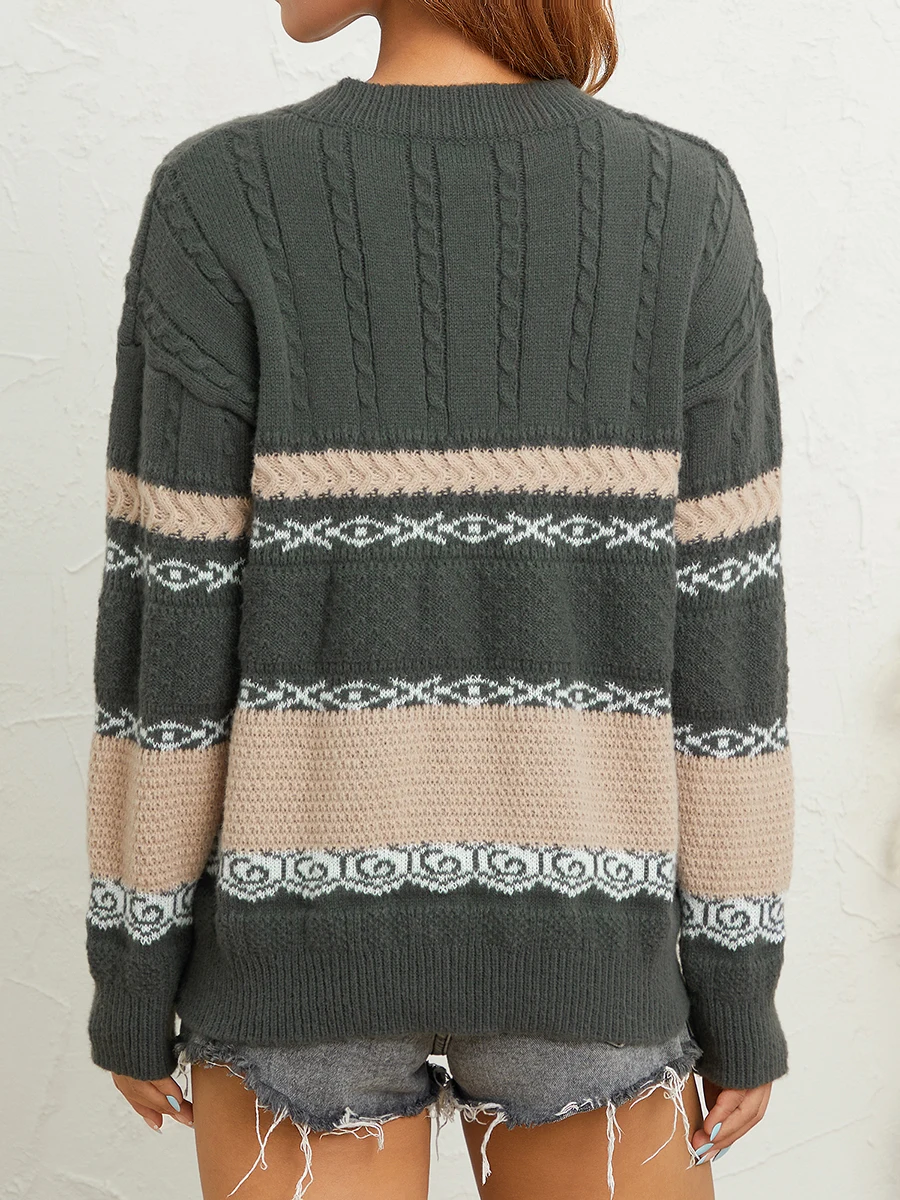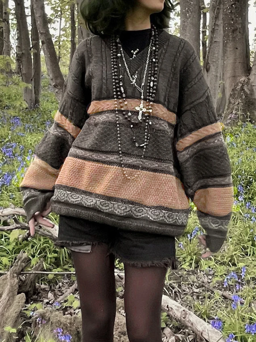 Moda donna maglione selvaggio a righe Patchwork scollo a v manica lunga oversize lavorato a maglia top autunno inverno Casual pullover larghi