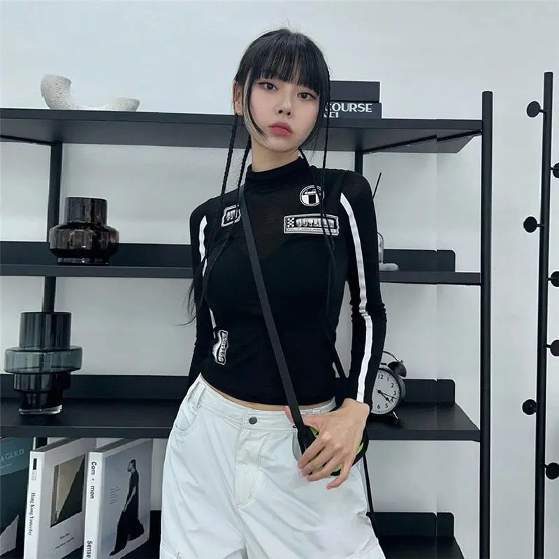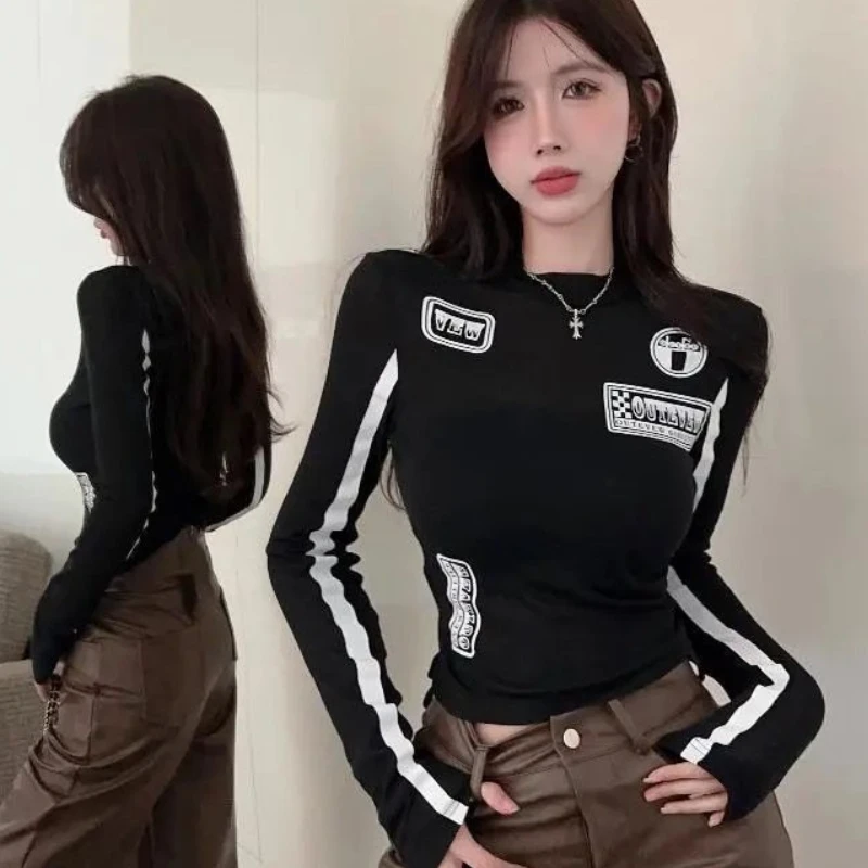 Moda Donna T-shirt Y2k Top 2025 Ropa Mujer O-Collo Manica lunga Tunica Tees Casual Coreano Camisetas Lettera Nero Crop Magliette