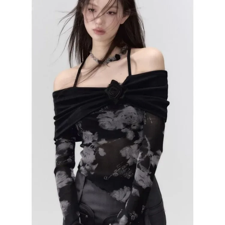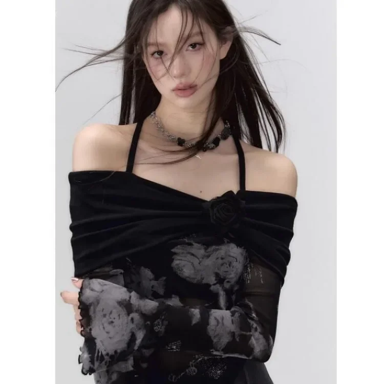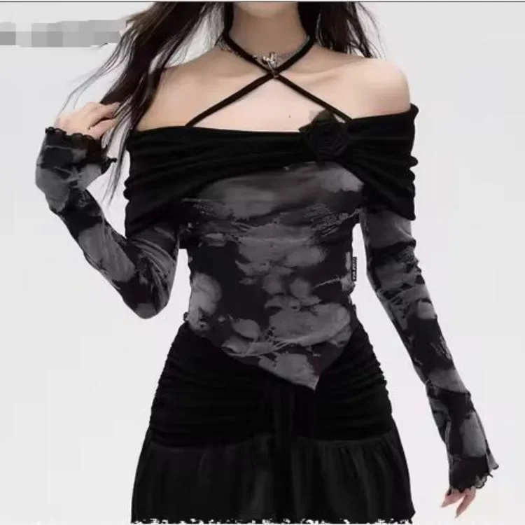 Nero falso due pezzi con spalle scoperte top donna autunno New Slim Fit Halter Print Tee Shirt Y2k E-Girl t-Shirt a maniche lunghe