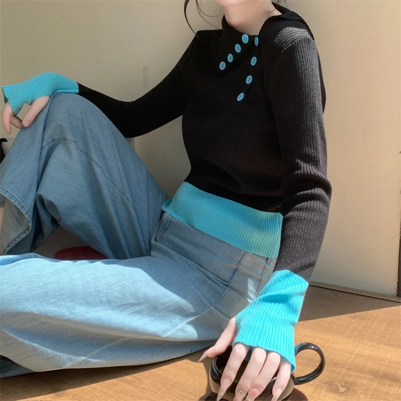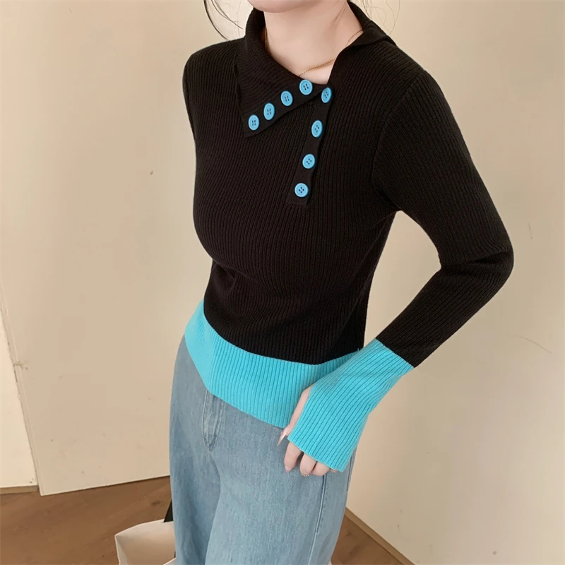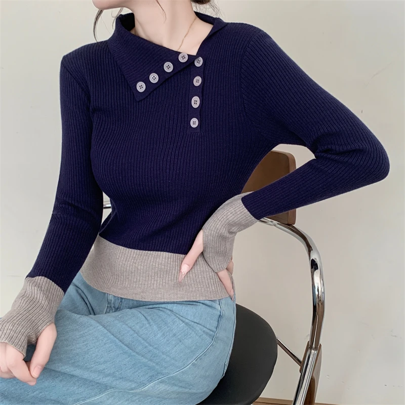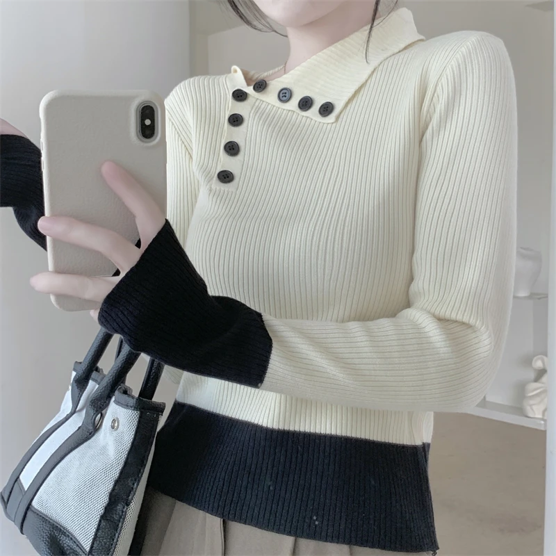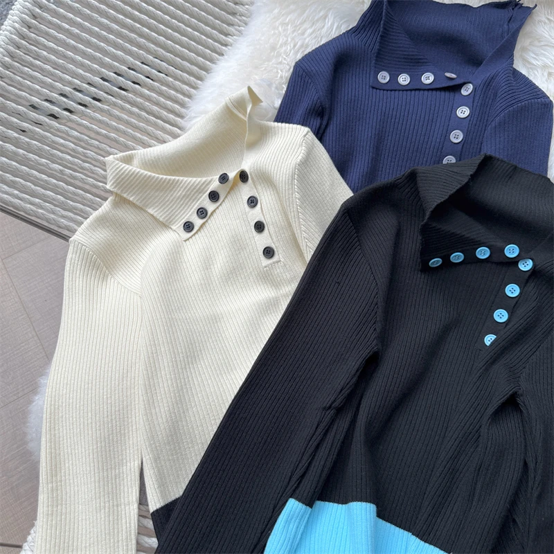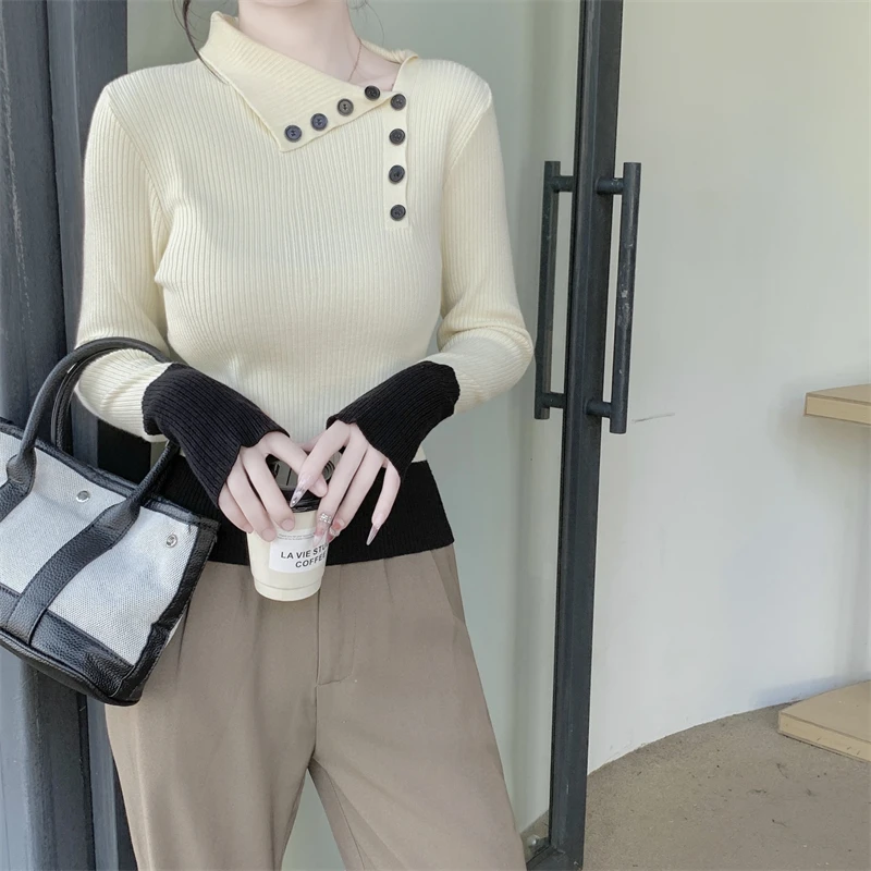Nuovi arrivi inverno autunno donna T-shirt in maglia maniche logn con fori per le dita slim fit colletto bia bottoni decorativi top da donna