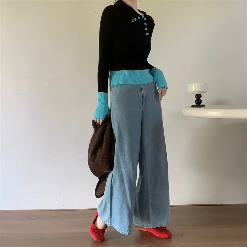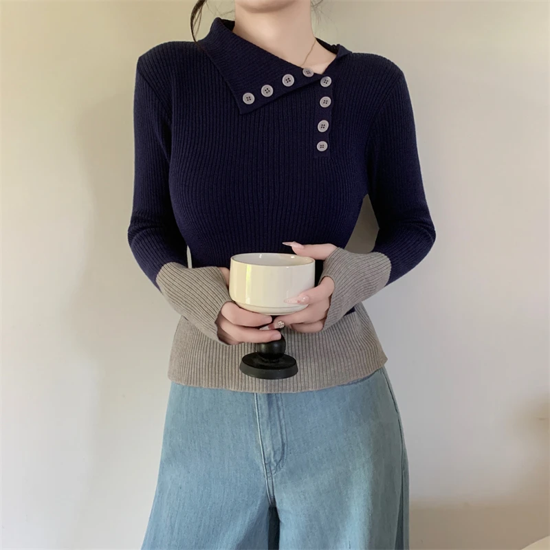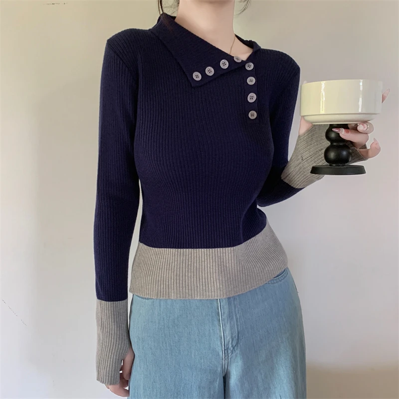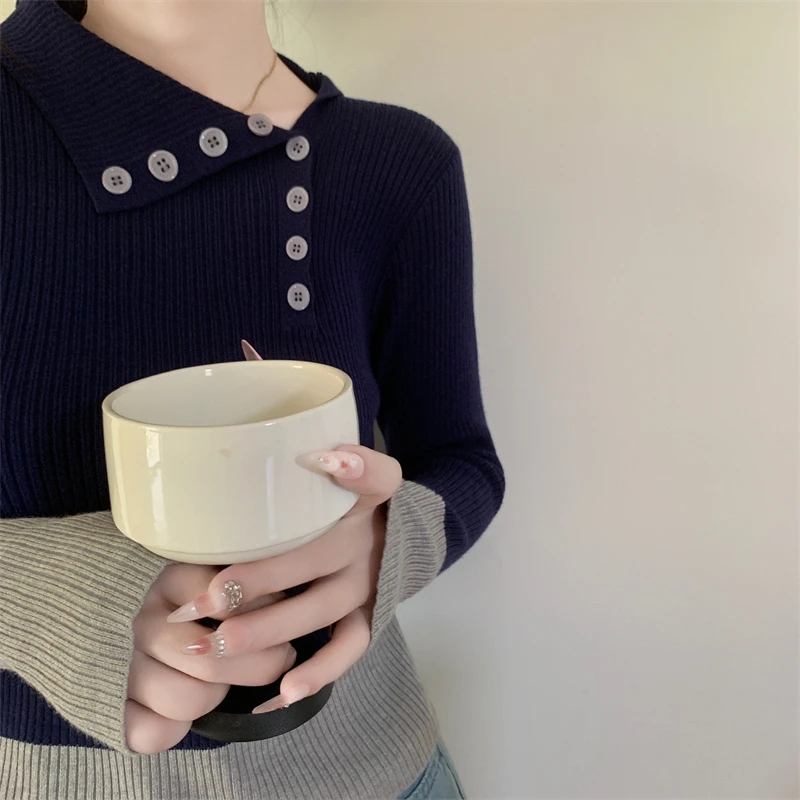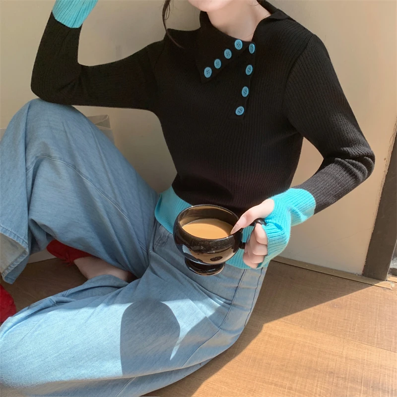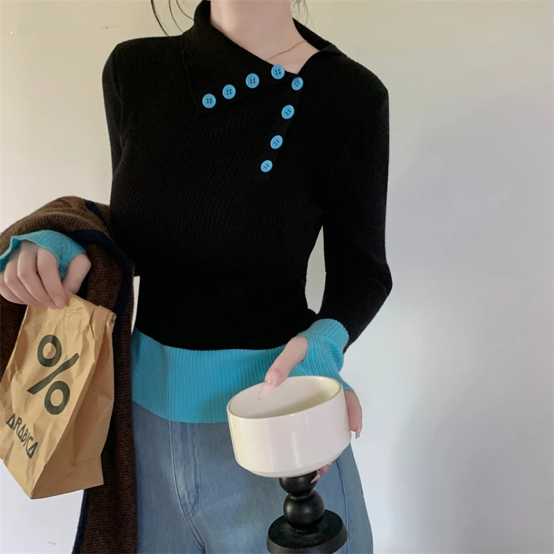 Nuovi arrivi inverno autunno donna T-shirt in maglia maniche logn con fori per le dita slim fit colletto bia bottoni decorativi top da donna